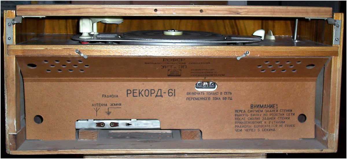 Радиола 3-го класса *Рекорд-61М2* с 1962 года выпускалась Иркутским заводом радиоприёмников. Радиола создана на основе модели **Рекорд-61** Бердского радиозавода. В новой радиоле изменена шкала, применён печатный монтаж и клавишный переключатель. В радиолу установлен новый громкоговоритель 2ГД-8, усовершенствована схема, изменено шасси. Диапазоны рабочих частот: ДВ, СВ и КВ - 3,95...12,1 МГц (75,9...24,8 м). ПЧ = 465 кГц. Чувствительность в диапазонах ДВ, СВ 200 мкВ, на КВ 300 мкВ. Избирательность по соседнему каналу 26 дБ. Номинальная выходная мощность 0,5 Вт. Полоса воспроизводимых частот при приёме 150...3500 Гц, при воспроизведении грамзаписи 150...6000 Гц. Потребляемая мощность при приёме 40 Вт, при воспроизведении грамзаписи около 55 Вт. Габариты радиолы - 600х320х270 мм. Масса 13 кг. Бердский радиозавод с 1962 года малосерийно выпускал такую же радиолу, но ещё под старым наименованием *Рекорд-61*.