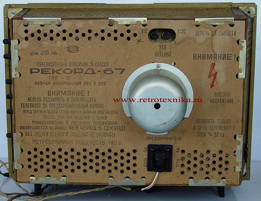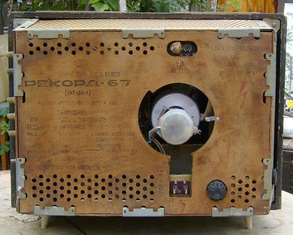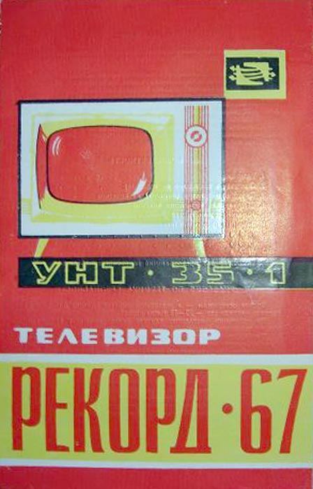 Телевизионный приёмник ч/б изображения *Рекорд-67* с 1967 года выпускал Воронежский завод *Электросигнал*. Унифицированный телевизор 3-го класса *Рекорд-67* (УНТ-35-1) предназначен для приёма программ на любом из 12 каналов МВ диапазона. В телевизоре установлен кинескоп типа 35ЛК6Б с укороченной горловиной и повышенными светотехническими параметрами. В отличии от моделей УНТ-35 введён разъём для подключения приставки двух-речевого сопровождения. Некоторые изменения введены и в электрическую схему. Размер видимого изображения 217х288 мм. В телевизоре применено 14 радиоламп и 14 диодов. Чувствительность телевизора - 200 мкВ. Габариты модели - 480х380х510 мм. Масса - 21 кг. Цена - 215 рублей.
