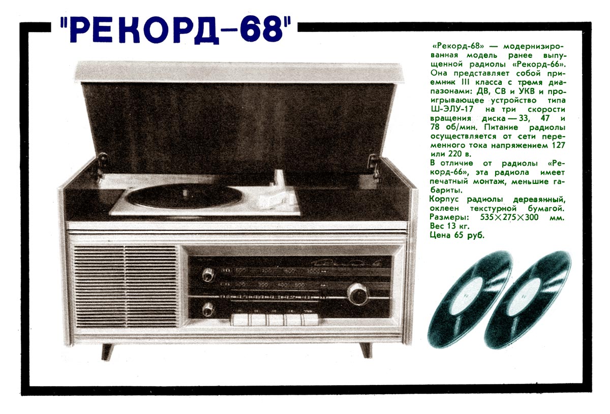 Радиола сетевая ламповая *Рекорд-68* в 1968 году выпускалась Бердским радиозаводом. Редкая радиола по наименованию радиола *Рекорд-68* производилась 8 месяцев, после чего заменена на модель **Рекорд-68-2**. Радиола *Рекорд-68* состоит из 5-ти лампового приёмника 3-го класса и универсального ЭПУ типа III-ЭПУ-17 или II-ЭПУ-40. Радиола работает в диапазонах ДВ, СВ и УКВ. Чувствительность приёмника в диапазонах ДВ, СВ 200 мкВ, УКВ 30 мкВ. Номинальная выходная мощность 0,5 Вт, максимальная 1 Вт. Диапазон воспроизводимых звуковых частот в тракте AM - 150...3500 Гц, ЧМ - 125...7500 Гц. Громкоговоритель 2ГД-19М. Питание радиолы осуществляется от сети 127 или 220 В. Потребляемая мощность при приёме 60 Вт, воспроизведении грамзаписи 75 Вт. Габариты радиолы 535х275х255 мм. Вес 13 кг. В радиоле в отличии от 2-й модели, 2-я клавиша включала внешний магнитофон, а клавиши ДВ, СВ были сдвинуты к клавише УКВ. Заводом было выпущено около 10 тысяч радиол *Рекорд-68*.