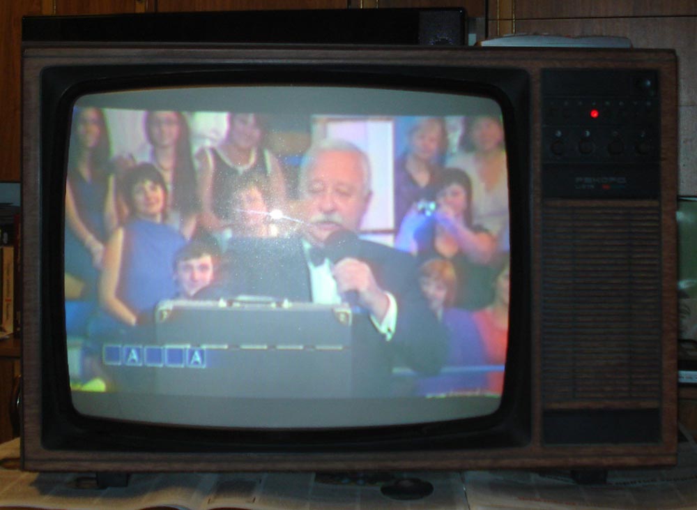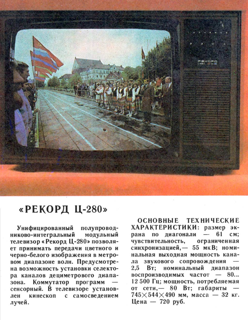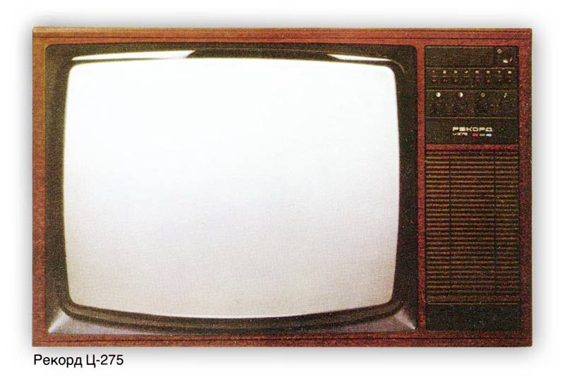 Цветные телевизоры *Рекорд Ц-275/Д* и *Рекорд Ц-280/ДП* с 1984 и 1986 года выпускал *Александровский радиозавод*. Унифицированные модульные на интегральных элементах телевизоры типа **3УСЦТ-61** предназначены для приёма цветных телевизионных програм на любом из каналов МВ и ДМВ диапазона (индекс Д). При отсутствии индекса Д, есть возможность установки селектора ДМВ. В моделях применён сенсорный кнопочный коммутатор на восемь телевизионных программ и кинескоп с самосведением. Диагональ экрана 61 см. Чувствительность моделей в диапазоне МВ - 40 мкВ, в ДМВ - 70 мкВ. Номинальная выходная мощность канала звука 2,5 Вт. Диапазон воспроизводимых звуковых частот - 80..12500 Гц. Имеются гнёзда для подключения магнитофона на запись и головных телефонов для прослушивания звукового сопровождения программ. Корпус любого из телевизоров сделан из древесно-стружечной плиты и облицован декоративной отделочной плёнкой или пенополиуретаном с окраской под ценные породы древесины. Потребляемая мощность 80 Вт. Габариты телевизора 745 х 544 х 490 мм. Масса 32 кг. Цена 720 рублей. Телевизор **Рекорд Ц-280ДП** работает в системах СЕКАМ и ПАЛ. По оформлению все модели аналогичны.