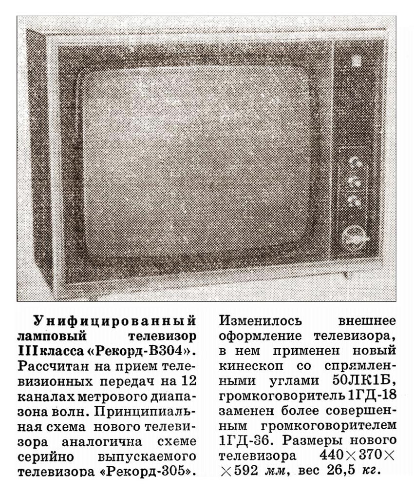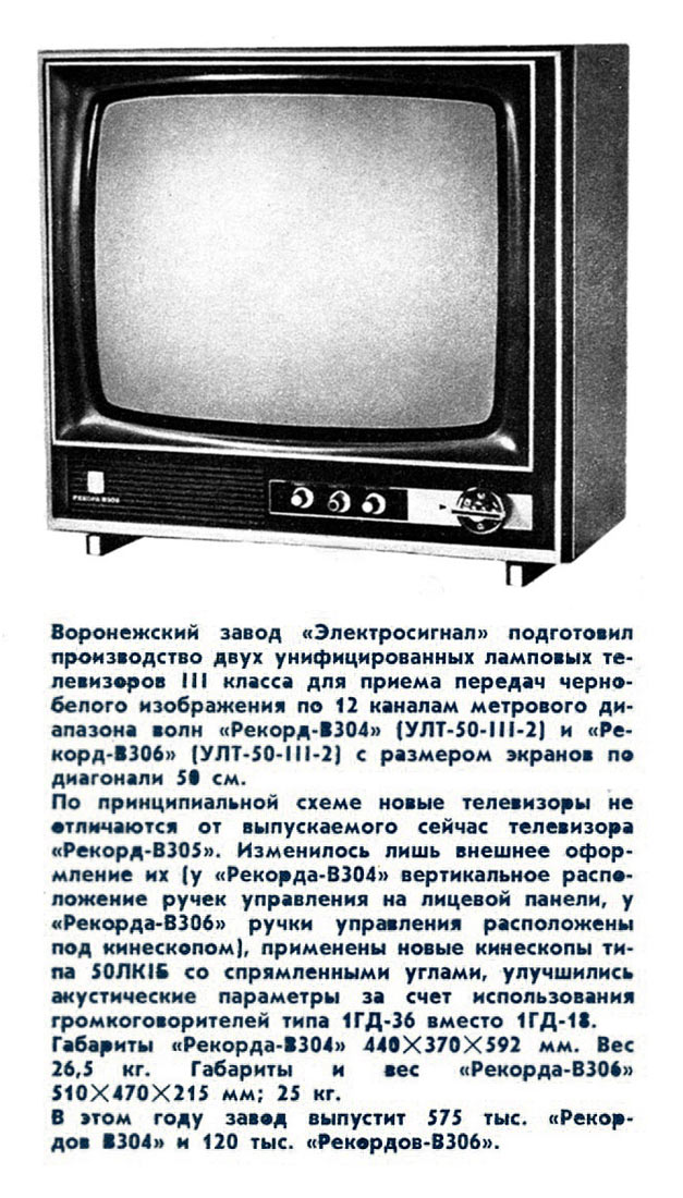 Телевизионный приёмник чёрно-белого изображения *Рекорд В-302* с 1970 года выпускал Воронежский завод *Электросигнал*. Ламповый унифицированный ламповый настольный телевизор 3-го класса **Рекорд В-302** (УЛТ-50-III-2) рассчитан на приём телевизионных программ в любом из 12-ти каналов МВ диапазона. Схема телевизора аналогична телевизору **Рекорд В-301**, но оформление здесь другое. Телевизоры выпускали одновременно. В телевизоре применён кинескоп со спрямленными углами 50ЛК1Б, 16 ламп, 15 диодов, громкоговоритель 1ГД-18, позднее 1ГД-36. Габариты телевизора 595х440х365 мм, масса 27 кг. Цена 236 рублей. С начала 1971 года завод выпускал аналогичный по конструкции, электрической схеме и внешнему оформлению телевизор *Рекорд В-304*. Небольшая партия телевизоров *Рекорд В-304* носила наименование *Рекорд В-311*. Зачем это было сделано - неизвестно, очередной телевизор *Рекорд В-310* был выпущен лишь в 1974 году.