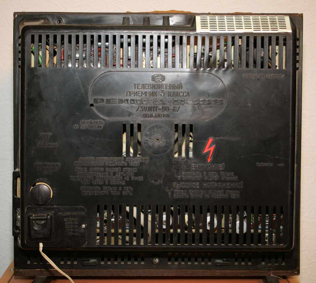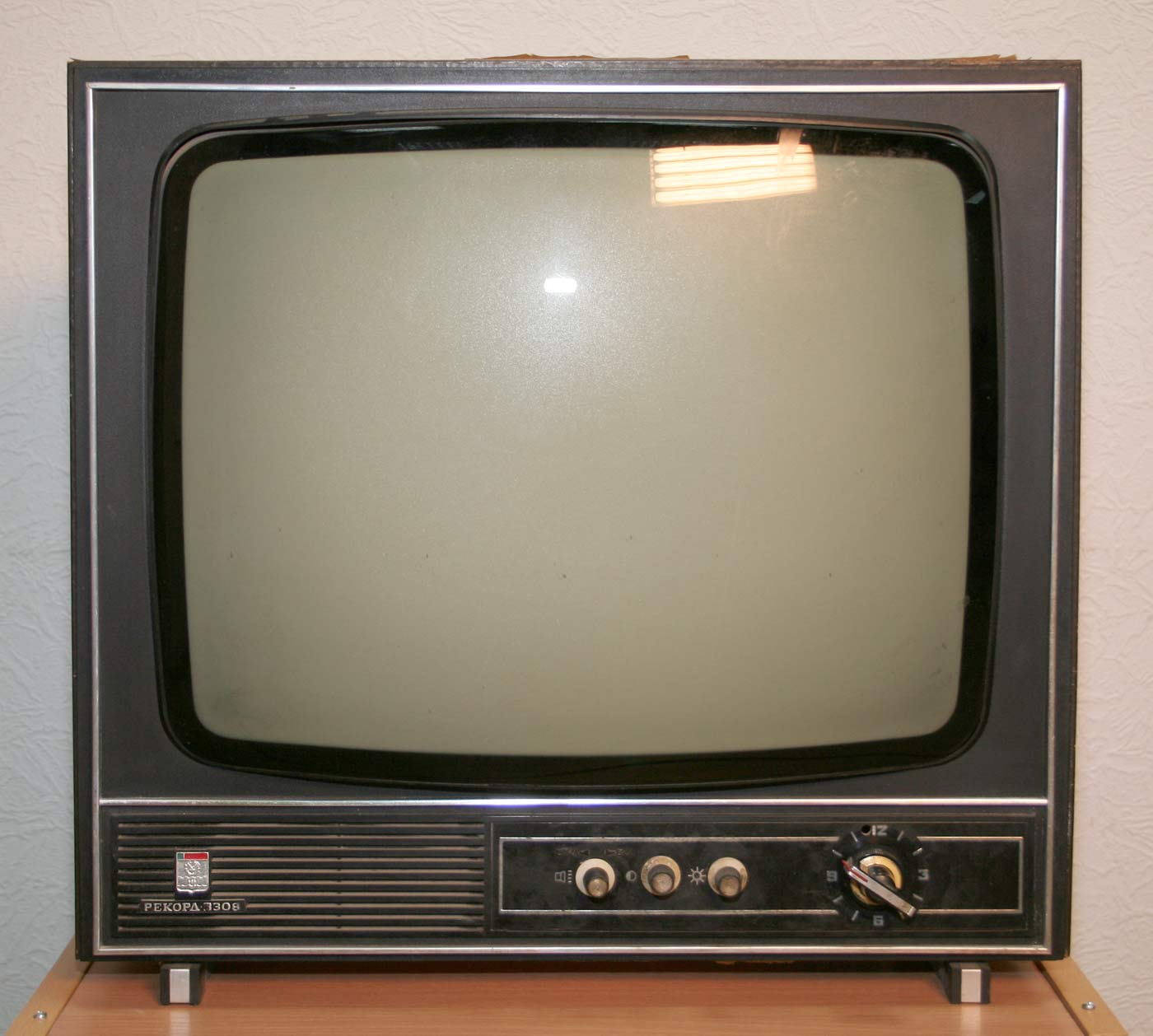 Телевизионный приёмник чёрно-белого изображения *Рекорд В-308* с начала 1974 года выпускал Воронежский завод *Электросигнал*. **Рекорд В-308** (3-УЛПТ-50-III) - унифицированный сетевой лампово-полупроводниковый чёрно-белый телевизор третьего класса настольного оформления. В телевизоре применён взрывозащищённый кинескоп с размерами экрана по диагонали 50 сантиметров. Телевизор предназначен для приёма передач на любом из 12 каналов МВ диапазона. Совершенство электронных устройств и элементов, примененных в схеме аппарата а также системы автоматического контроля основных рабочих параметров телевизора гарантируют очень качественное изображение и приближённый к естественному звук. В телевизоре имеются гнёзда для подключения головных телефонов, с автоматическим отключением громкоговорителя аппарата. Основные характеристики Производитель: Воронежский завод «Электросигнал». Год начала выпуска: 1974 год. Тип: Сетевой лампово-полупроводниковый, чёрно-белый, 3-го класса. Кинескоп: Взрывозащищённый, 50 см по диагонали. Диапазон: 12 каналов МВ. Электроника: Высококачественная, с тремя системами автоматического контроля. Изображение: 308х394 мм. Чувствительность: 110 мкВ. Звук: Полоса частот 125–7100 Гц, номинальная выходная мощность 0,5 Вт. Питание: От сети. Потребляемая мощность: 155 Вт. Габариты: 500 x 520 x 360 мм. Масса: 29 кг.