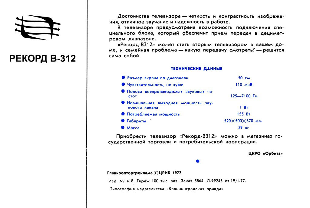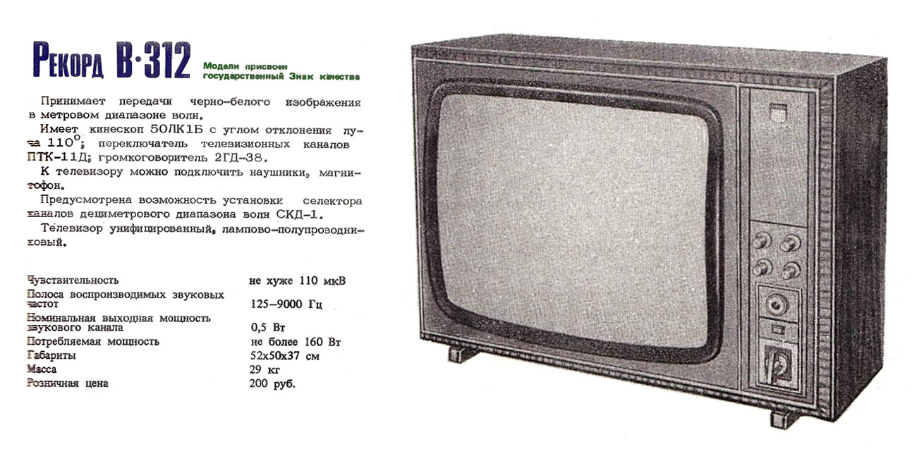 Телевизионный приёмник ч/б изображения *Рекорд В-312* с 1975 года выпускал Воронежский завод *Электросигнал*. Телевизор выполнен по унификации 3УЛПТ-50-III-1 и имеет соответствующие параметры. ТВ выпускался в настольном варианте с глянцевой отделкой под дерево и с покрытием текстурной бумагой. Начальная цена телевизора 235 руб., в 1978 году снижена до 200 руб. По числу производимых и покупаемых телевизор в своё время стал самым массовым в СССР. Технические параметры аппарата можно посмотреть в его инструкции по эксплуатации.