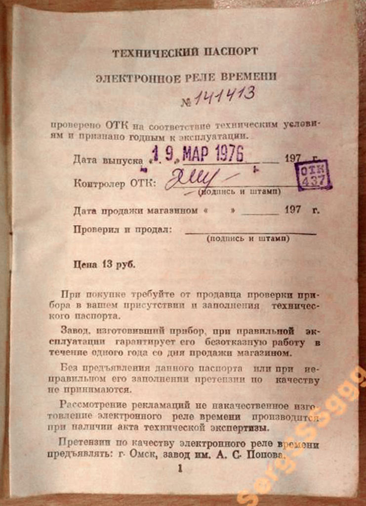 Реле времени электронное (без названия) выпускалось предположительно с 1971 года Омским заводом имени А.С.Попова.