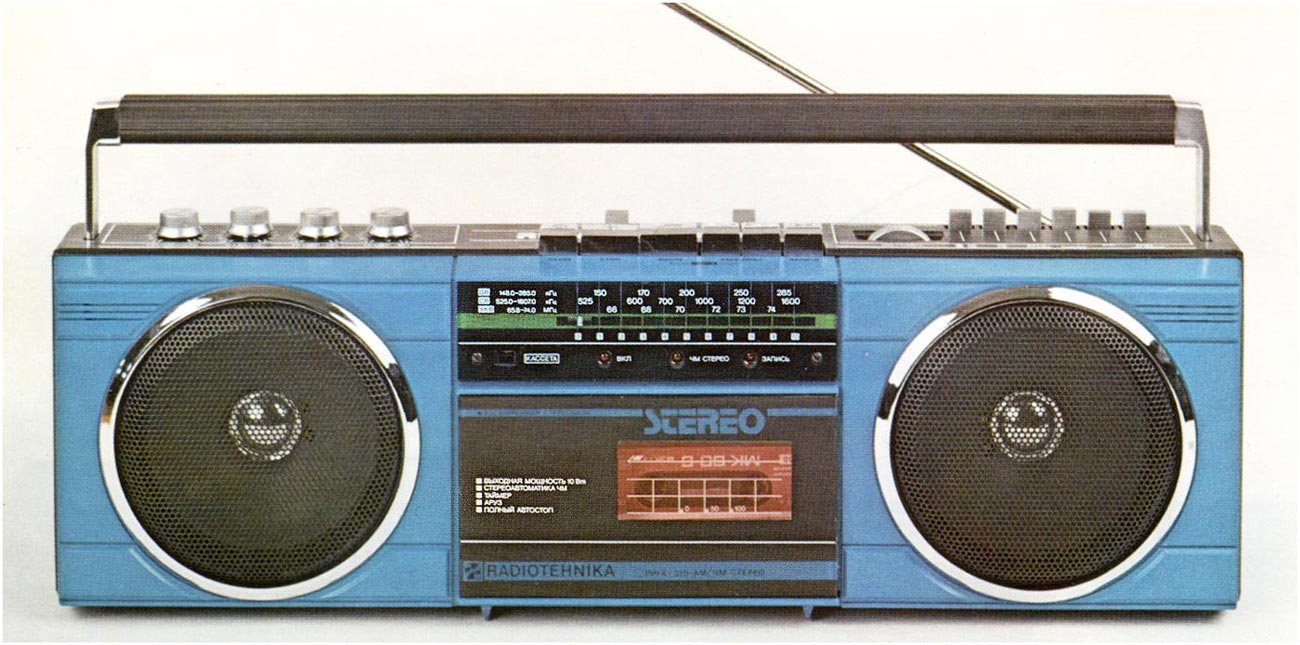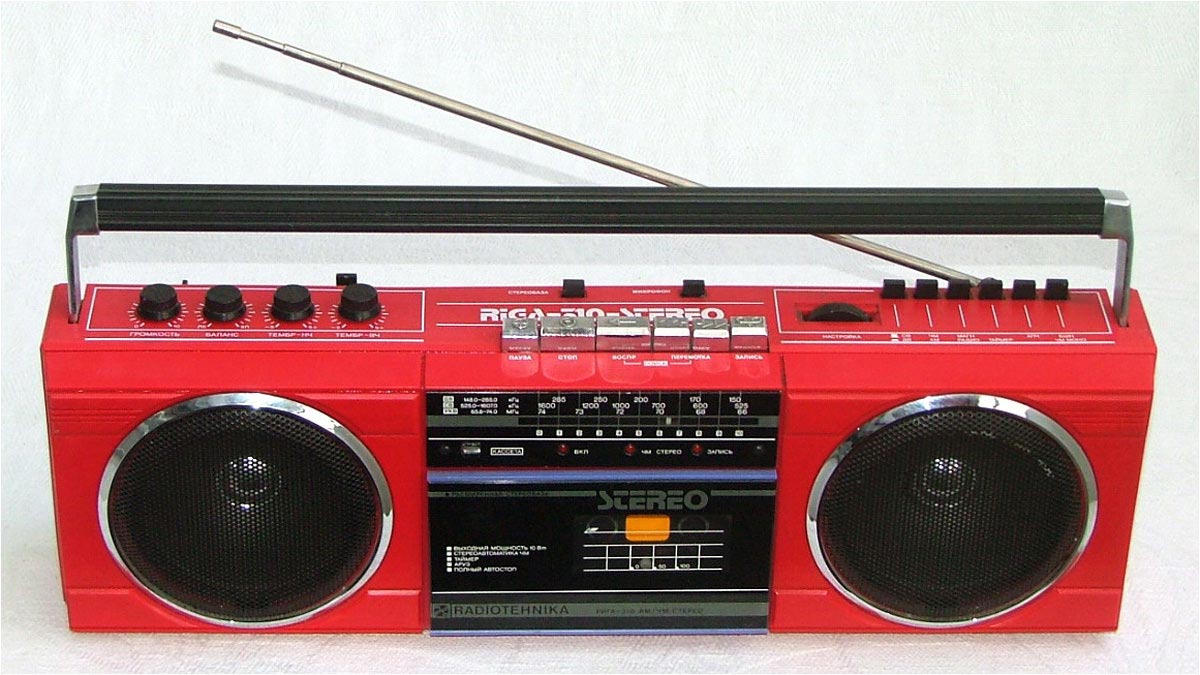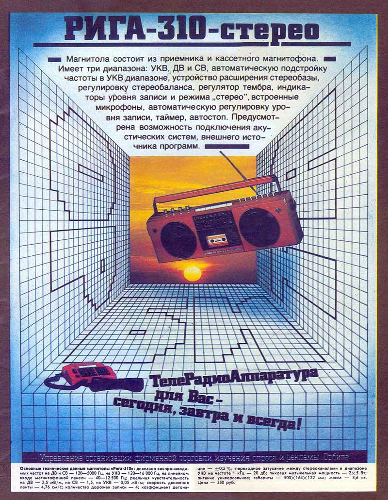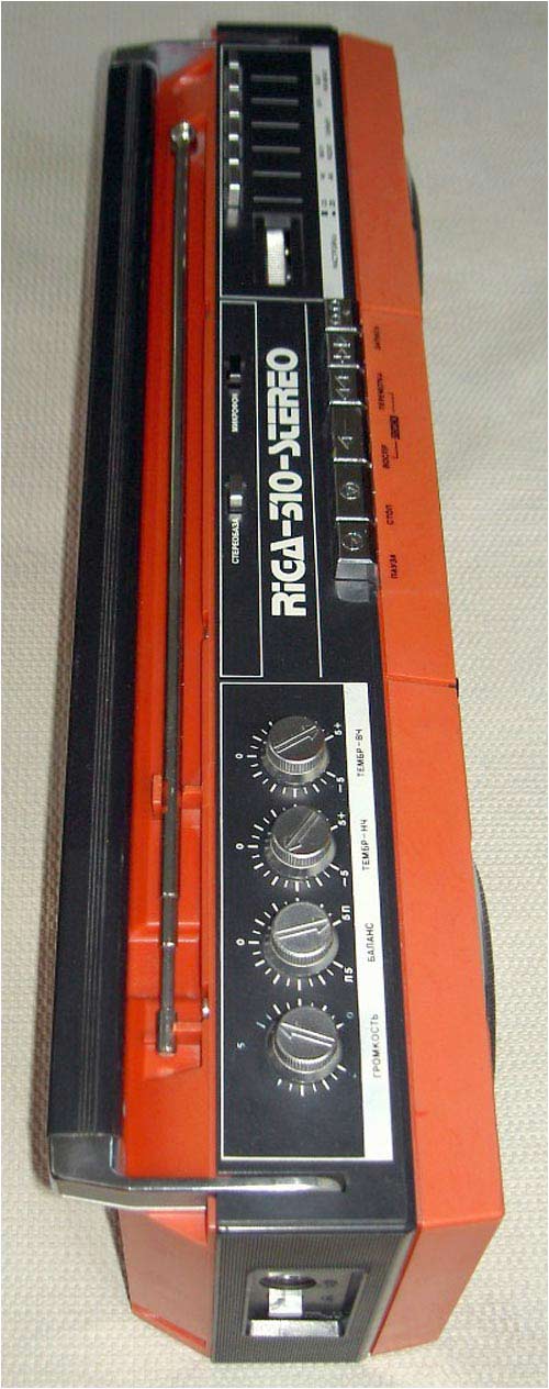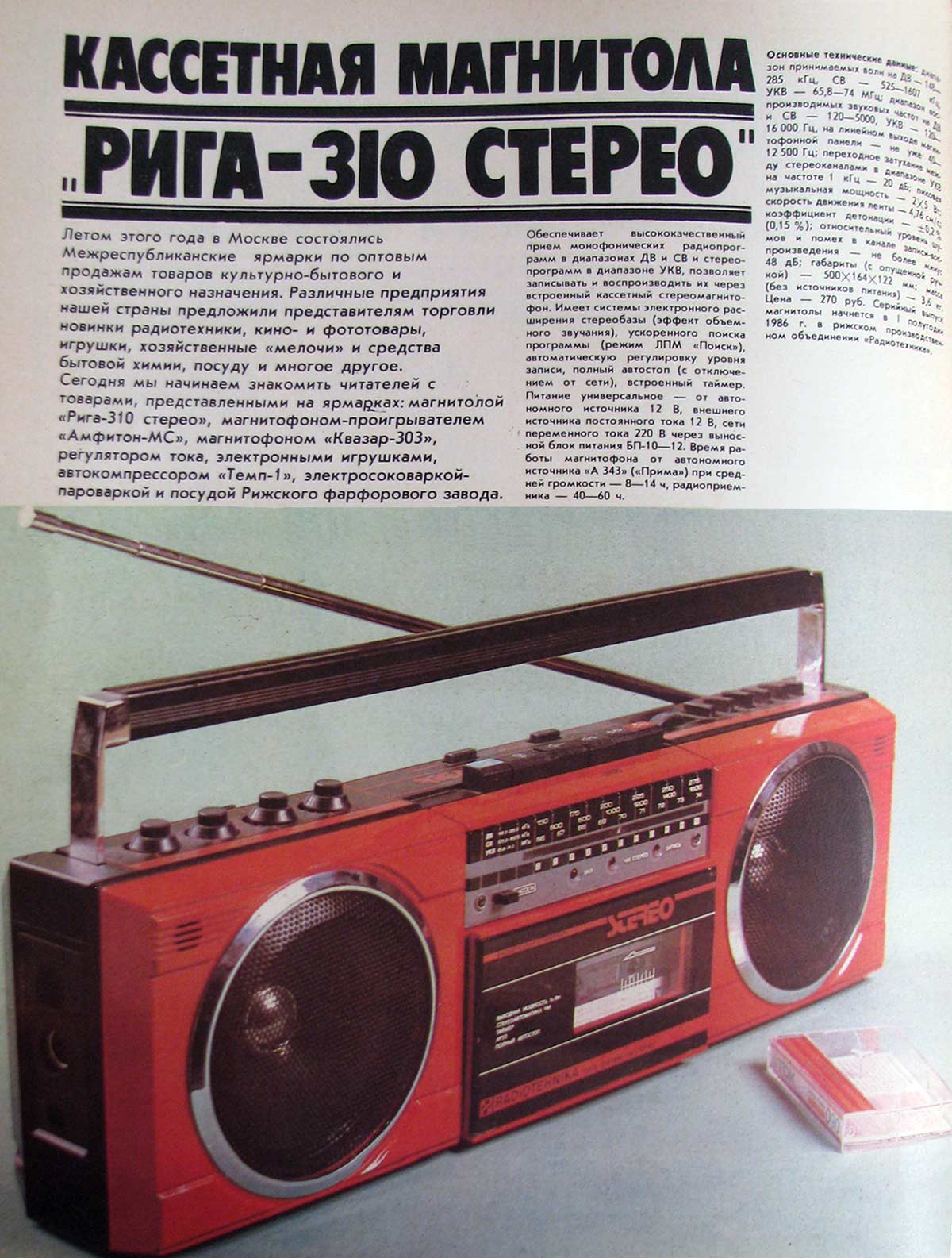 Портативная кассетная магнитола *Рига-310-стерео* с 1986 года выпускалась Рижским ПО *Радиотехника*. Она объединяет ДВ, СВ, УКВ-ЧМ радиоприёмник и кассетный магнитофон на базе ЛПМ производства ВНР. Это первая в CCCР модель третьей группы сложности, где имеется АРУЗ, электрическое расширение стереобазы, полный автостоп с отключением питания, режим ускоренного поиска по фрагментам записи; таймер позволяющий программировать выключение магнитолы через нужное время. Музыкальная мощность 2х5 Вт, полоса рабочих частот AM тракта: 120...5000 Гц, ЧМ 120...16000 Гц, записи 40...12500 Гц, коэффициент детонации ±0,2%. Габариты МЛ - 500х164х122 мм, вес 3,6 кг.