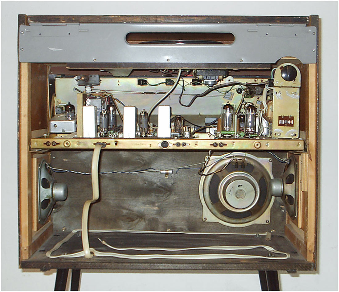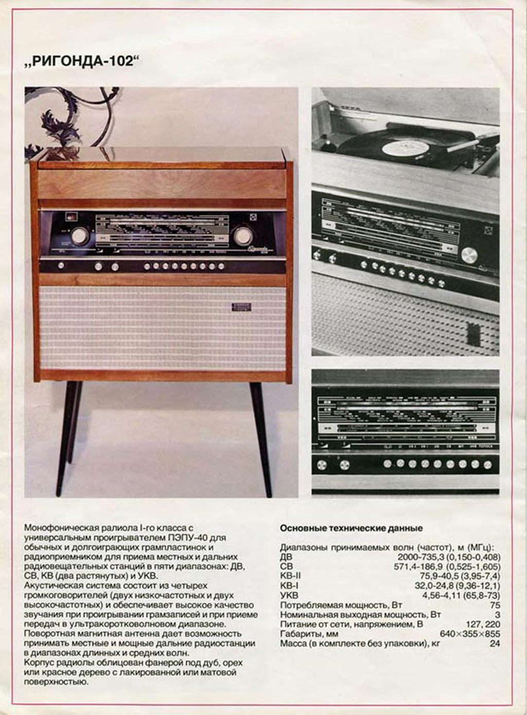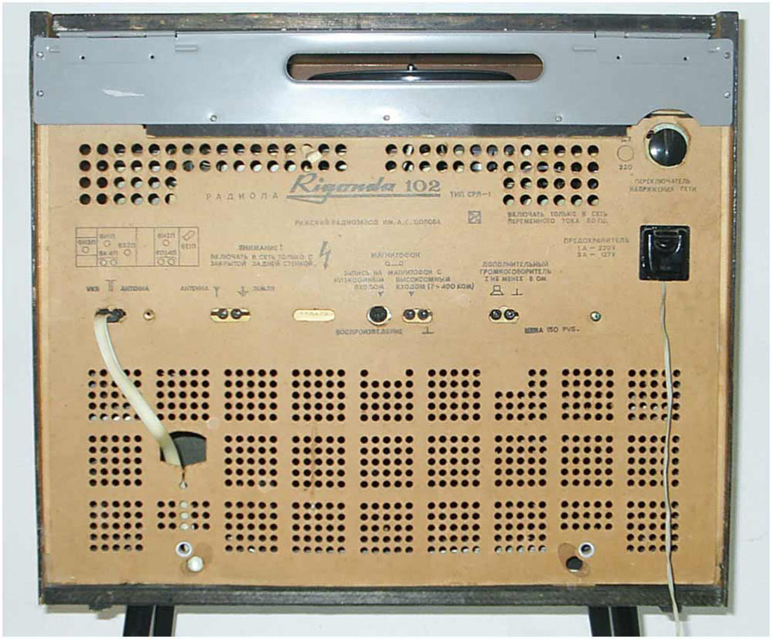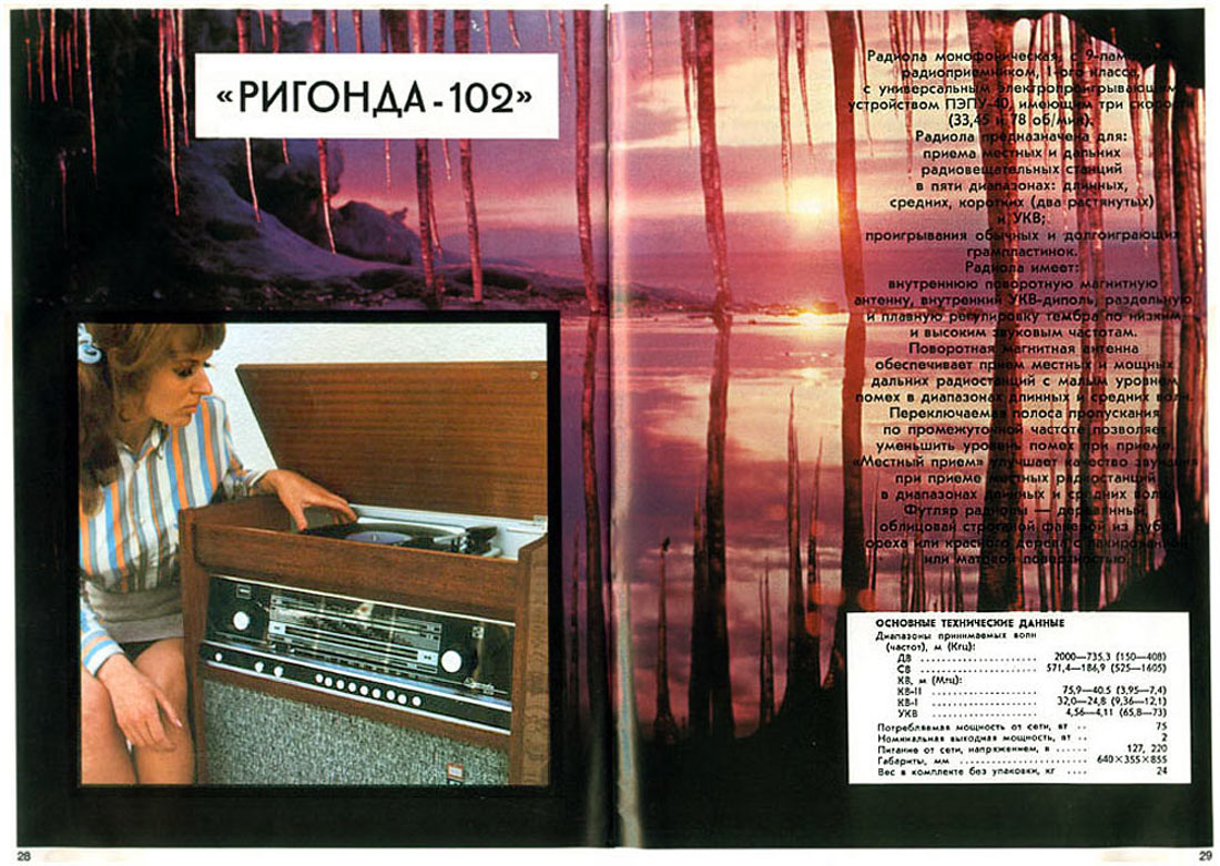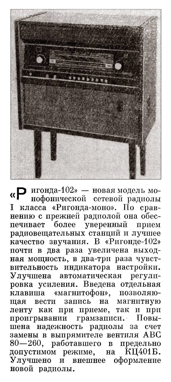 Радиола сетевая ламповая *Ригонда-102* с 1970 года выпускалась Рижским радиозаводом имени А.С.Попова. Монофоническая сетевая радиола 1-го класса **Ригонда-102** заменила радиолу **Ригонда-Моно**. В сравнении с прежней, она обеспечивает более уверенный приём и лучшее качество звука. В радиоле **Ригонда-102** почти в 2 раза увеличена выходная мощность, в 2-3 раза чувствительность индикатора настройки. Улучшена АРУ. Введена отдельная клавиша магнитофон, позволяющая вести запись на магнитную ленту при приёме и при проигрывании грамзаписи. Повышена надёжность заменой выпрямителя ABС-80х260 работавшего в предельном режиме, на сборку КЦ-401Б. Улучшено оформление радиолы. По другим параметрам радиола аналогична прежней модели, радиоле **Ригонда-моно**. Цена новой радиолы 150 рублей. Приёмник радиолы **Ригонда-102** рассчитан на приём передач радиостанций, работающих в диапазонах ДВ - 150...408 кгц (200...735,3 м); СВ - 525...1605 кгц (571,4...186,9 м) двух коротковолновых КВ-2 3,95...7,4 Мгц (75,9...40,5 м), KB-1 9,36...12,1 Мгц (32,0...24,7 м), и УКВ - 65,8...73 Мгц (4,56...4,11 м) волн. Чувствительность приёмника в ДВ, СВ и КВ диапазонах 20...60 мкв, в УКВ-ЧМ диапазоне 3...6 мкв. Избирательность по соседнему каналу в АМ тракте - 66 дб. Номинальная выходная мощность радиолы 3 вт, максимальная 7...10 вт. Акустическая система радиолы состоит из четырех громкоговорителей: двух 4ГД-28 (позже заменённых одним 4ГД-35) и двух 1ГД-28 (позже 1ГД-36). Звуковое давление при номинальной мощности 1,6...1,8 н/м. Диапазон эффективно воспроизводимых звуковых частот для тракта AM - 60...6000 гц, ЧМ - 60...12000 гц. В радиоле установлено трехскоростное ЭПУ типа II-ЭПУ-40 (позже II-ЭПУ-50), рассчитанное на воспроизведение записи с обычных и долгоиграющих пластинок. Питается радиола от сети 220 или 127 в, её габариты без ножек - 640х355х550 мм, масса 24 кг. Набор радиоламп в радиоле: 6Н3П, 6И1П, 6К4П (2), 6Х2П, 6Н2П, 6П14П (2), 6Е1П. Радиолу **Ригонда-102** предполагалось выпускать ещё с 1968 года, но по различным причинам, выпуск был отложен. С начала выпуска радиола была по своему оформлению ближе к базовой модели, затем постепенно заменялась радиоткань, изменилось обрамление шкалы настройки, а в АС радиолы был убран один широкополосный громкоговоритель.