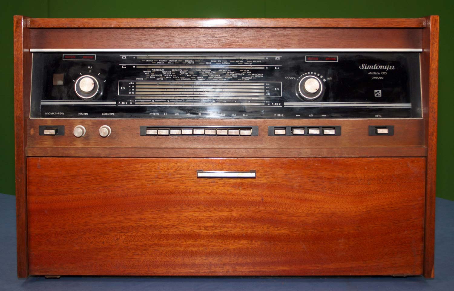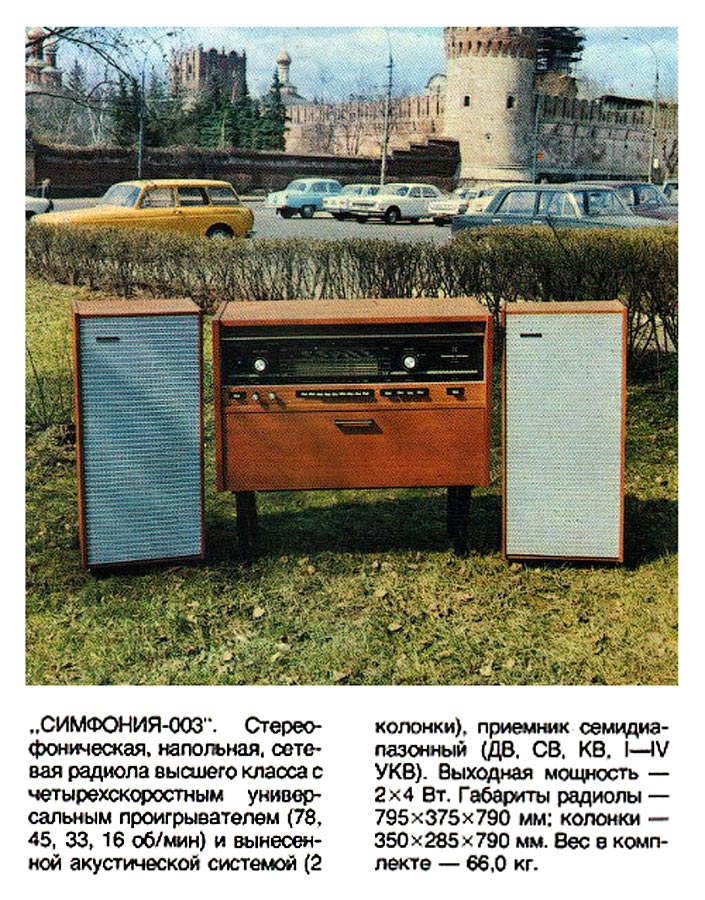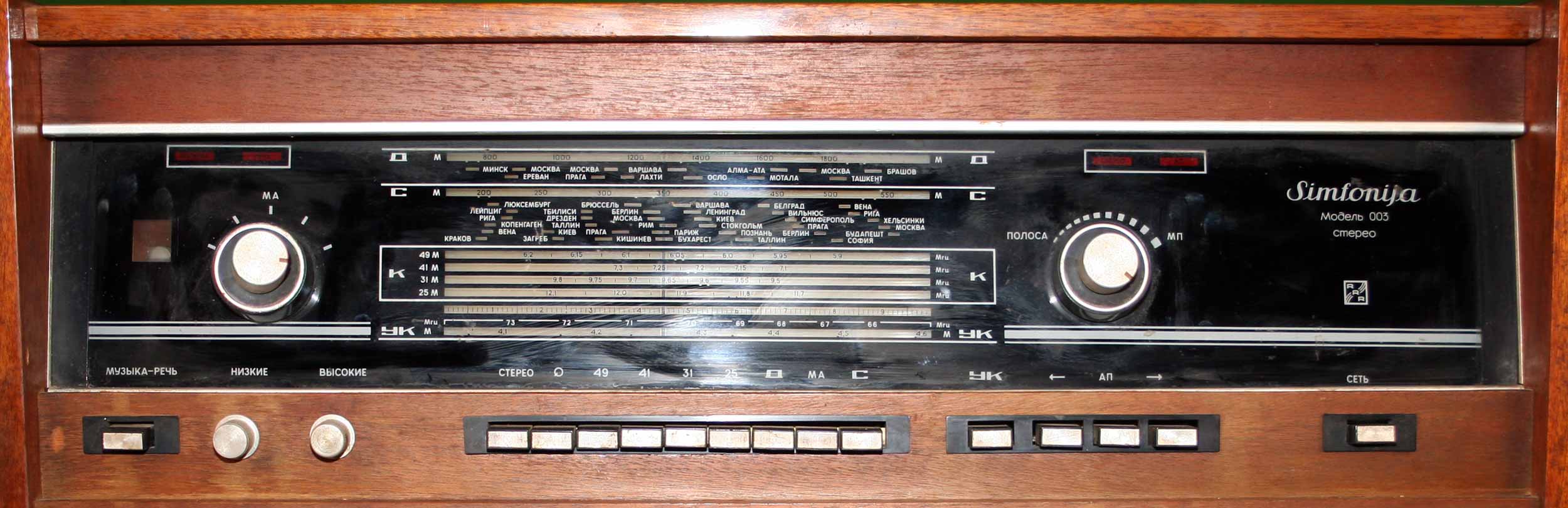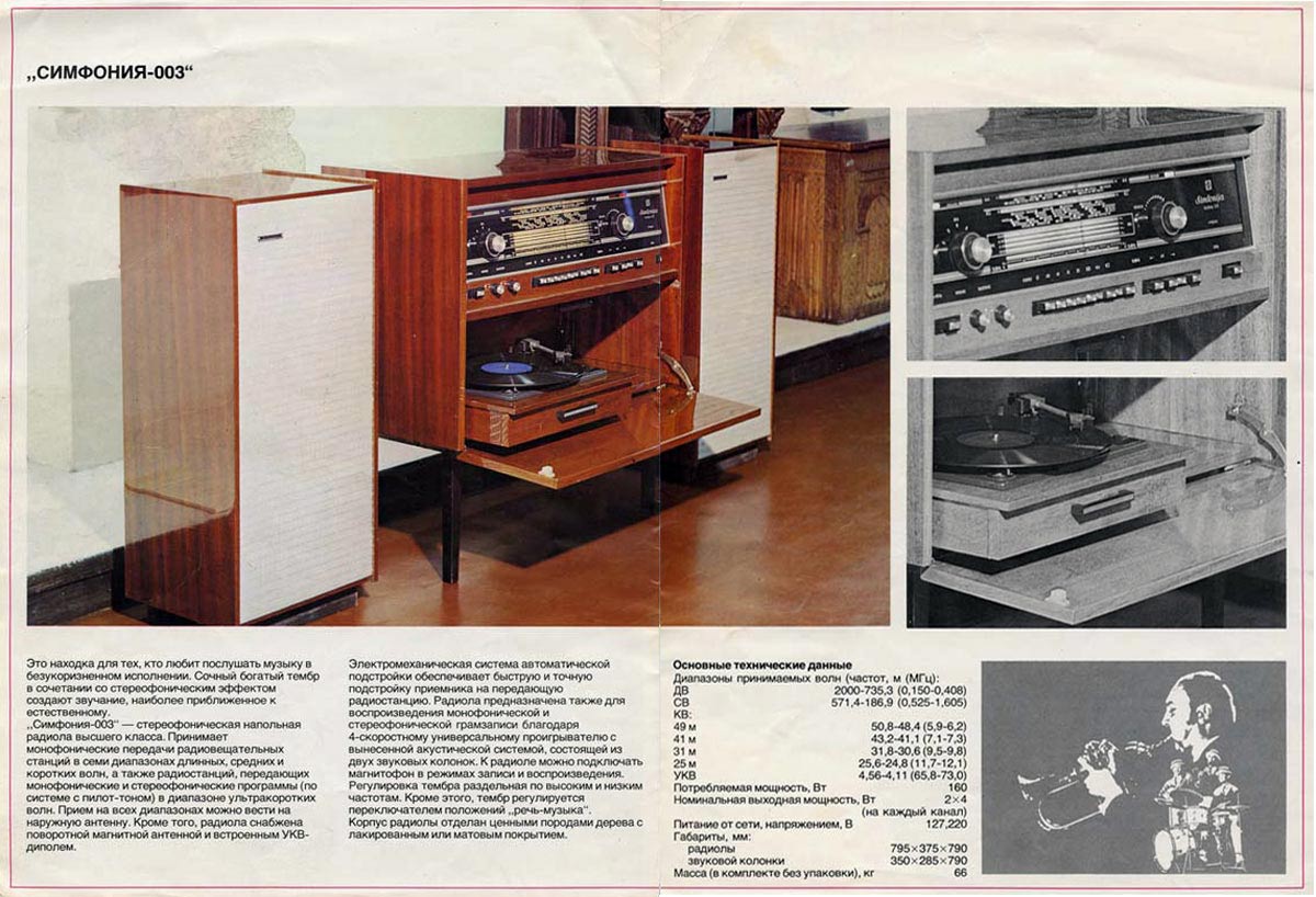Радиола сетевая ламповая *Симфония-003* с 1971 года выпускалась Рижским заводом *Радиотехника*. Стереофоническая радиола высшего класса **Симфония 003** разработана на базе радиолы **Симфония-2**, но отличается от неё. Улучшена электрическая схема, применены новые материалы отделки, кнопочный переключатель диапазонов, применено более совершенное ЭПУ типа II-ЭПУ-52С с автостопом. Радиоприёмник имеет диапазоны ДВ, СВ, КВ 1, 2, 3, 4 и УКВ. Чувствительность в АМ диапазонах 30 мкВ, ЧМ 2,5 мкВ. Избирательность 60 дБ. Полоса воспроизводимых частот в диапазонах АМ - 40...7000 Гц, ЧМ и при воспроизведении грампластинок - 40...15000 Гц. Усилитель мощности выполнен на лампах типа 6П14П, включенных по ультралинейной схеме с автосмещением, имеет выходную мощность 2х4 Вт. АС трёхполосные, закрытого типа, в каждой установлены по три громкоговорителя 6ГД-2, 3ГД-1 и 1ГД-3. Размеры АС уменьшены по сравнению с применявшимися в радиоле **Симфония 2**. Благодаря высокой чувствительности головок АС развивает звуковое давление в 112 дБ на расстоянии 1 м, при подводимой мощности 4 Вт. Потребляемая мощность вместе с ЭПУ 130 Вт. Габариты радиолы 795х525х375 мм, масса 37 кг. Габариты одной АС 790х350х285 мм, вес 14,5 кг. В 1976 году была выпущена небольшая серия радиол *Симфония-003М* почти не отличающихся от базовой. Экспортная радиола выпускавшаяся с 1971 года именовалась **Rigonda-Bolshoi**, в ней были другие частоты УКВ диапазона и КВ поддиапазонов и все надписи были на английском.