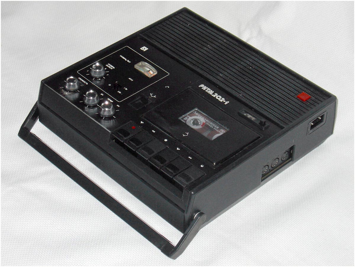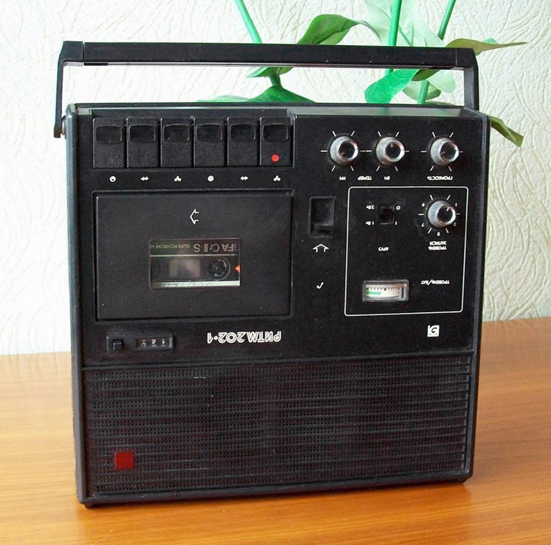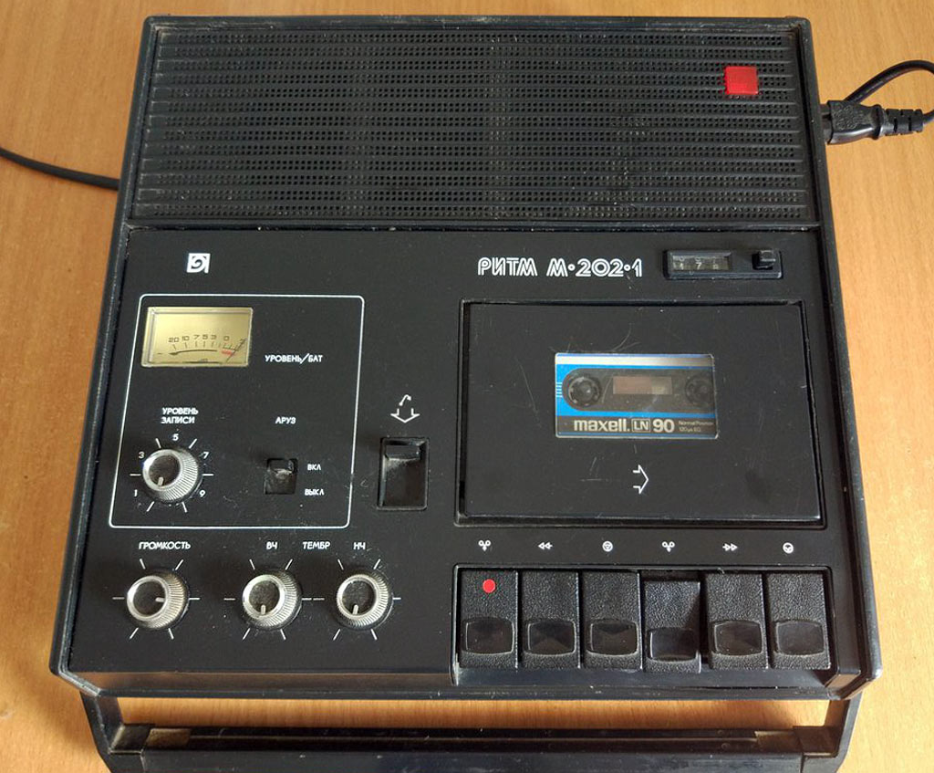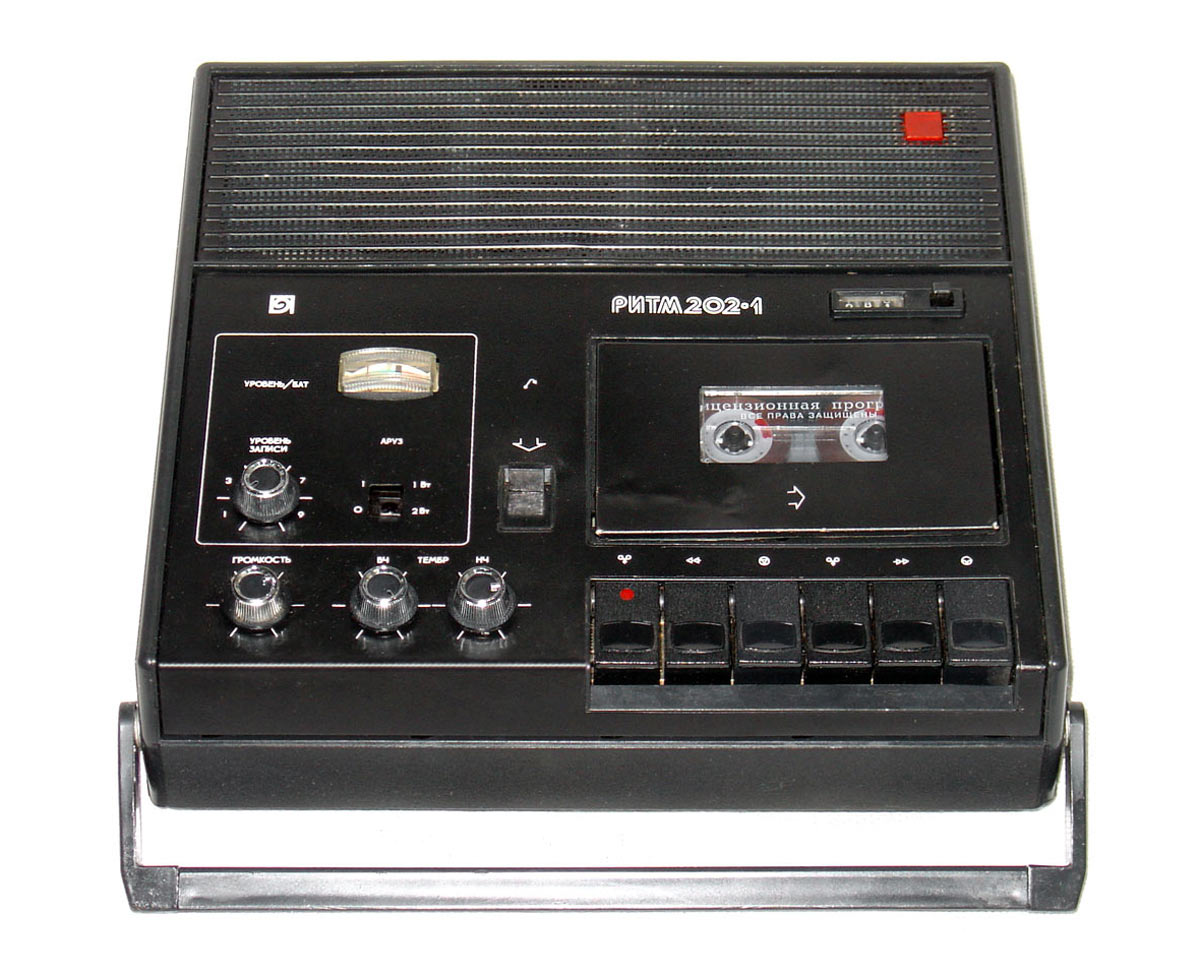 Портативный кассетный магнитофон *Ритм-202-1* с 1983 года выпускал Пермский электроприборный завод. Магнитофон предназначается для записи фонограмм от микрофона, проигрывателя, приёмника, телевизора, радиолинии на магнитную ленту в кассетах и их воспроизведение через громкоговоритель. В магнитофоне есть гнездо для внешней АС. Стабилизированный генератор подмагничивания и стирания, позволяет производить записи при напряжения питания от 6 до 10 В. Регулировка уровня записи осуществляется вручную и автоматически (АРУЗ). Расход ленты контролируется 3-х декадным счётчиком. Магнитофон позволяет осуществлять запись и воспроизведение и во время пешего движения. В магнитофоне автоматически выключается двигатель по окончании ленты. Магнитофон является модификацией модели **Ритм-202** и отличается от него лишь цветовым оформлением и наличием автостопа. Скорость движения магнитной ленты - 4,76 см/с. Коэффициент детонации - 0,3%. Рабочий диапазон частот на ЛВ - 63...12500 Гц. Относительный уровень шумов и помех в канале записи и воспроизведения -48 дБ, а с системой ШП -52 дБ. Коэффициент гармоник на ЛВ не более 4,5%. Номинальная выходная мощность 1, максимальная 2 Вт. Питание от батарей и сети. Потребляемая мощность 10 Вт. Габариты магнитофона - 290х282х81 мм. Масса 4,2 кг. С 1986 года магнитофон стал называться *Ритм М-202-1*. При общей электрической схеме и конструкции с прежней моделью, здесь заменён стрелочный индикатор на больший и более современный.