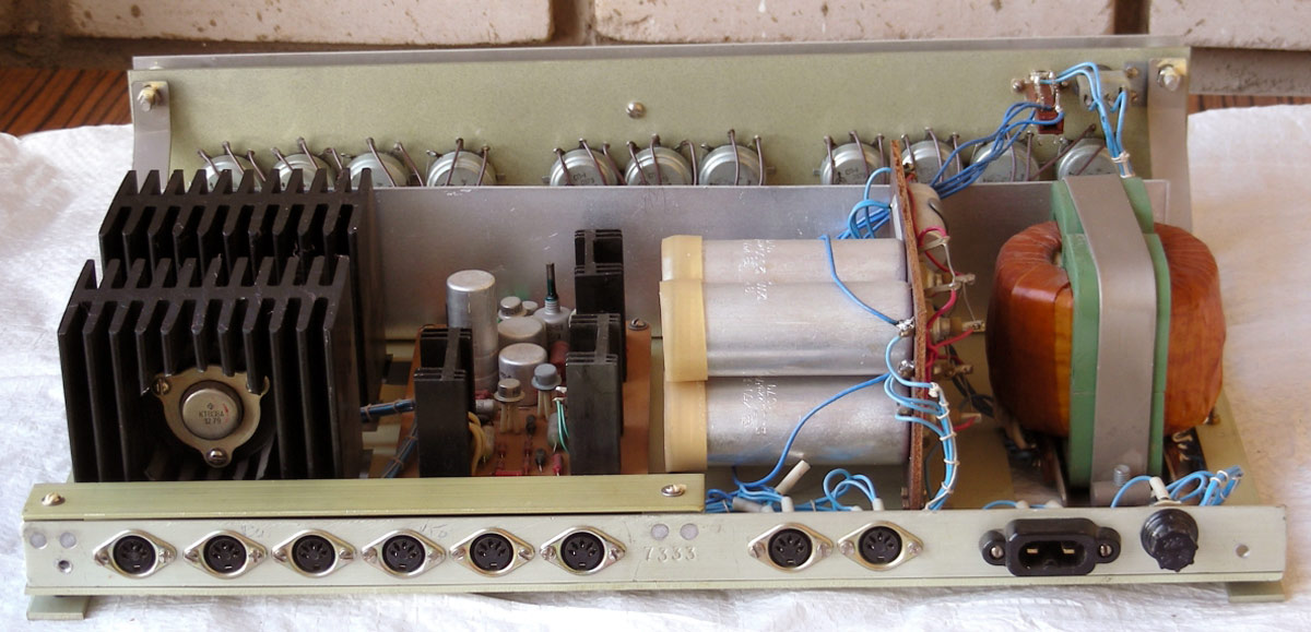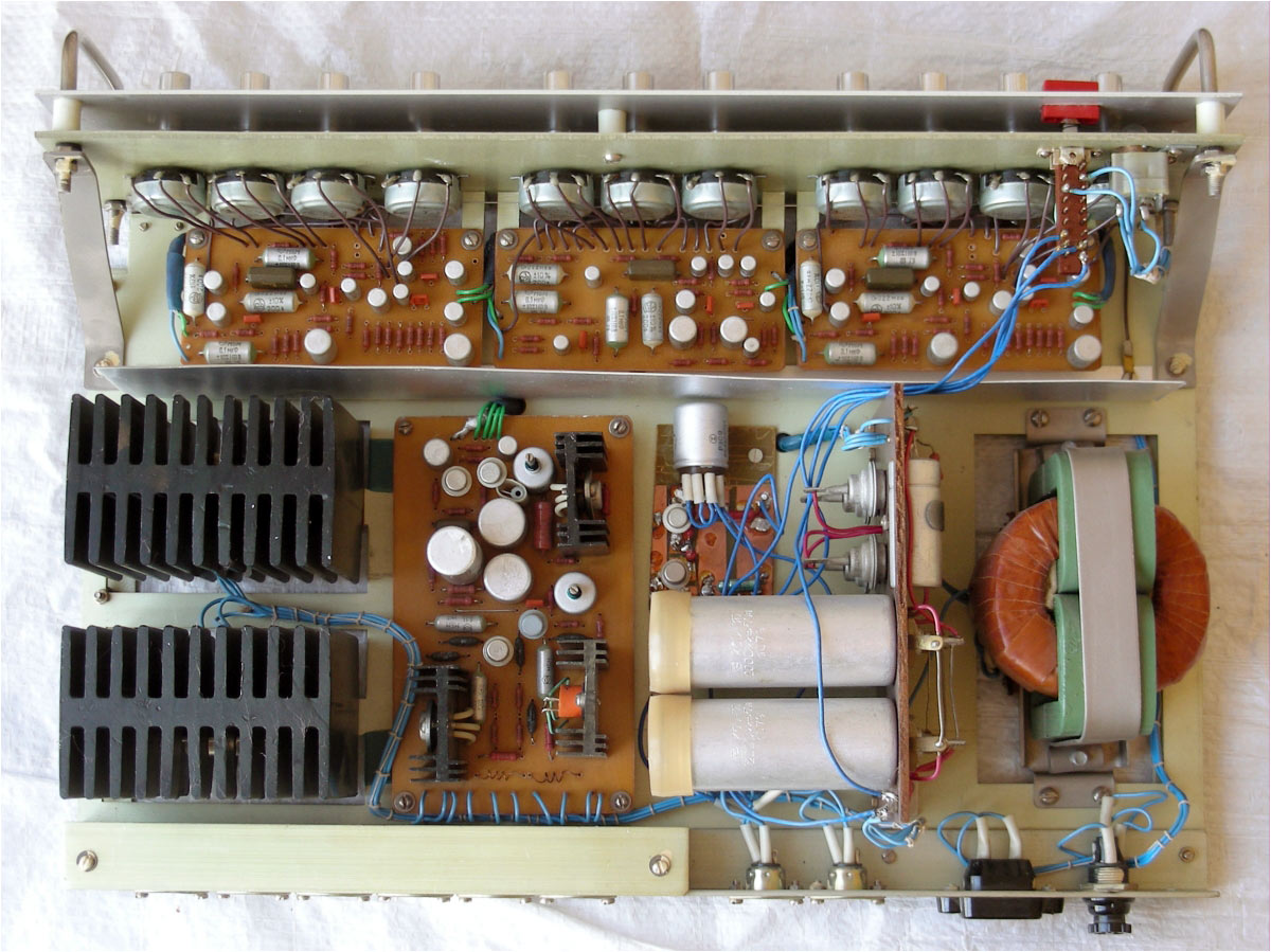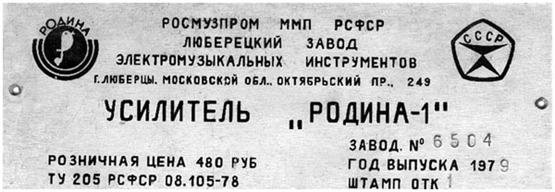 Усилитель низкой частоты *Родина-1* с акустической системой *Родина-1* с 1979 года выпускал Люберецкий завод электромузыкальных инструментов. Транзисторный усилитель низкой частоты **Родина-1** предназначен для усиления звуковых сигналов от электромузыкальных инструментов, микрофона и магнитофона в закрытых помещениях или на открытых площадках. Усилитель имеет 3 канала предварительного усиления и общий усилитель мощности. Диапазон воспроизводимых усилителем частот 25...25000 Гц. Диапазон частот воспроизводимых АС - 63...12500 Гц. Номинальная выходная мощность усилителя - 60 Вт. Номинальная входная мощность АС - 40 Вт. Габариты усилителя 140х330х450 мм. Габариты АС - 1000х500х300 мм. Масса усилителя 10 кг. Масса АС - 45 кг.