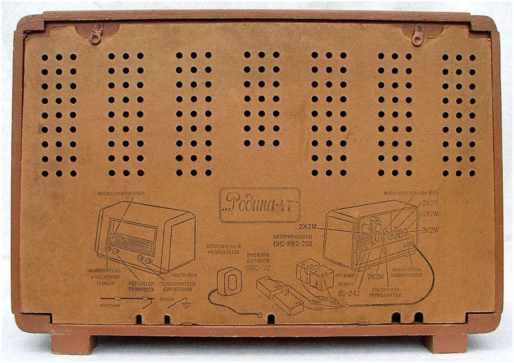Радиоприёмник батарейный *Родина-47*, другое наименование *Электросигнал-3* с 1947 года выпускал Воронежский завод *Электросигнал*. Новый приёмник **Родина-47** отличается от предыдущей модели *Родина* главным образом внешним оформлением, но есть и другие изменения. Диапазон КВ новой модели расширен от 25 до 70 метров. В антенную цепь включён фильтр для уменьшения помех по ПЧ, улучшена схемотехника усилителя НЧ, применена удобная горизонтальная шкала. Есть возможность подключения дополнительного громкоговорителя. АС может быть использована и для прослушивания передач трансляционной линии, которая подключается к гнездам добавочного громкоговорителя. Источники питания приёмника помешаются вне ящика. Диапазоны волн: ДВ 150...410 кГц, СВ 520...1500 кГц, КВ 4,3...12 Мгц. ПЧ 460 кГц. Чувствительность модели 10...70 мкВ, в зависимости от диапазона и заводских настроек. Избирательность по соседнему каналу 20 дБ, по зеркальным каналам на ДВ 26 дБ, СВ 20 дБ, КВ 10 дБ. Номинальная выходная мощностьпри КНИ = 10% около 200 мВт. Потребляемый ток по накалу 0,5 А, аноду 8 мА. В 1950 году приёмник был модернизирован, наименование и его внешнее оформление остались прежние. Была изменена схема, улучшена избирательность по зеркальным каналам, увеличена номинальная выходная мощность до 250 мВт, улучшена АЧХ усилителя НЧ.