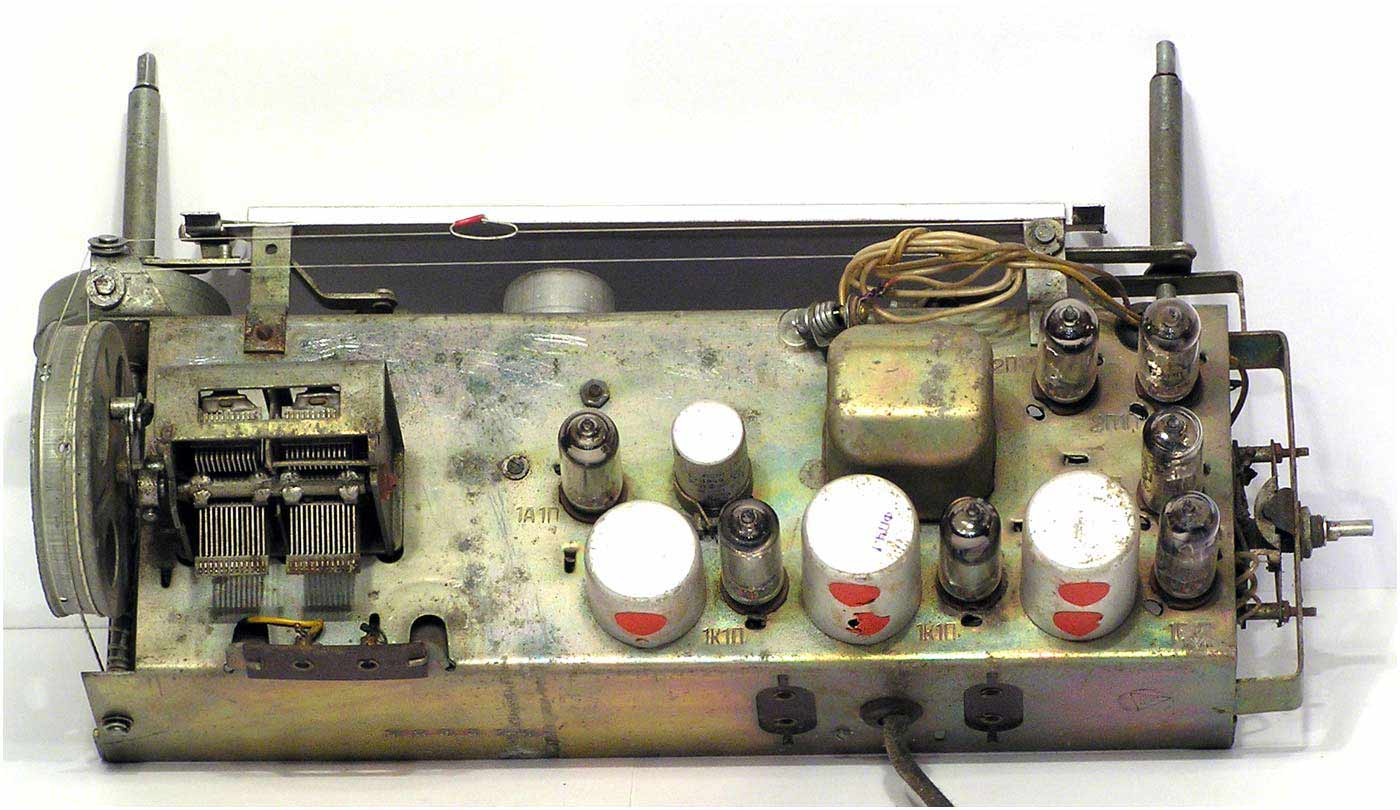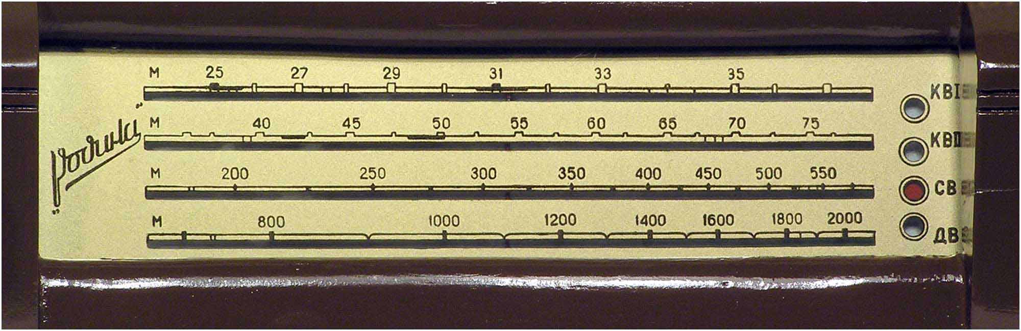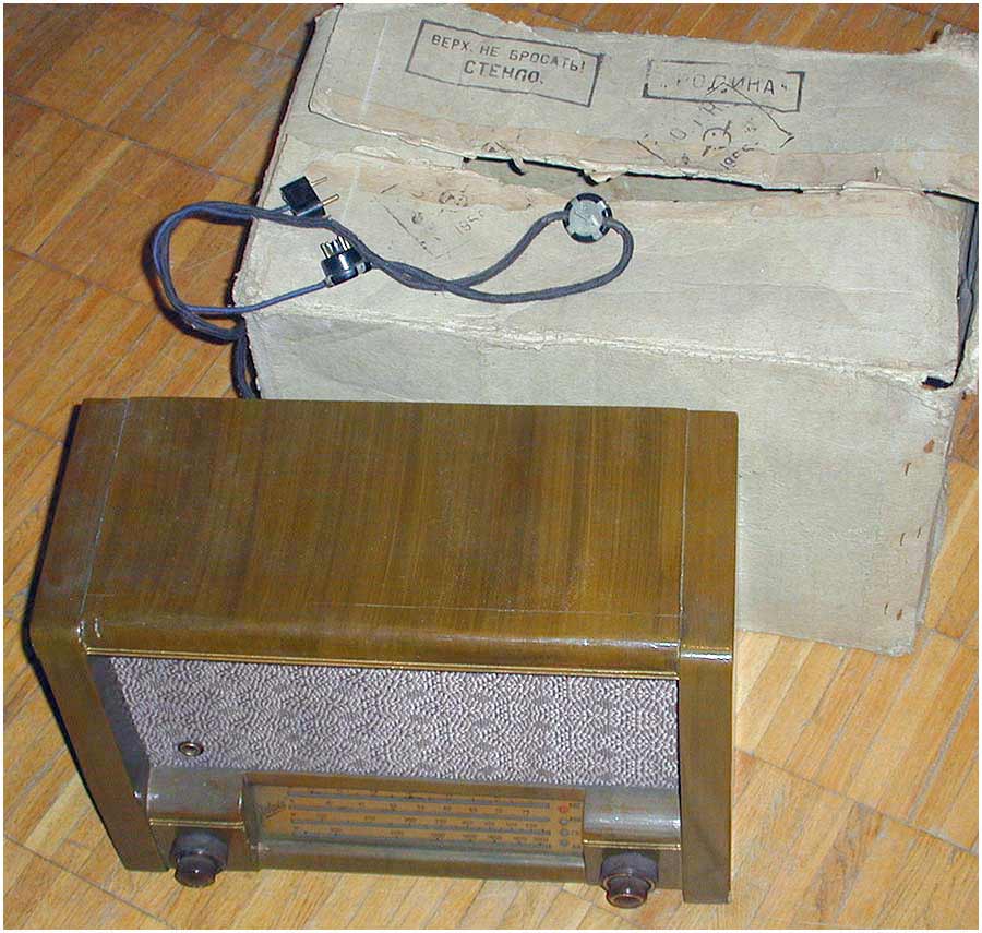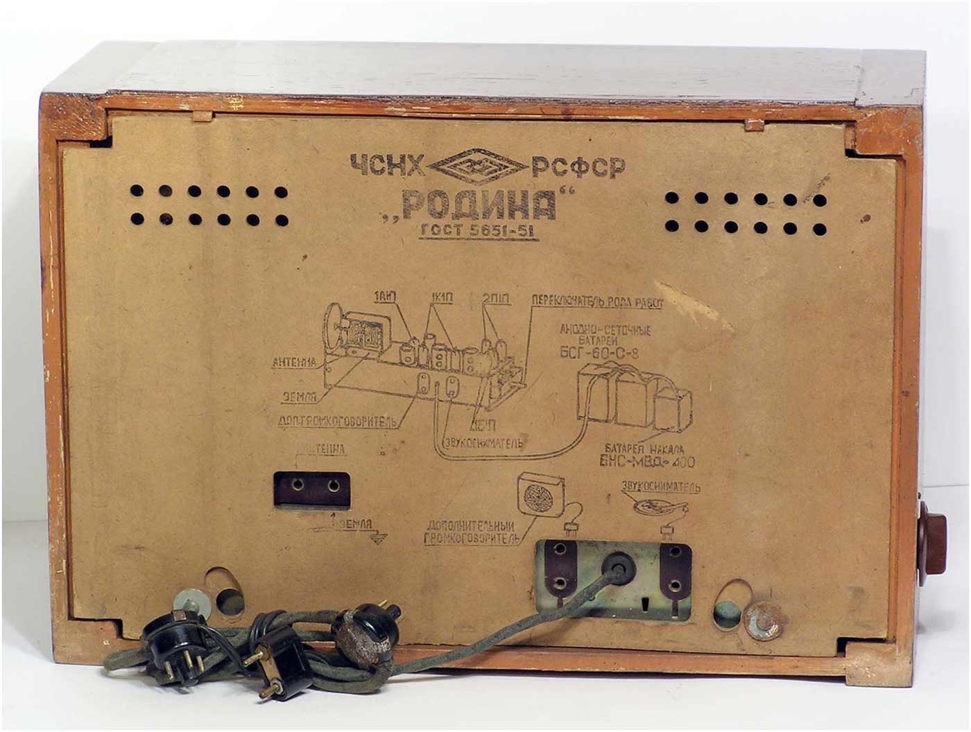 Радиоприёмник батарейный *Родина-52* с 1952 года выпускал Челябинский радиозавод и Воронежский завод *Электросигнал*. Приёмник разработан в 1951 году конструкторским бюро Воронежского завода **Электросигнал**. Приёмник заменил модель **Родина-47** и стал первым в СССР супергетеродинным приёмником 2-го класса на пальчиковых лампах. При высокой чувствительности и избирательности, он отличается экономичностью. Кроме того, в схеме имеется устройство, позволяющее уменьшать расход энергии, когда не требуется работа с большой громкостью. На передней панели, справа находится сдвоенная ручка: большая служит для переключения диапазонов, малая для настройки. Сдвоенная ручка слева выполняет несколько функций: большая - выключатель питания и регулятор тона, малая регулятор громкости. Регулятор тона имеет положения: **Выключено**, **Широкая** и **Узкая полоса**. В положении **Узкая полоса** срезаются высокие частоты. На левой боковой стенке находится переключатель рода работы на три положения: для работы в экономичном режиме **ММ** (Малая мощность), в нормальном режиме **БМ** (Большая мощность) и для работы от звукоснимателя **ЗС**. Сзади находятся гнёзда антенны и заземления, звукоснимателя и добавочного громкоговорителя. С помощью этого же разьёма приёмник может быть включен в трансляционную сеть. Для подключения батарей приёмник снабжен шнуром с колодками. Кроме того в комплекте имеется переходная колодка, которая позволяет использовать обычные батареи накала и анода. Радиоприёмники **Родина-52** начиная с 1954 года работали на батареях от приёмников **Искра-53**. Приёмник имеет 4 диапазона: ДВ 200...723 м, СВ 577...167 м, КВ1 76...36 м и КВ2 36...24,8 м.Чувствительность на ДВ, СВ 200 мкВ, КВ 300 мкВ. Избирательность по соседнему каналу 26 дБ. Избирательность по зеркальному каналу на ДВ 36 дБ, СВ 30 дБ, КВ 12 дБ. Диапазон воспроизводимых звуковых частот 100...4000 Гц. ПЧ 465 КГц. Индикатором включения служит неоновая лампа, расположенная слева над регулятором громкости. Расход тока по накалу 520 мА в обычном и 400 мА в экономичном режиме. Потребляемый ток в режиме **ММ** при выходной мощности 100 мВт - 8,5 мА, в режиме **БМ** при мощности 300 мВт - 12 мА. При работе звукоснимателя выключается накал ламп приёмной части, а выходной каскад работает в режиме **БМ**. В приёмнике установлен громкоговоритель 3ГД-3 (позднее 0,5ГД-5) с постоянным магнитом. Габариты приёмника 450х310х225 мм. Вес 12,5 кг. Радиоприёмник **Родина-52** выпускался до середины 1960 года, претерпев за это время несколько модернизаций схемы и внешнего вида.