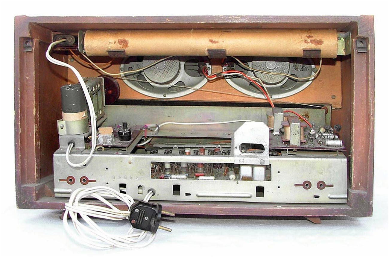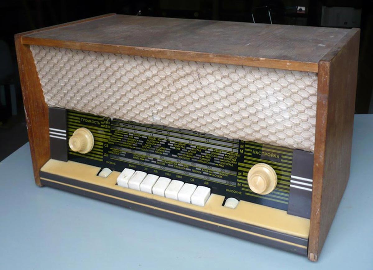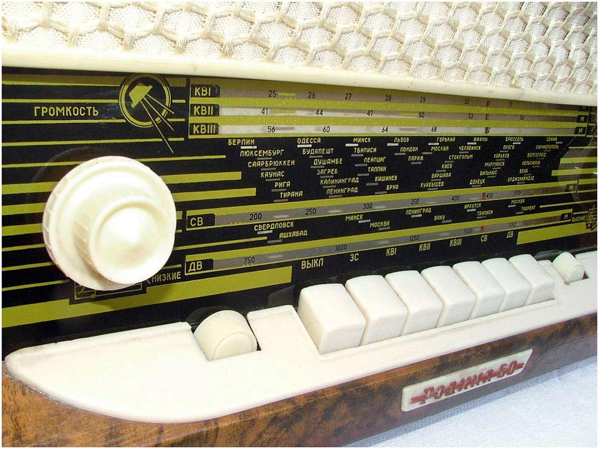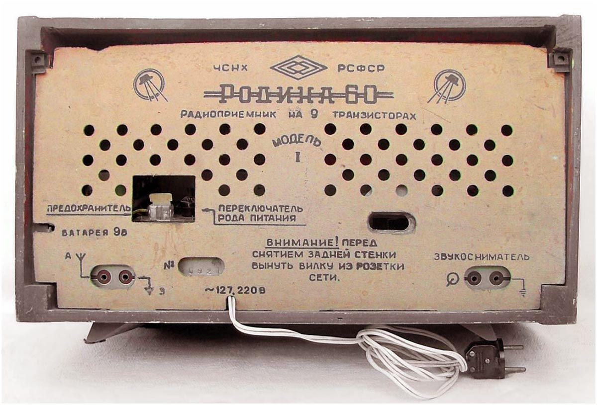Стационарный транзисторный радиоприёмник *Родина-60* с 1960 года выпускал Челябинский радиозавод. Радиоприемник **Родина-60** - это настольный супергетеродин, собранный на 10 транзисторах. Предназначен для приёма радиостанций в диапазонах ДВ, СВ и КВ на наружную антенну. Диапазоны ДВ, СВ стандартные. КВ имеет 3 поддиапазона; KB1 12,1...9,4, KB2 7,5...5,2, KB3 5,4...3,95 МГц. Чувствительность в ДВ, СВ и КВ диапазонах 60, 40 и 30 мкВ. Избирательность по соседнему каналу 36 дБ. Ослабление зеркального канала 36, 30 и 14 дБ. ПЧ 465 кГц. Действие АРУ: при изменении сигнала на входе на 40 дБ, изменение сигнала на выходе около 6 дБ. Полоса воспроизводимых звуковых частот: при приёме радио 100...4000 Гц, при воспроизведении грамзаписи через внешний электропроигрыватель 100...7000 Гц. Номинальная выходная мощность при КНИ 6% - 150 мВт. Источник питания: 6 элементов типа 373 Марс или сеть 50 гц 127 или 220 В, через выносной блок питания. Ток, потребляемый приёмником при отсутствии сигнала 12 мА. Мощность, потребляемая от сети 1,2 Вт. Работоспособность модели сохраняется при напряжении батареи до 5 В. Длительность работы приёмника от одного комплекта элементов 150 часов. Чувствительность усилителя НЧ с гнезд звукоснимателя при номинальной мощности 200 мВ. Габаритные размеры приёмника 488х240х280 мм. Масса РП 8 кг.