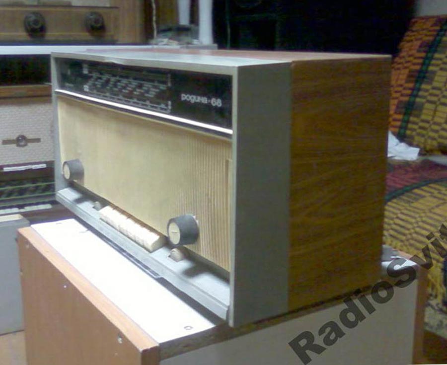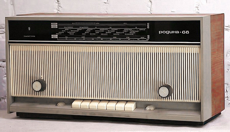 Стационарный транзисторный радиоприёмник *Родина-68* с 1969 года выпускал Челябинский радиозавод. Радиоприёмник создан на базе модели **Эфир-67** (без ЭПУ) и представляет собой настольный супергетеродин 2-го класса, собранный на 9 транзисторах и 4-х диодах. Радиоприёмник предназначен для приёма передач радиовещательных станций с амплитудной модуляцией в диапазонах ДВ, СВ и КВ на наружную антенну. Диапазон КВ волн разделен на три поддиапазона. Чувствительность в диапазонах ДВ, СВ - 60 мкВ, в поддиапазонах КВ - 25 мкВ. Чувствительность в режиме **Местный приём** - 900 мкВ. Селективность - 40 дБ. Номинальная выходная мощность 500 мВт. Диапазон воспроизводимых частот 100...6000 Гц. Питание от 6-ти батарей А-373 или от сети. Габариты модели 502х252х230 мм. Вес 8 кг.