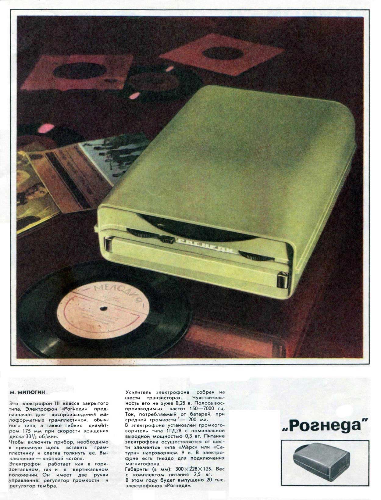 «Рогнеда», «Рогнеда-309з, «Лидер-302» — переносные электрофоны Ш класса, предназначенные для воспроизведения записей с долгоиграющих грампластинок на внутренний громкоговоритель. Электрофон портативный транзисторный *Рогнеда* с начала 1970 года выпускал Саратовский завод точной электромеханики. Переносной транзисторный электрофон третьего класса **Рогнеда** рассчитан на полуавтоматическое проигрывание грампластинок диаметром 175 мм в стационарных условиях и в умеренном движении. Электрофон состоит из электропроигрывателя и усилителя на транзисторах. Усилитель имеет чувствительность 250 мВ и номинальную выходную мощность 0,5 Вт. В модели применён громкоговоритель типа 1ГД-28. Диапазон воспроизводимых звуковых частот 150...6000 Гц. Двигатель применён ДРВ-0,1. Скорость вращения диска 33 об/мин. Питание электрофона осуществляется от 6-ти элементов А-373, потребляемая от батарей мощность 1,5 Вт. Размеры электрофона - 316х200х100 мм, масса 2,7 кг.