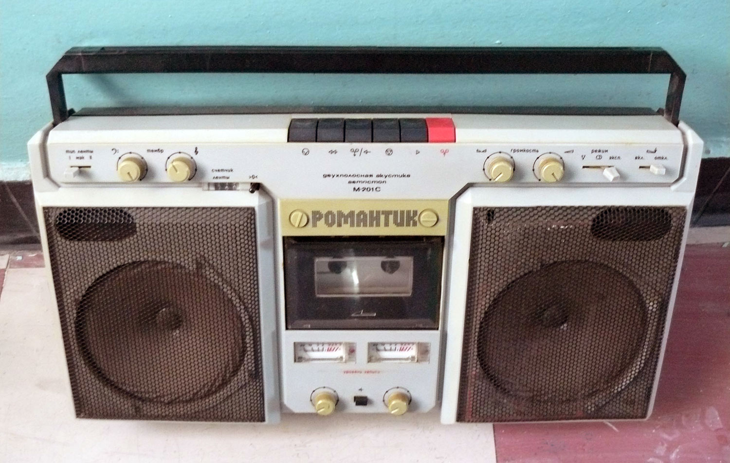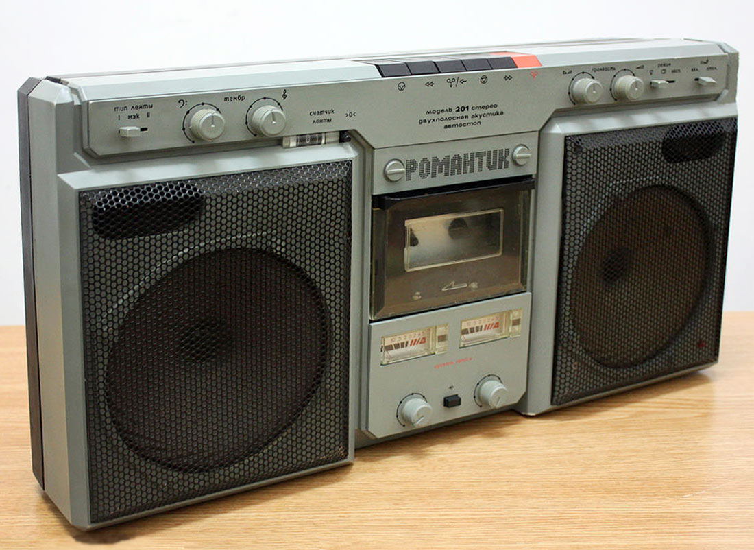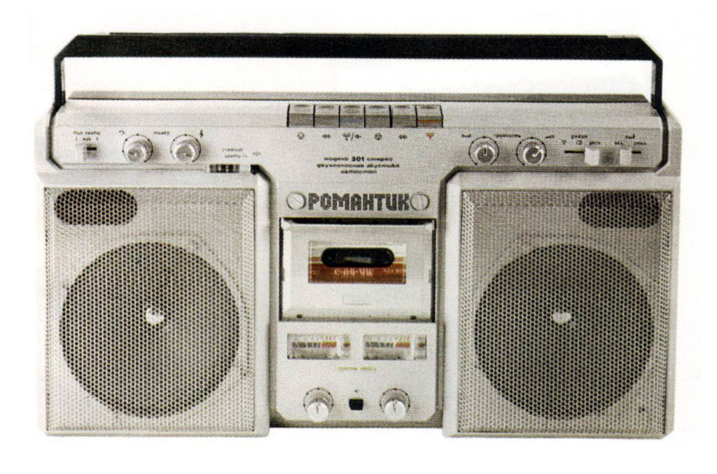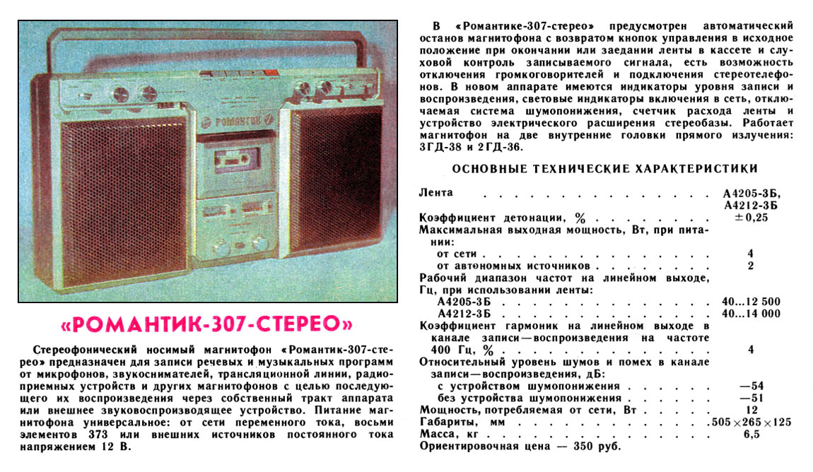 Стереофонический кассетный магнитофон *Романтик-307-стерео* с 1983 года выпускал Горьковский завод им. Петровского. Была выпущена опытная партия, а так как параметры магнитофона соответствовали аппарам второго класса, то началась подготовка к выпуску магнитофона *Романтик-201-стерео*. Оба магнитофона аналогичны и предназначены для записи фонограм с их последующим воспроизведением через собственные АС или внешнее УКУ. Питание универсальное: от сети переменного тока, восьми элементов А-373 или внешнего источника напряжением 12 В. В магнитофоне имеется: автоматический останов ЛПМ с возвратом клавиш в исходное положение при окончании ленты; слуховой контроль записываемого сигнала; возможность отключения громкоговорителей в АС и подключения стереотелефонов. В модели имеются: индикаторы уровня записи и воспроизведения; световые индикаторы включения в сеть; отключаемая СШП; счётчик расхода ленты; устройство расширения стереобазы. В магнитофоне установлено четыре громкоговорителя, два 3ГД-38 и два 2ГД-36. Основные параметры: магнитная лента А4205-3Б или А4212-3Б; коэффициент детонации ±0,25%; максимальная выходная мощность при питании от электросети 4 Вт, от батарей 2 Вт; рабочий диапазон частот на ЛВ на ленте: А4205-3Б - 40...12500 Гц, А4212-3Б - 40...14000 Гц. Коэффициент гармоник на ЛВ 4%. Относительный уровень шумов и помех с СШП -54 дБ, без СШП -51 дБ. Мощность, потребляемая от сети 12 Вт. Габариты аппарата - 505х265х125 мм. Масса - 6,5 кг. На последнем фото макет варианта магнитофона *Романтик-201-стерео*, подготовленного к выпуску с 1984 г.