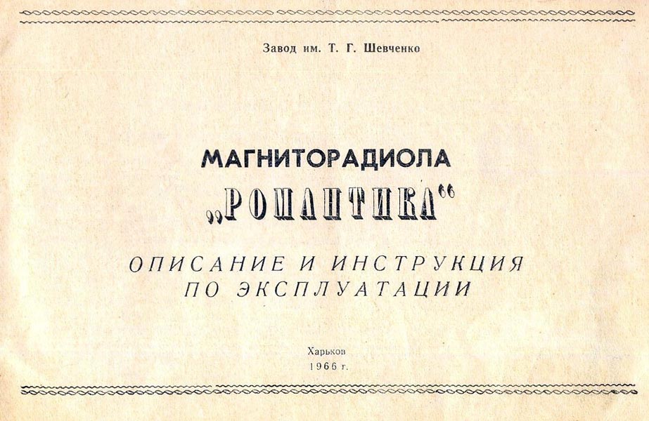 Магниторадиола *Романтика* с 1966 года выпускалась Харьковским ПСЗ им. Шевченко. *Романтика* - это модернизация модели **Харьков-63**. Представляет 12-ти ламповый комбайн, включающий радиоприёмник первого класса, ЭПУ и магнитофон-приставку. Магниторадиола предназначена для приёма на всех вещательных диапазонах, прослушивания грампластинок и записи фонограм на магнитную ленту с последующим воспроизведением. Запись двухдорожечная. Предусмотрена ускоренная перемотка ленты. Скорость ленты - 9,53 см/сек. Продолжительность непрерывной записи при ёмкости катушек 180 м. по 30 минут на каждой дорожке. Чувствительность 3 мВ от микрофона, 200 мВ от звукоснимателя и приёмника. Рабочий диапазон частот звука - 63...10000 Гц. Относительный уровень шумов -40 дБ. КНИ 5%. Коэффициент детонации 0,3%. Номинальная выходная мощность 2 Вт. Питание от сети напряжением 127 или 220 В. Потребляемая мощность 110 Вт. Габариты модели 1000х310х345 мм. Масса 34 кг. АС состоит из двух широкополосных громкоговорителей 4ГД-28 и двух 1ГД-28. На задней стенке магниторадиолы расположены гнёзда антенны, заземления, наружной или внутренней УКВ антенн, входов и выходов, дистанционного выключателя.