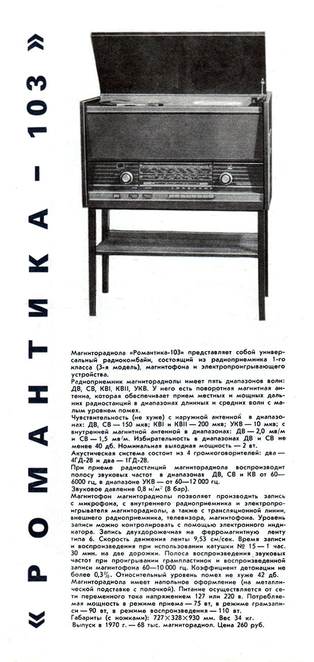 Магниторадиола *Романтика-103* с 1969 года выпускалась Харьковским заводом имени Т. Г. Шевченко. Магниторадиола является модернизацией серийной магниторадиолы **Романтика-М** и по своей конструкции, оформлению и электрической схеме от неё практически ничем не отличается. В магниторадиоле *Романтика-103* применена более современная магнитофонная приставка, такая же как позднее у модели **Романтика-105**.
