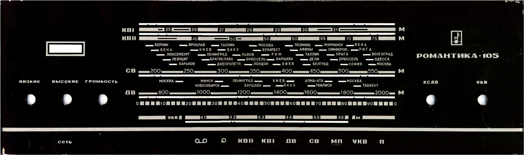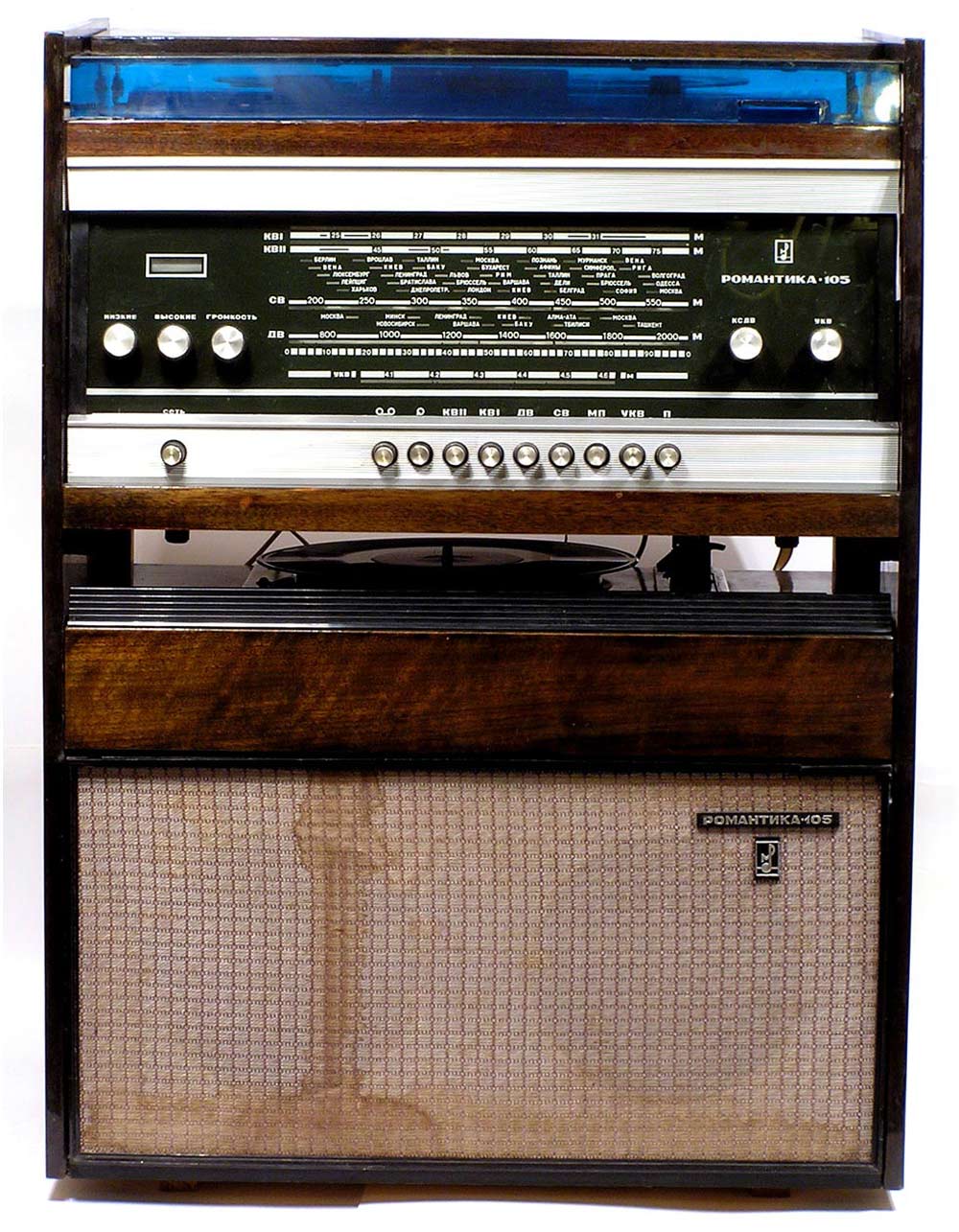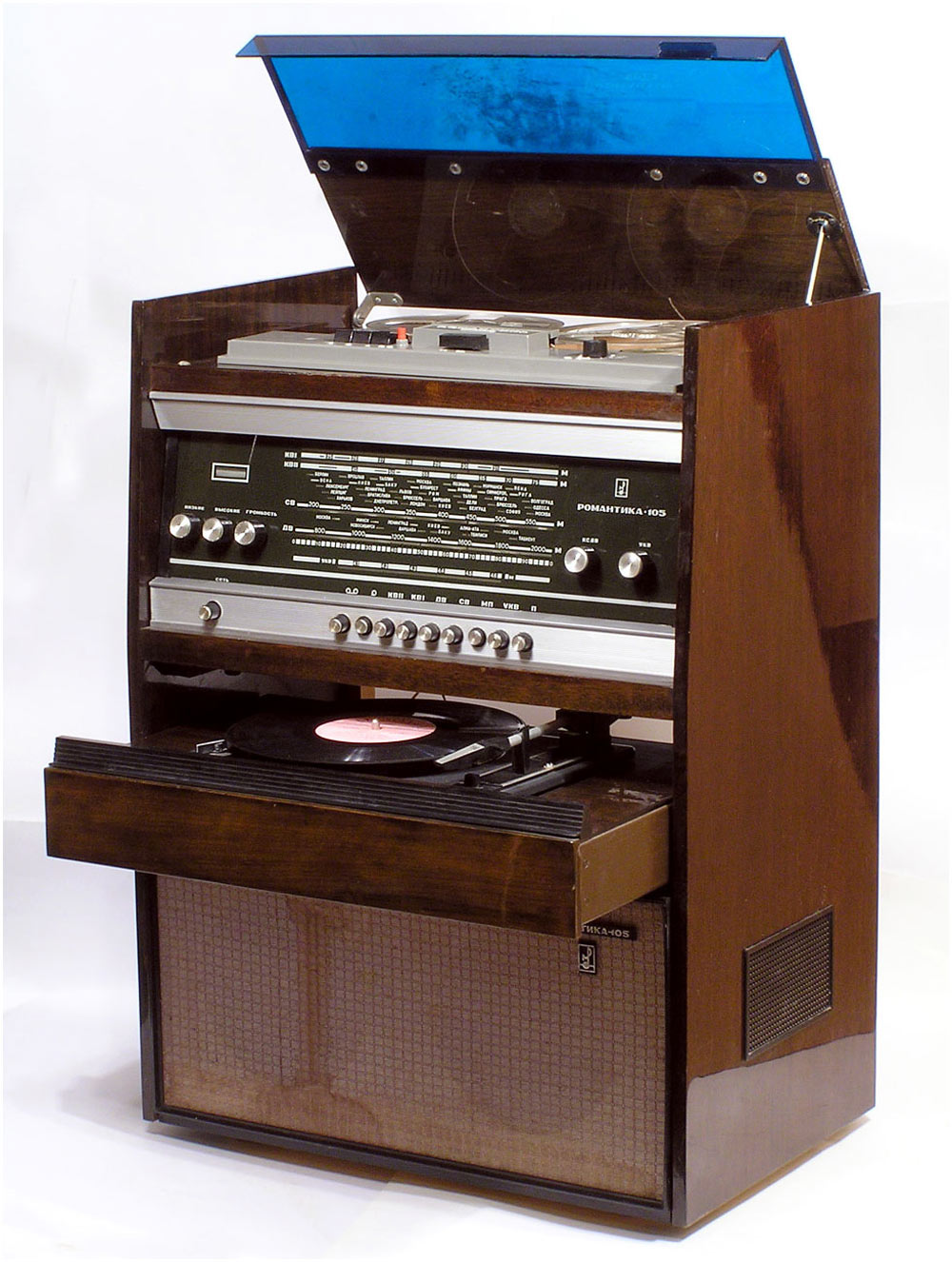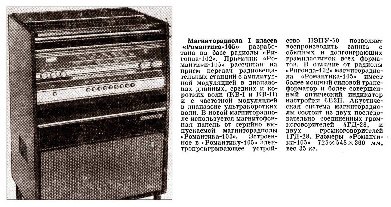 Консольная магниторадиола *Романтика-105* с 1972 года выпускалась Харьковским ПСЗ имени Шевченко. Магниторадиола создана на базе серийной радиолы **Ригонда-102**. Радиоприёмник работает в диапазонах ДВ, СВ, KB-1, КВ-2 и УКВ-ЧМ. В модели применена МП от магниторадиолы **Романтика-103**. ЭПУ типа II-ЭПУ-50 позволяет воспроизводить запись с обычных и долгоиграющих пластинок всех форматов. В отличие от **Ригонды-102**, **Романтика-105** имеет более мощный силовой трансформатор и индикатор на лампе 6Е3П. АС имеет по два громкоговорителя 4ГД-28 и 1ГД-28. Размеры модели 725х548х360 мм. Вес 35 кг.
