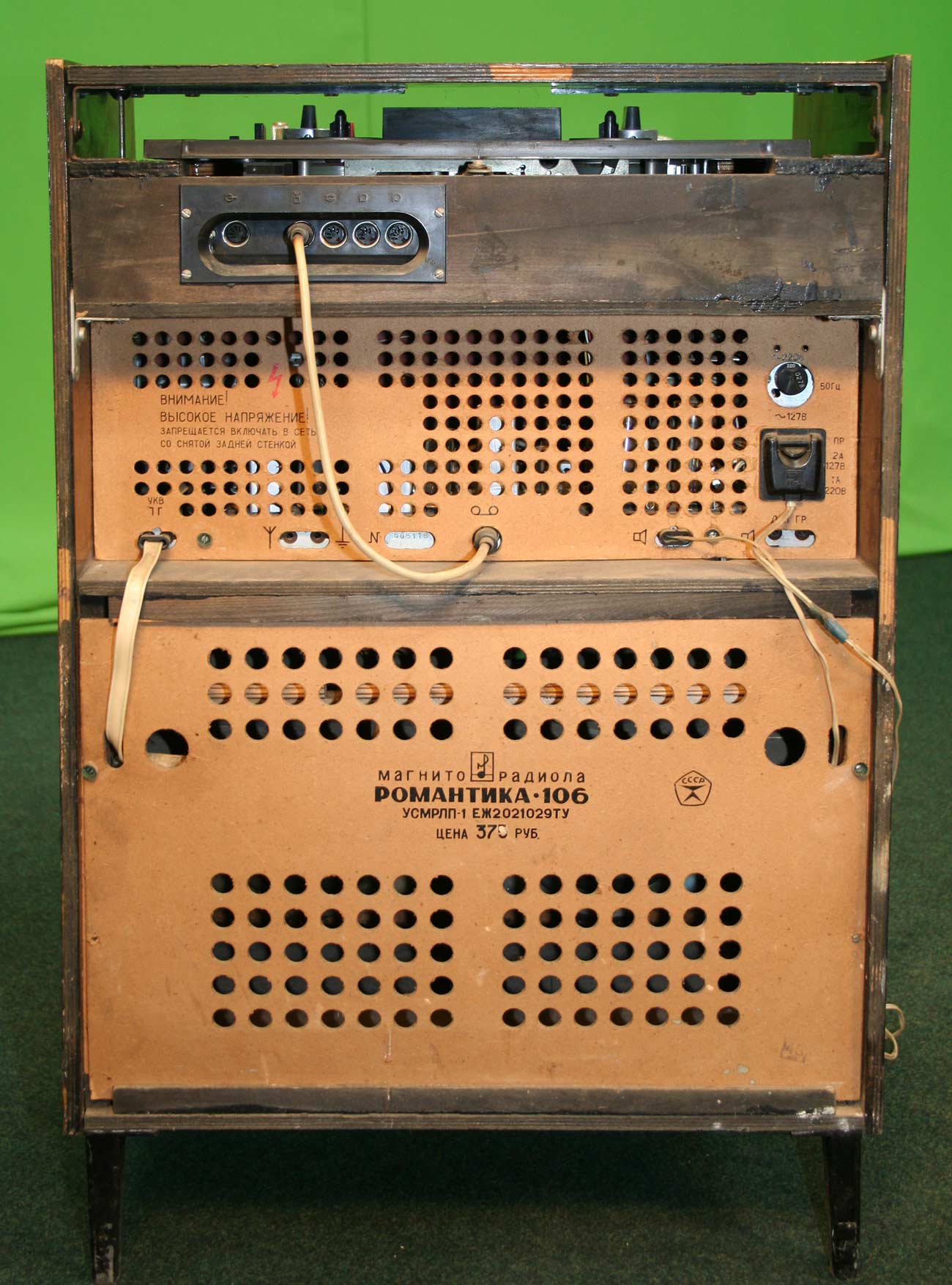 Магниторадиола *Романтика-106* с 1973 года выпускалась Харьковским ПСЗ им. Шевченко. Установка представляет собой модернизацию модели **Романтика-105**. В магниторадиоле применена транзисторная 4-х дорожечная катушечная магнитофонная панель 2-го класса **Романтика-201**, выполненная на базе унифицированного ЛПМ, что и является отличием от модели **Романтика-105** в которой используется ламповая магнитофонная панель 3 класса. Схема приёмника и конструкция блоков аналогичны базовой модели. На магнитофонной панели имеются гнёзда подключения приёмника, микрофона, внешнего ЭПУ, внешнего усилителя, гнездо линейного выхода. Уровень записи контролируют по стрелочному индикатору. Число дорожек записи - 4. Скорость движения ленты 9,53 и 19,05 см/сек. Время записи на катушке № 15 с лентой А4407-6Б на 4-х дорожках при скорости 9,53 см/сек - 4 часа. 19,05 см/сек - 2 часа. Габариты магниторадиолы 865х560х370 мм. Масса 33 кг.