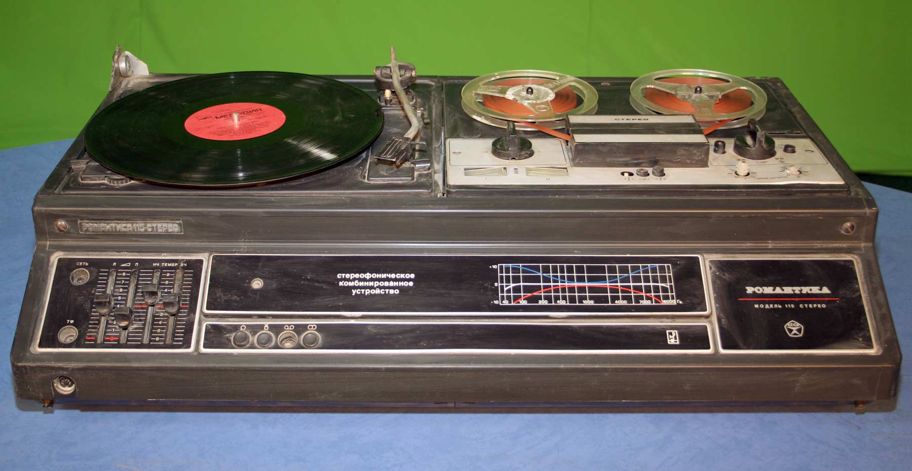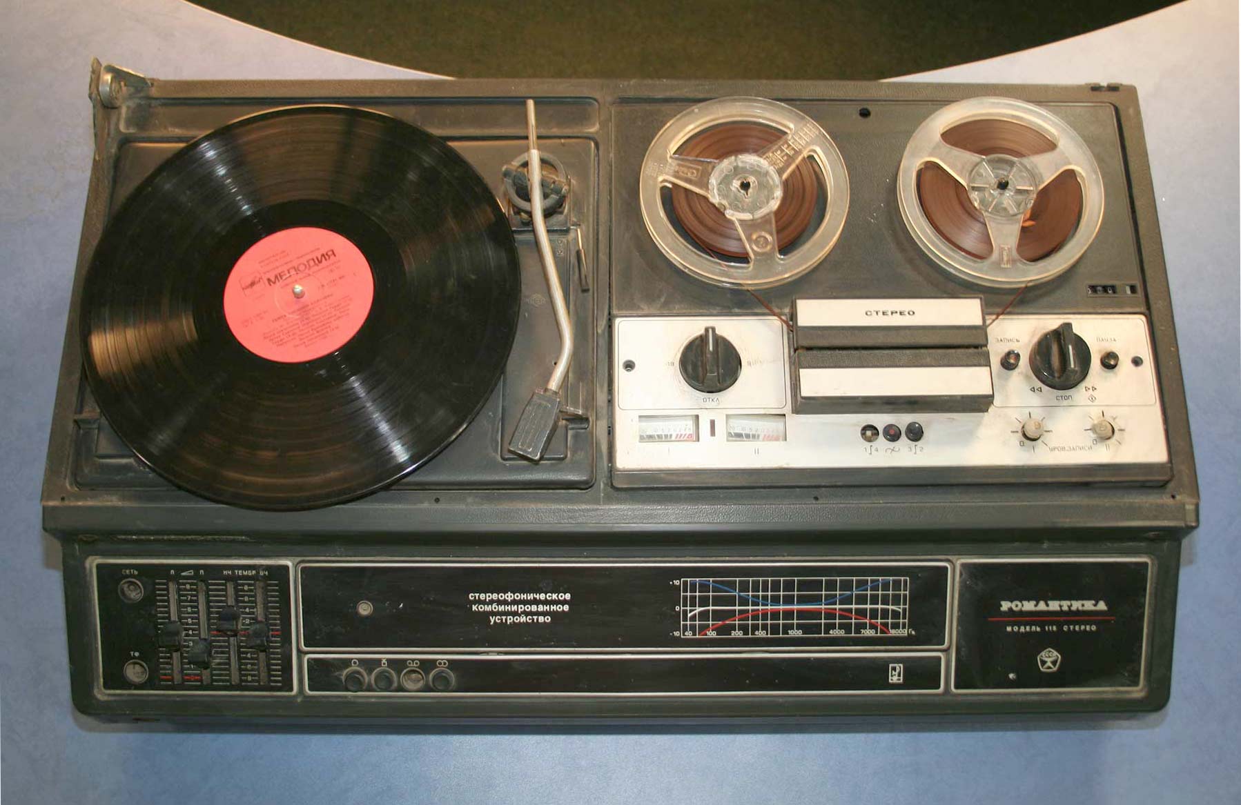 Комбинированное стереофоническое устройство *Романтика-115-стерео* с 1981 года выпускал Харьковский ПСЗ имени Шевченко. КУ предназначено для записи и воспроизведения магнитных фонограмм на скоростях 9,53 и 19,05 см/сек, а также для прослушивания грампластинок всех стандартных форматов. Комбинированное устройство состоит из двухскоростной катушечной стереофонической магнитофонной панели второго класса, двухскоростного ЭПУ 2-го класса, усилителя низкой частоты первого класса и двух широкополосных АС 10АС-407. Номинальная выходная мощность 2х6 Вт, максимальная 2х10 Вт. Диапазон частот звука по тракту усиления - 40...18000 Гц, магнитной записи при скорости 9,53 см/с - 63...12500 Гц, 19,05 см/с - 40...18000 Гц. Коэффициент детонации на скорости 9,53 см/с ±0,25%, 19,05 см/с ±0,15%. Диапазон регулировки тембра ±10 дБ. Габариты магниторадиолы 775х485х265 мм. Одной АС 280х260х435 мм. Масса магниторадиолы 31 кг. Масса одной АС - 12 кг. Общая цена комплекта - 670 рублей. Цена КУ со столиком на колёсиках 720 рублей.
