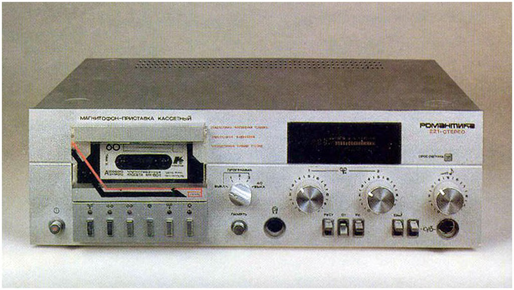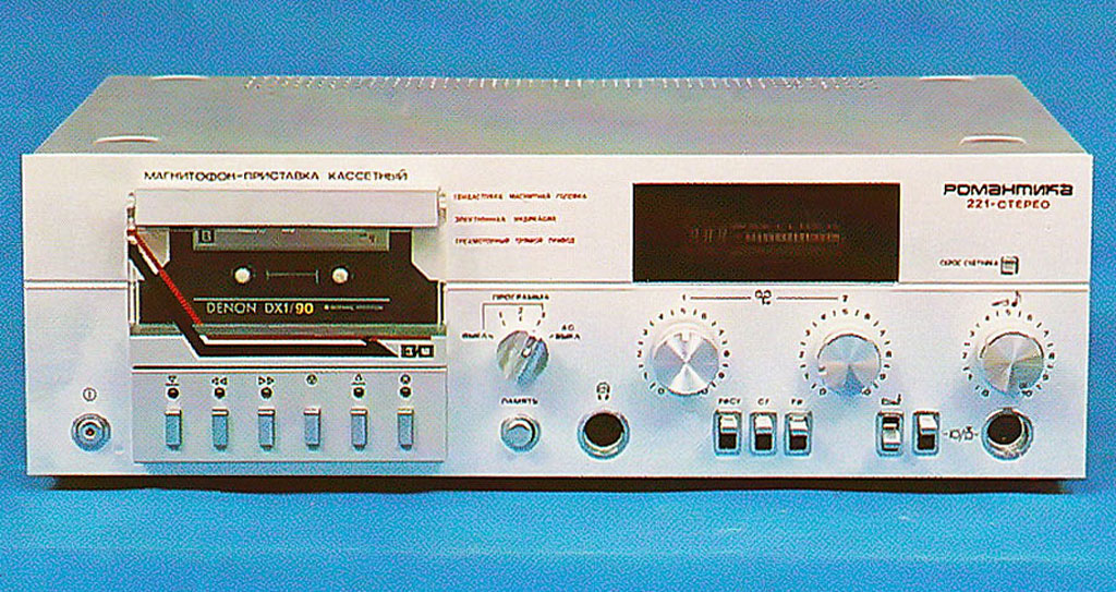 Магнитофон-приставку *Романтика-221-стерео* в 1987 году подготовил к выпуску Харьковский приборостроительный завод имени Шевченко. МП создан на базе модели *Романтика-220-стерео*. МП планировалось выпускать в двух вариантах оформления, были изготовлены опытые образцы, но дальше не пошло. МП предназначен для записи и воспроизведения фонограмм через телефоны или УКУ. Есть возможность работы с 3-мя типами ленты. Имеются: 3-х моторный ЛПМ, сендостовая головка, cветовая индикация режимов работы, устройство ШП, автостоп с отключением ЛПМ, электронный счётчик расхода ленты с режимом память. Кроме ручной, есть и система АРУЗ, переключатель типа лент, беспроводное ПДУ. Управление ЛПМ квазисенсорное. Рабочий диапазон частот на ленте А-4212-ЗБ - 31,5...18000 Гц. Коэффициент детонации ЛПМ ±0,1. Габариты МП 462х380х162 мм. Масса 6,3 кг.