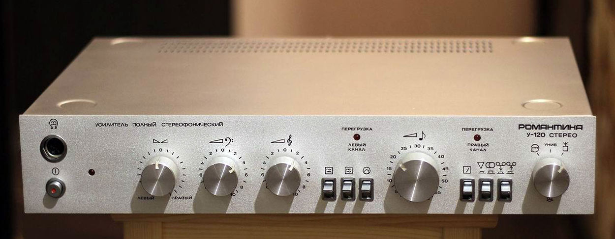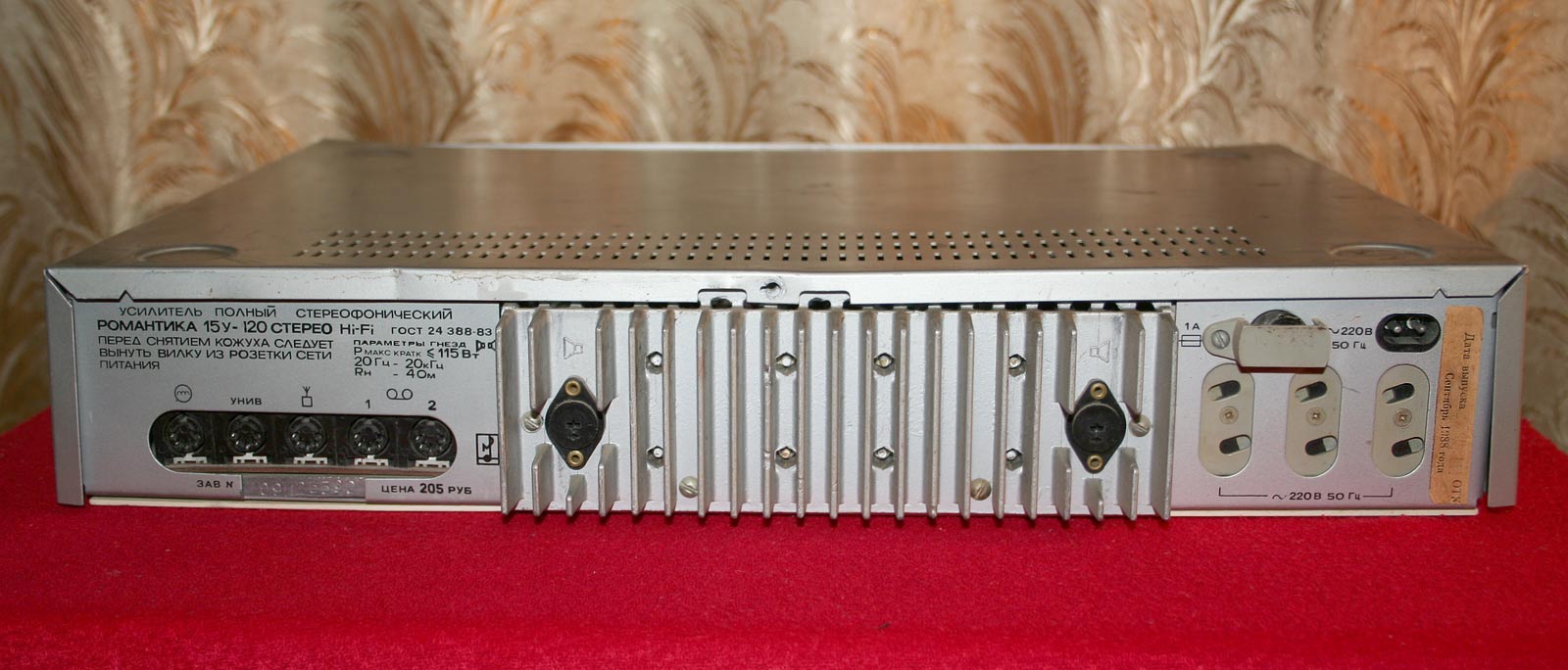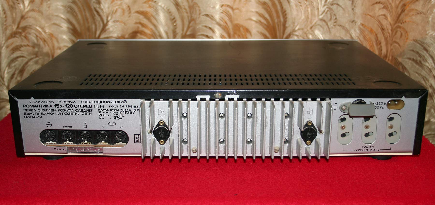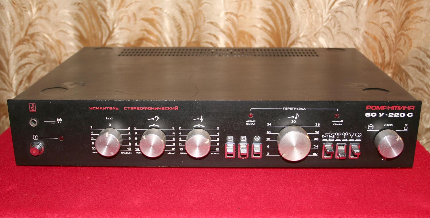 Усилители *Романтика 15У-120С* и *Романтика 50У-220С* с 1985 и 1988 года выпускал Харьковский ПСЗ имени Шевченко. По ГОСТ 24388-83 это усилитель **Романтика 15У-120С**, а по ГОСТ 24388-88 **Романтика 50У-220С**. Модель представляет собой полный стереофонический усилитель 2-й группы сложности. Усилитель предназначен для усиления монофонических или стереофонических фонограмм от различных источников сигнала и воспроизведения их с помощью АС *50АС-105* или аналогичных, с номинальным сопротивлением 4 Ома. Технические характеристики: номинальная выходная мощность, при номинальном сопротивлении в 4 Ом а - 2х15 Вт; максимальная долговременная мощность - 2х50 Вт; кратковременная мощность - 2х115 Вт; диапазон рабочих частот 40...16000 Гц; отклонения АЧХ в диапазоне воспроизводимых частот 1,5...2%; общие гармонические искажения в диапазоне частот не более 0,5%. Питание усилптеля осуществляется от сети 220 В. Габариты любого из усилителей 460х90х350 мм. Масса 7 кг. Первые выпуски усилителя именовались как *Романтика У-120С*.