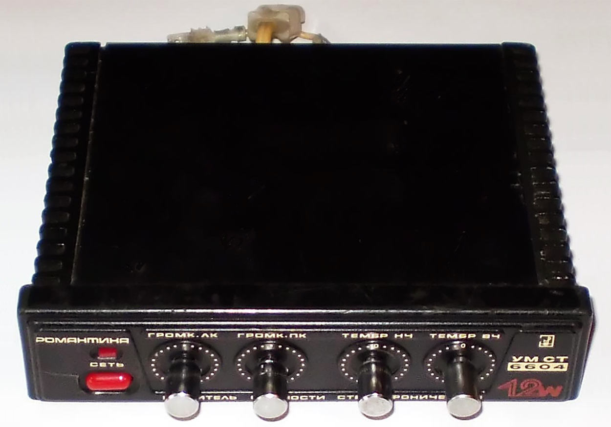 Усилитель мощности стереофонический транспортный *Романтика УМ-6604 СТ* с 1992 года выпускал Харьковский ПСЗ имени Шевченко. Усилитель, в комплекте с громкоговорителями 10ГДШ-1М предназначен для усиления и акустического воспроизведения речевых и музыкальных программ от источника сигнала, находящегося в автомобиле. Эффективный диапазон частот 100...18000 Гц. Общая номинальная выходная мощность на нагрузке 4 Ом не менее 10 Вт. Долговременная выходная мощность около 20 Вт.