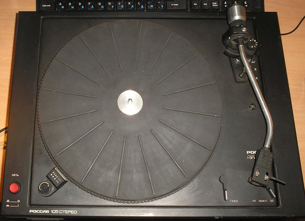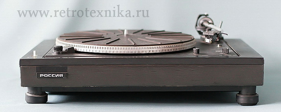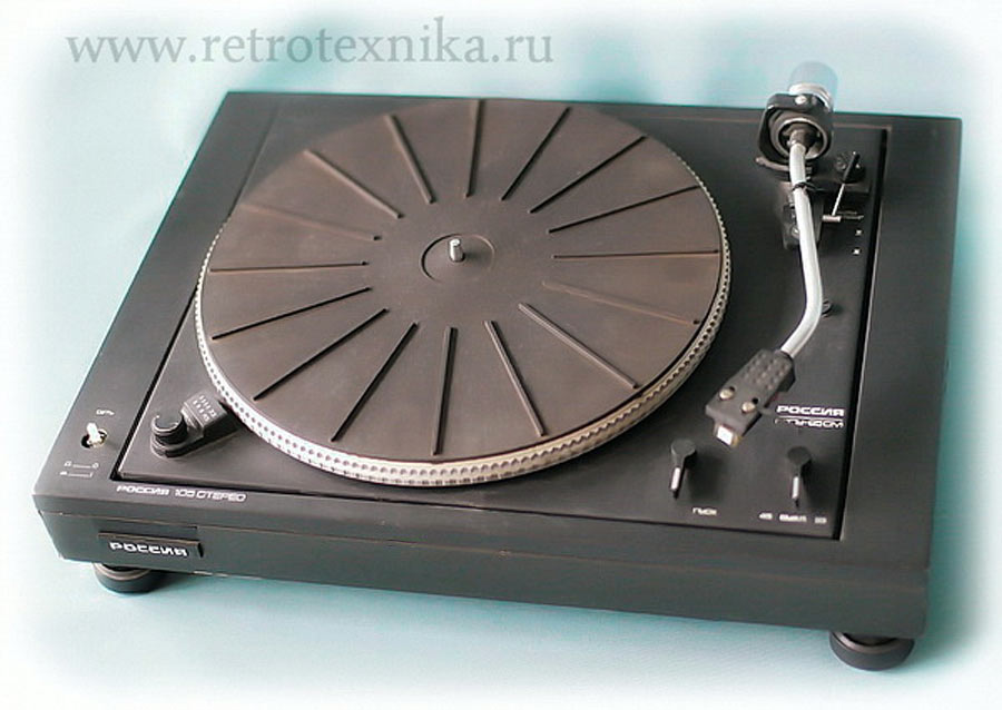 Электропроигрыватель *Россия-105-стерео* с 1985 года выпускало Челябинское ПО *Полёт. Стереофонический электропроигрыватель первой группы сложности **Россия-105-стерео** предназначен для воспроизведение звукозаписей с моно или стереофонических грампластинок всех форматов. ЭП имеет двухскоростное электропроигрывающее устройство I-ЭПУ-95СМ со сверхтихоходным бесконтактным электродвигателем постоянного тока, прямой привод с пониженным уровнем рокота, устройство для точной подстройки частоты вращения диска ЭПУ, регулятор прижимной силы звукоснимателя, компенсатор скатывающей силы тонарма, микролифт и электронный автостоп. Корпус аппарата выполнен из ударопрочного полистирола. Краткие характеристики: Частота вращения диска 33 1/3; 45 об/мин. Диапазон воспроизводимых звуковых частот 31,5...16000 Гц. Коэффициент детонации 0,15%. Относительный уровень рокота со взвешивающим фильтром -60 дБ. Уровень электрического фона -63 дБ. Напряжение питания 220 В. Потребляемая мощность - 20 Вт. Габариты электропроигрывателя - 441х343х150 мм. Его масса - 9 кг.