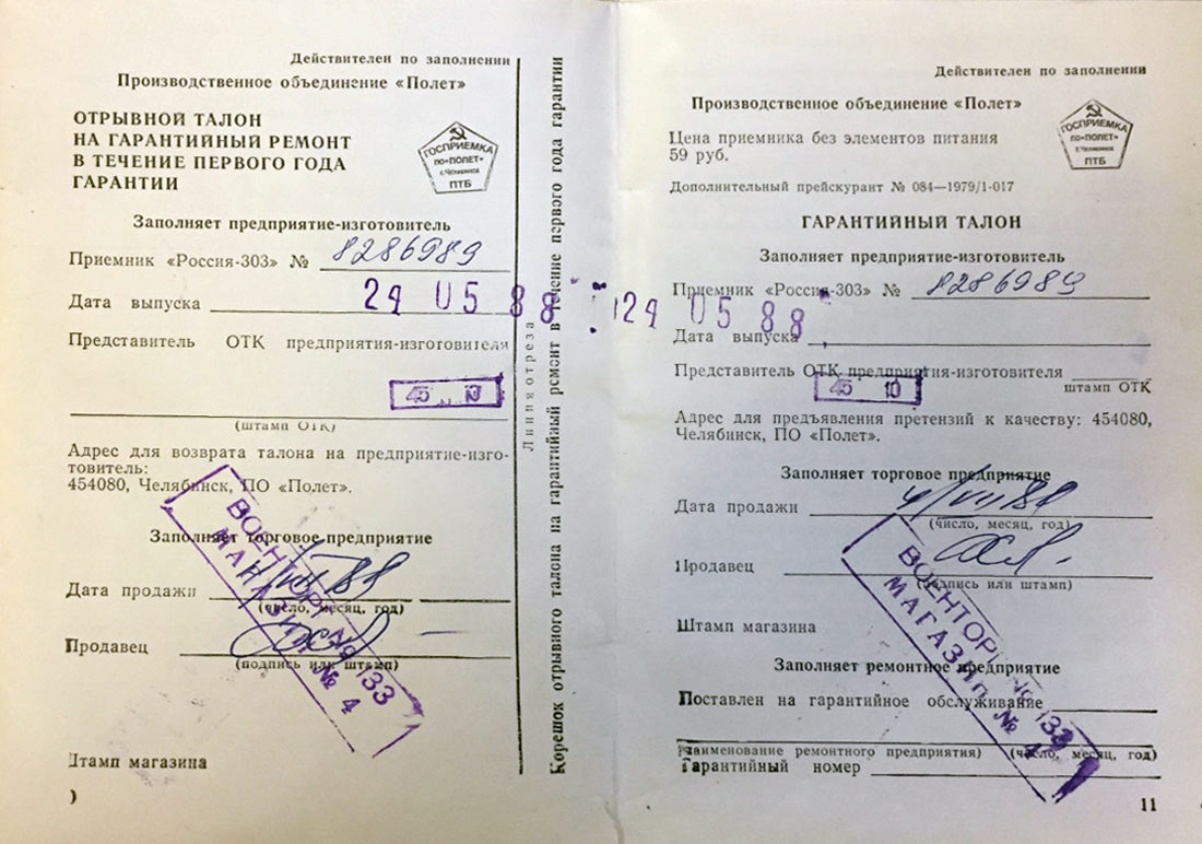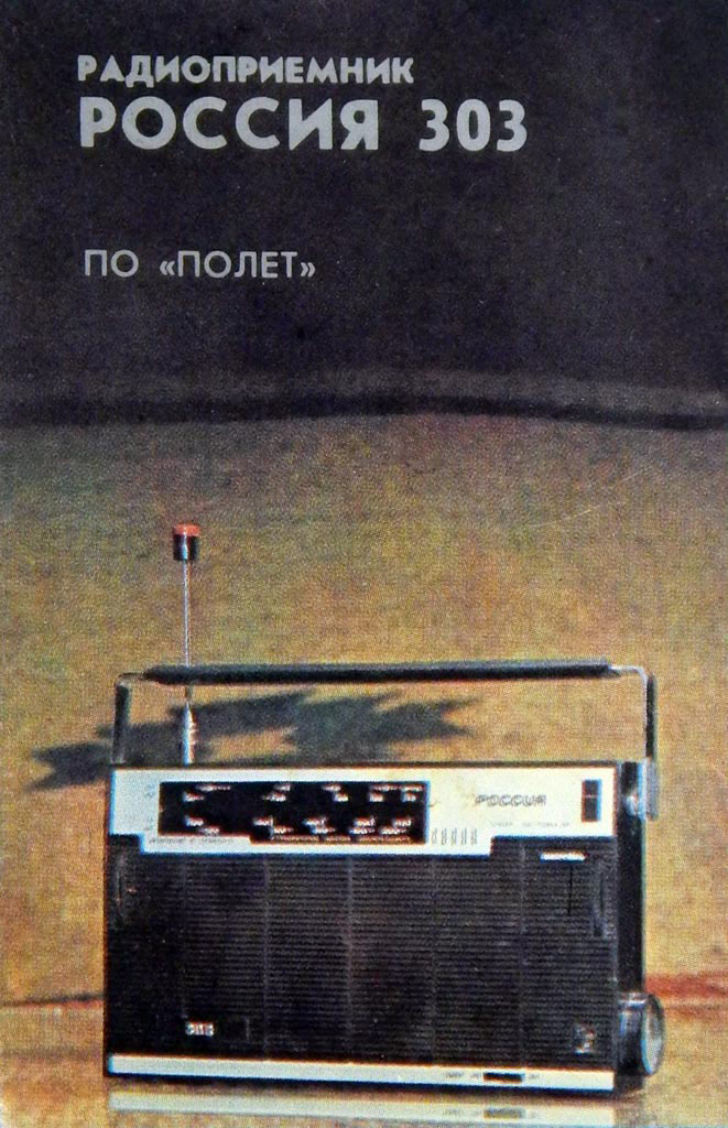 Портативный радиоприёмник *Россия-303* с 1974 года выпускало Челябинское ПО *Полёт*. Переносный радиоприёмник 3-го класса **Россия-303** собран на 8-ми транзисторах и 2-х диодах. Он предназначен для приёма радиостанций с АМ модуляцией, в диапазонах ДВ, СВ на внутреннюю магнитную антенну и в поддиапазонах KB, на телескопическую. Диапазоны частот: ДВ - 150...408 кГц, СВ - 525...1605 кГц, КВ-1 - 9,5...12,1 МГц, КВ-2 - 3,95...7,3 МГц. ПЧ равна 465 кГц. Чувствительность в диапазоне ДВ - 1,5 мВ/м, СВ - 0,7 мВ/м, KB - 100 мкВ. Селективность по соседнему каналу в ДВ и СВ - 46 дБ. Селективность по зеркальному каналу в диапазоне ДВ - 26 дБ, СВ - 30 дБ, KB - 14 дБ. Действие АРУ: при изменении входного сигнала на 26 дБ, напряжение на выходе изменяется на 6 дБ. Номинальная выходная мощность 100 мВт. Полоса воспроизводимых частот - 300...3550 Гц. Питание от 4-х элементов 316. Габариты модели 215х125х47 мм. Масса 1 кг. С 1987 года приёмник *Россия-303* именовался как *Россия РП-303*. По параметрам он аналог описанного приёмника, а оформление аналогично сиреневому приёмнику. Впрочем для увеличения ассортимента наименований продолжился выпуск и модели *Россия-303*. В процессе производства все элементы радиоприёмника, такие как громкоговоритель, пьезофильтр и резисторы и конденсаторы заменяли современными.