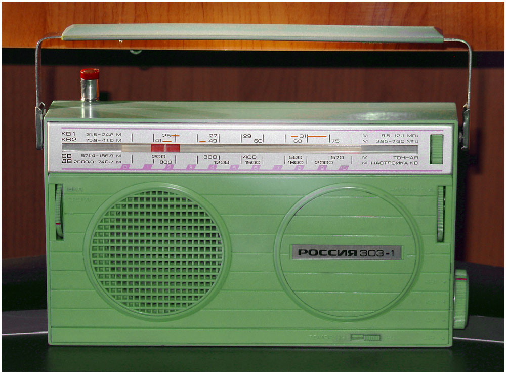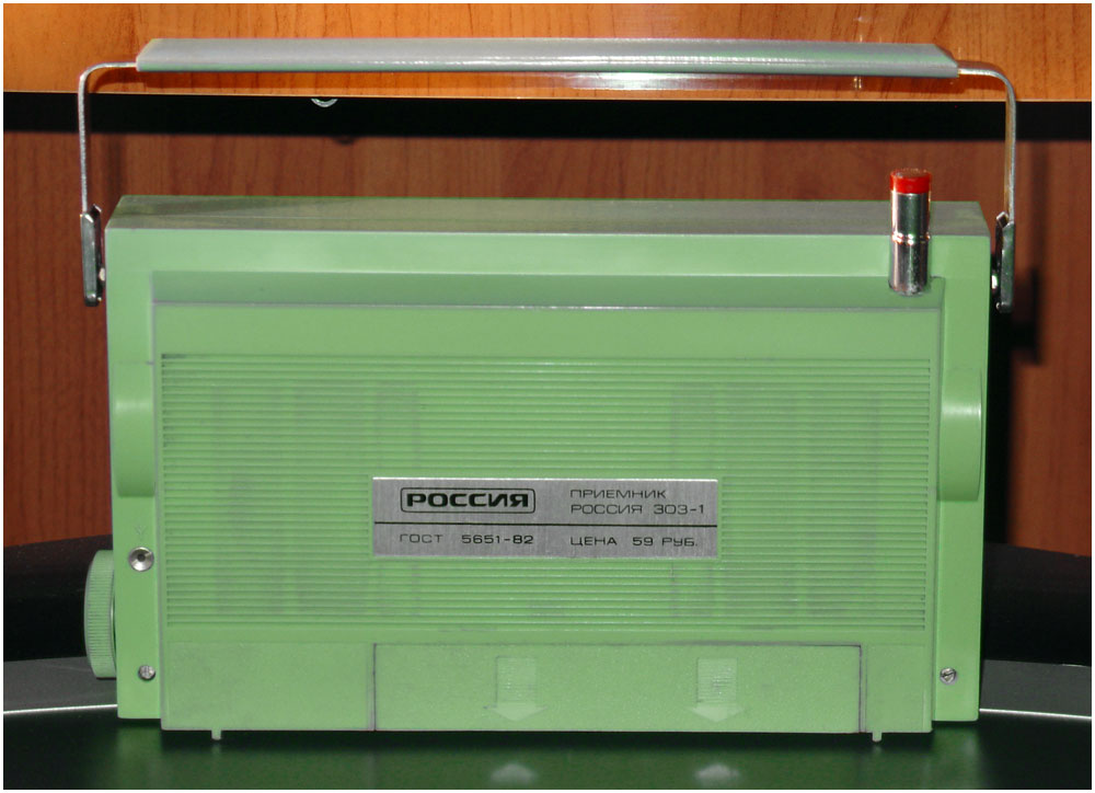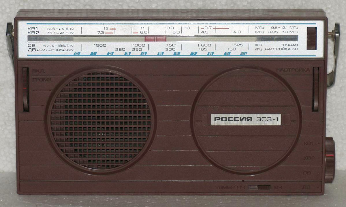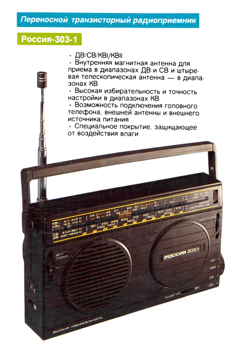 Портативный радиоприёмник *Россия-303-1* с 1982 года выпускало Челябинское ПО Полёт. Радиоприёмник создан на базе модели **Россия-303**, но в отличии от неё имеет гнездо для внешнего блока питания, который мог идти в комплекте. Соответственно изменена схема и конструкция модели. Радиоприёмник предназначен для приёма в ДВ и СВ диапазонах на магнитную антенну и в двух поддиапазонах KB на телескопическую антенну. Источник питания 4 элемента 316. Потребляемый ток, при отсутствии сигнала 10 мА. Работоспособность сохраняется при снижении напряжения питания до 3,5 В. Длительность работы при средней громкости от свежих батарей 50 часов. В приёмнике имеется регулятор точной настройки в КВ поддиапазонах, гнёзда для наружной антенны и миниатюрного телефона. Диапазоны: ДВ 150...408 кГц, СВ 525...1605 кГц, КВ1 9,5...12,1 МГц, КВ2 3,95...7,3 МГц. ПЧ 465 кГц. Чувствительность в диапазонах ДВ - 1,5 мВ/м, СВ - 0,7 мВ/м, в обоих KB поддиапазонах 100 мкВ. Селективность 46 дБ. Номинальная выходная мощность около 100 мВт, максимальная 150 мВт. Полоса воспроизводимых частот звука - 300...3550 Гц. Среднее звуковое давление 0,25 Па. Габариты приёмника 215х125х47 мм. Масса 1 кг. С 1987 года радиоприёмник выпускался под наименованием *Россия РП-303-1*.