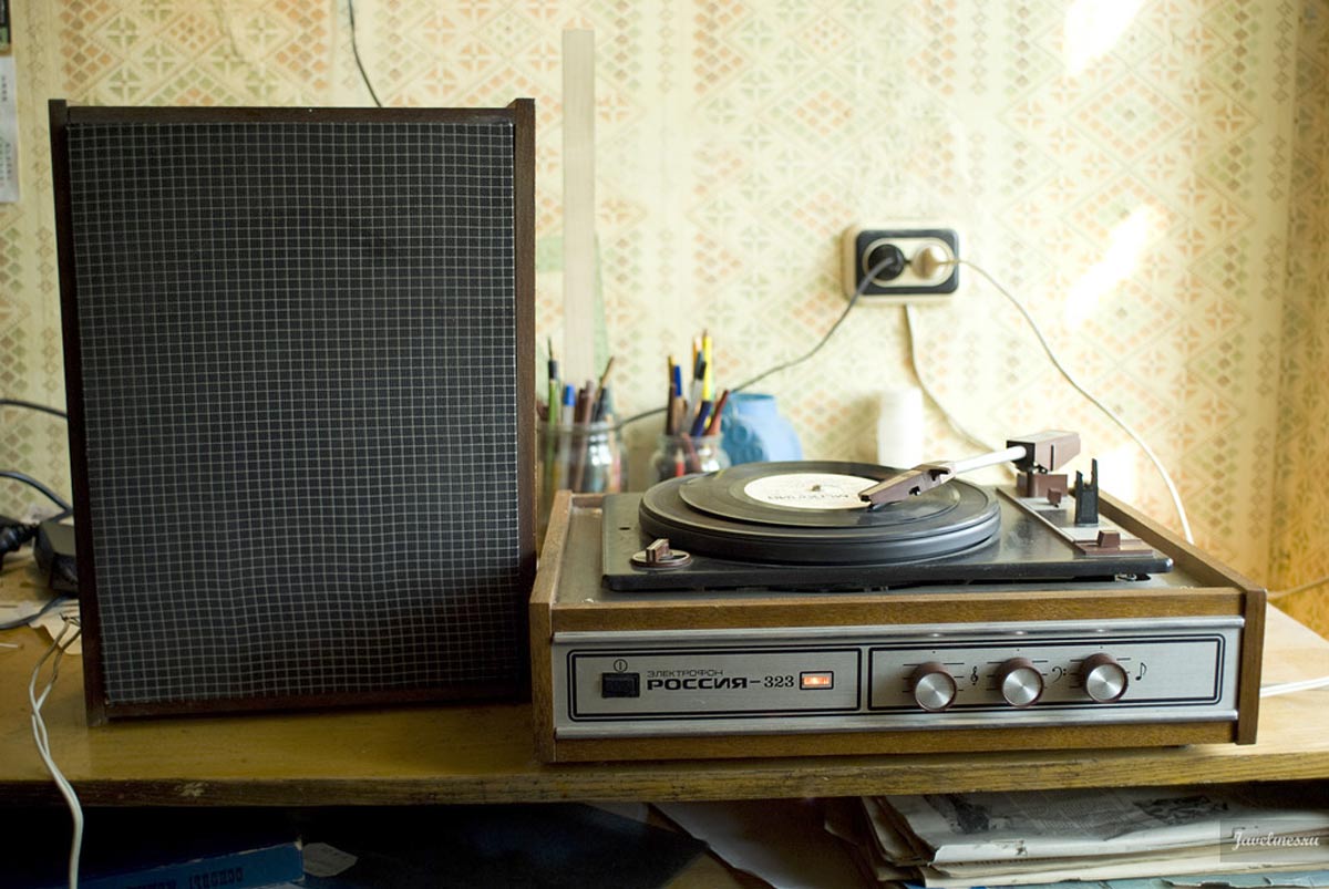 Электрофон сетевой транзисторный *Россия-323* с осени 1982 года выпускало Челябинское ПО *Полёт*. ЭФ обеспечивает воспроизведение грамзаписи и состоит из ЭПУ - III-ЭПУ-76 и усилителя НЧ, объединенных в одном корпусе и выносной акустической системы с громкоговорителем 4ГД-35 или акустической системы 8ГДШ-1. Тембр звучания устанавливается с помощью регуляторов тембров по ВЧ и НЧ частотам. Имеется возможность подключения магнитофона и трансляционной сети в режиме усиления звука. Корпуса полированы или отделаны шпоном ценных пород дерева. Частота вращения диска 33, 45 и 78 об/мин. Диапазон рабочих частот звука 80...12500 Гц. КНИ 2,5%. Номинальная выходная мощность 1,5 Вт, максимальная 4 Вт. Сопротивление АС 4 Ом. Потребляемая мощность 30 Вт. Габариты электрофона 395х325х150 мм, АС - 365х270х140 мм. Общий вес 12 кг. Цена аппарата с 1984 года 63 рубля, с 1985 года 55 рублей.