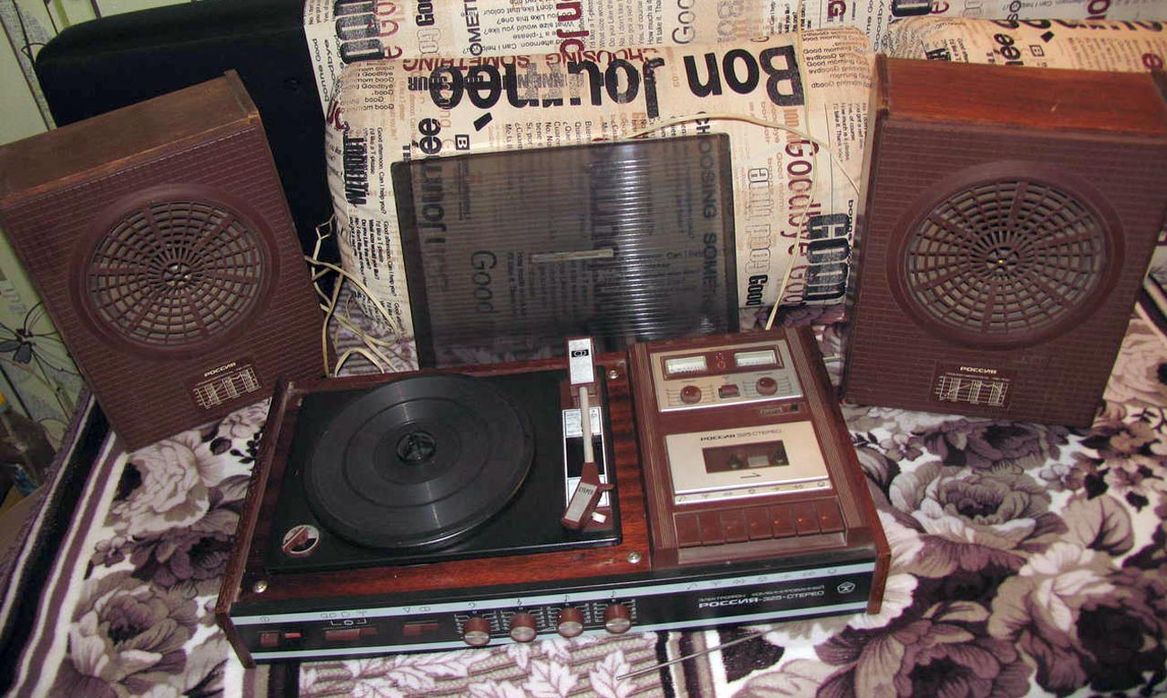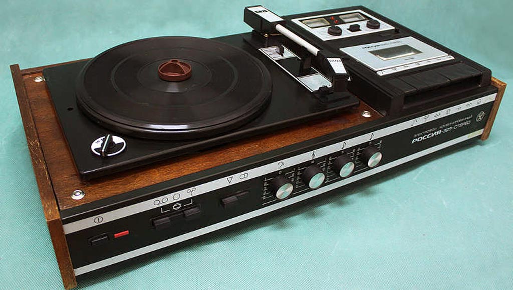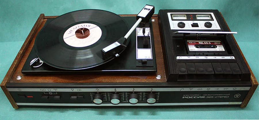 Электрофон комбинированный *Россия-325-стерео* с I-кв 1985 года выпускало Челябинское ПО *Полёт. Устройство обеспечивает воспроизведение моно и стереофонических грампластинок, а также запись моно и стереофонических фонограмм с последующим их воспроизведением через АС и стереотелефоны. Аппарат состоит из III-ЭПУ-74С, магнитофонной кассетной панели и двухканального усилителя, объединённых в общем корпусе, а также двух выносных АС. Модель имеет: раздельные регуляторы громкости, стереобаланса, тембров ВЧ и НЧ, микролифт и автостоп в ЭПУ, автоматический останов при окончании ленты, клавишу временной остановки ленты, счётчик ленты, стрелочные индикаторы уровня записи, световой индикатор режима записи, регуляторы уровня записи и громкости на стереотелефоны. Есть возможность подключения микрофона, стереотелефонов и источников звуковых программ на запись. Частота вращения диска 33; 45; 78 об/мин. Диапазон воспроизводимых частот: при воспроизведении грамзаписи 40...12500 Гц, магнитной записи 80...12500 Гц. Тип ленты А4205-3. Коэффициент детонации: электрофона 0,25%, МП 0,3%. Относительный уровень шумов и помех в канале записи-воспроизведения -48 дБ. Уровень фона -53 дБ. Максимальная выходная мощность 2х5 Вт. Потребляемая от сети мощность 40 Вт. Габариты модели 590х325х165 мм. Вес 19 кг. Цена 180 рублей. Электрофон и приставка с начала выпуска были отдельными блоками и приставка подключалась к электрофону кабелем (изображение первой модели есть в справочнике МРБ-1164), затем после модернизации в 1986 году оба устройства были конструктивно объединены в общем корпусе. АС были без наименования, с громкоговорителями типа 8ГД-Ш-1 (или типа 4ГД-15) и радиотканью были постепенно заменены на фирменные с громкоговорителями 4ГД-35. Устройство стало именоваться как *Россия-325С-1*, но ещё долгое время использовалось и его прежнее наименование *Россия-325-стерео*.