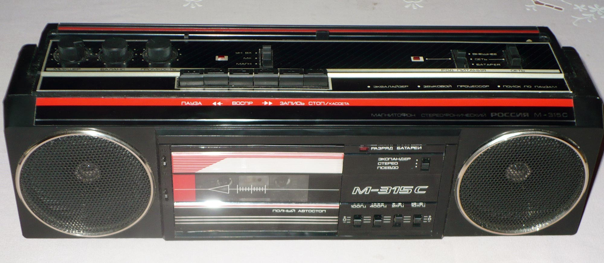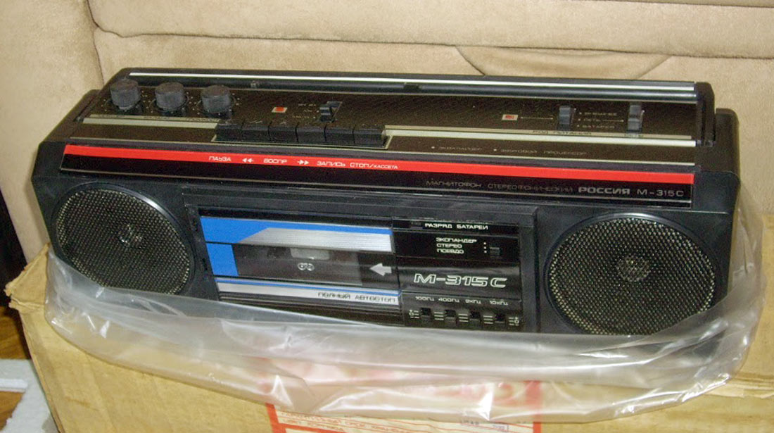 Стереофонический кассетный магнитофон *Россия М-315С* с начала 1987 года выпускало Челябинское ПО Полёт. Магнитофон *Россия М-315* кроме отсутствия радиоприёмника и соответствующих изменений конструкции и схемы не отличается от магнитолы *Россия РМ-212* этого же завода и года выпуска. Магнитофон имеет переключатель типа магнитной ленты, поиск фонограмм по паузам, 4-х полосный эквалайзер, регулятор громкости, балланса, функцию расширения стереобазы. Диапазон рабочих звуковых частот по звуковому давлению 150...10000 Гц, по напряжению 70...14000 Гц. Номинальная выходная мощность 1,5. Питание от батарей и от электрической сети, через встроенный блок питания.