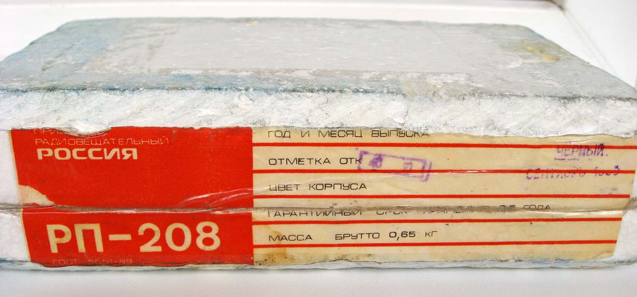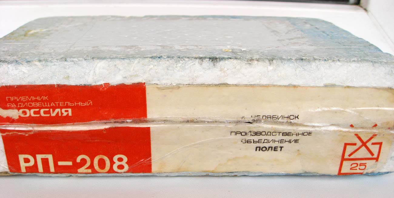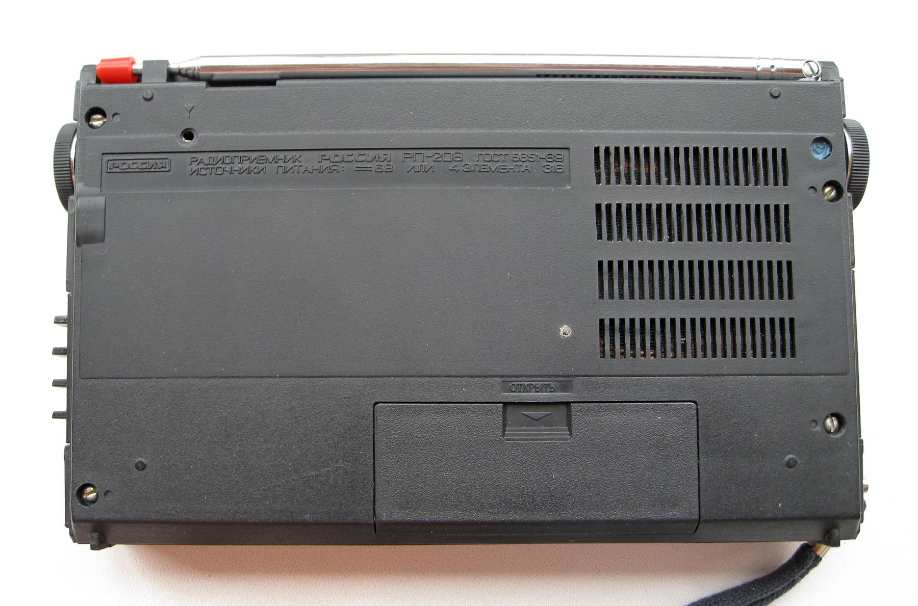 Портативный радиоприёмник *Россия РП-208* выпускался предположительно с 1993 года Челябинским ПО ”Полёт”. Радиоприёмник работает в диапазонах: ДВ 148,5...283,5 кГц; СВ 576,5...1606,5 кГц; КВ-2 5,8 ...7,3 МГц; КВ-1 9,5...12,1 МГц. В радиоприёмнике предусмотрены: возможность подключения внешней антенны; внешнего источника питания; наушников; подсветка шкалы; двухпозиционный переключатель тембра ВЧ и НЧ; регулировка точной настройки в КВ диапазонах; световой индикатор наличия станции. Питание 6 В. Габариты модели 198х115х37,5 мм. Вес 0,6 кг.