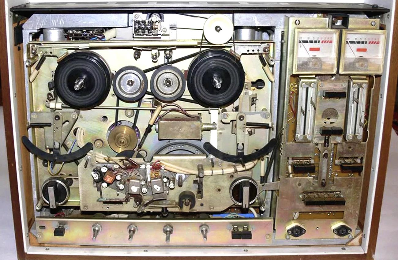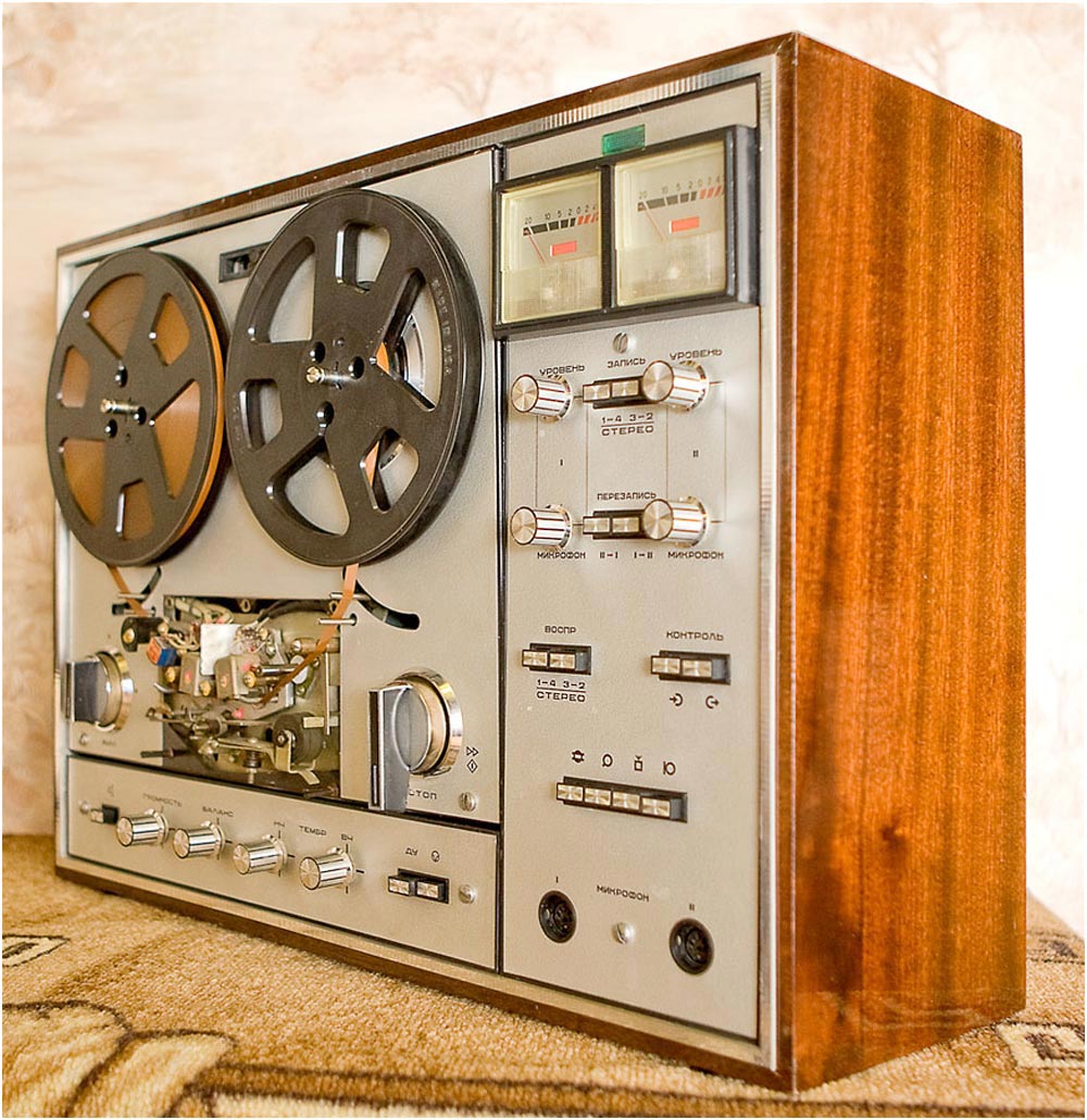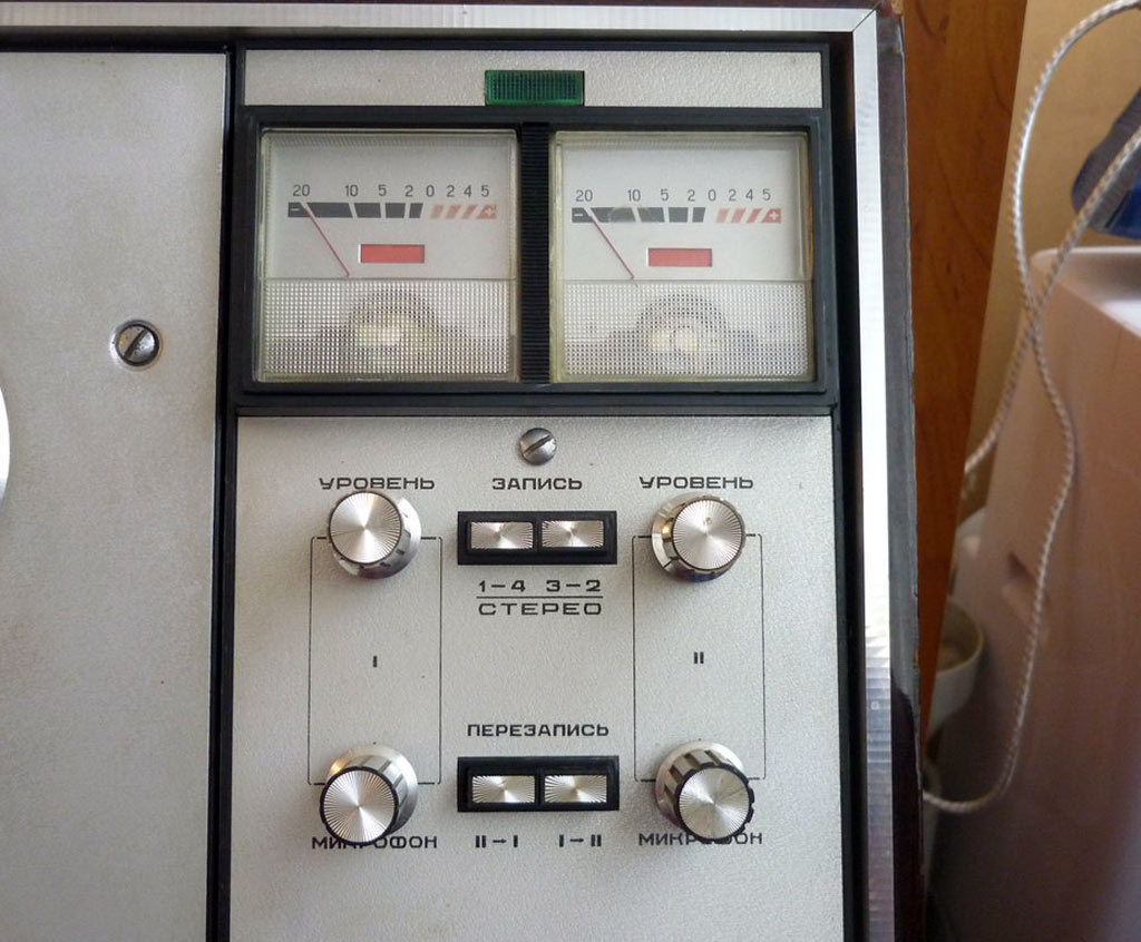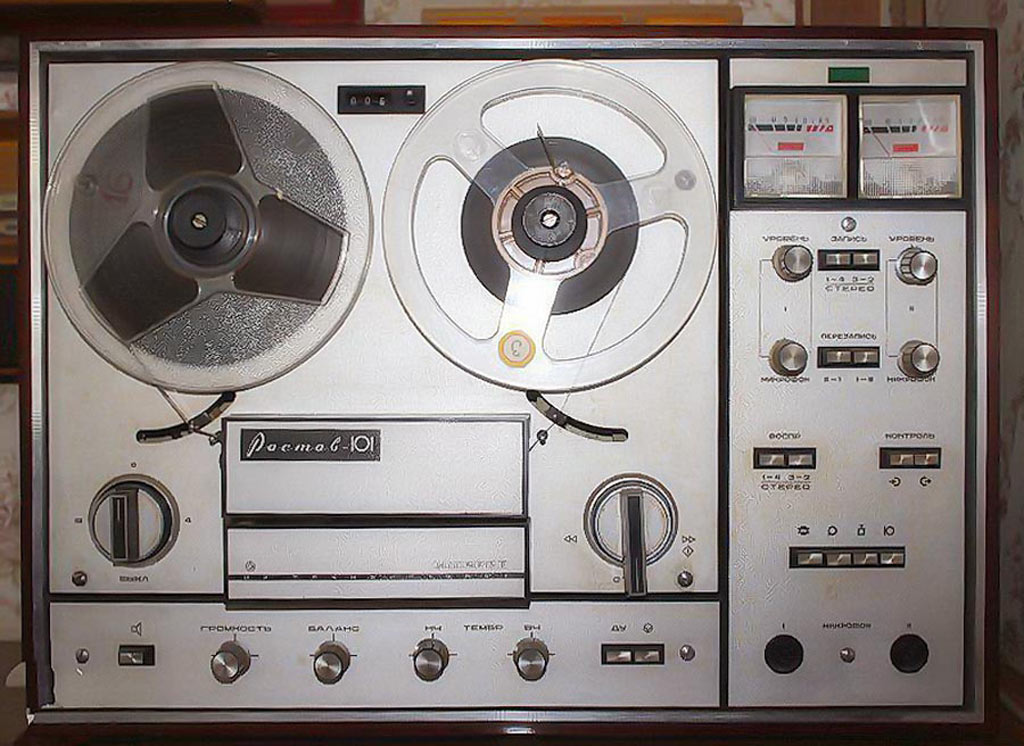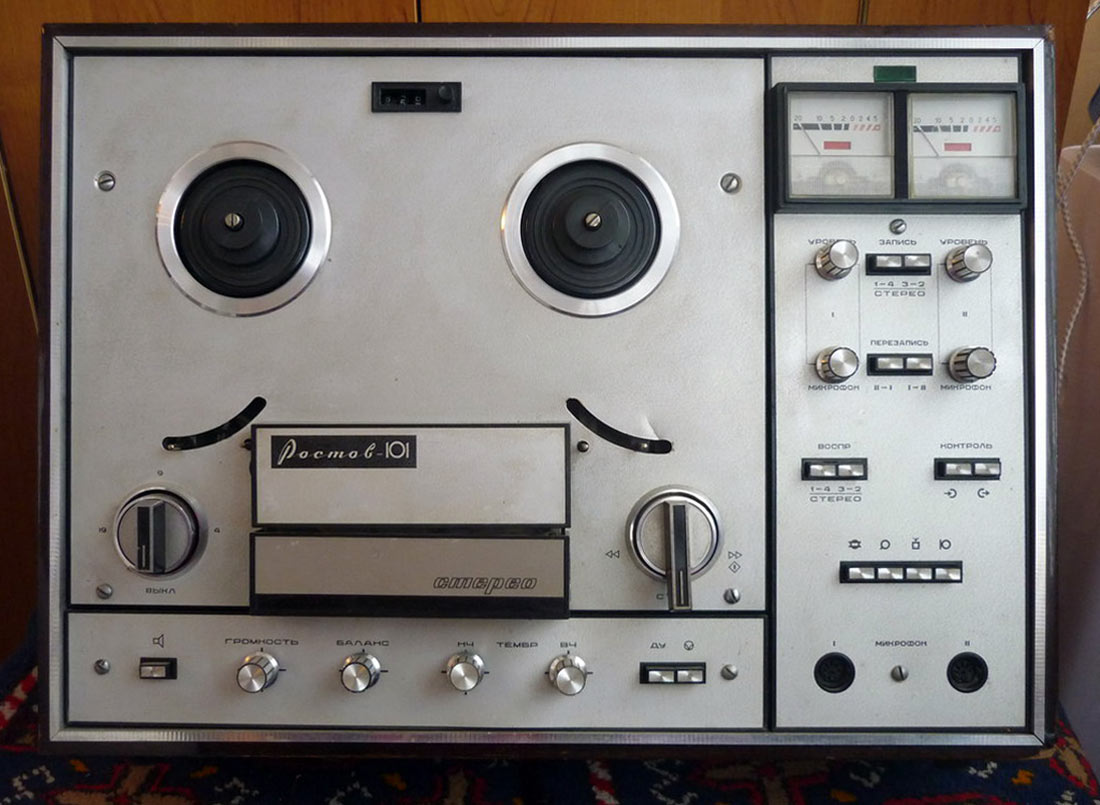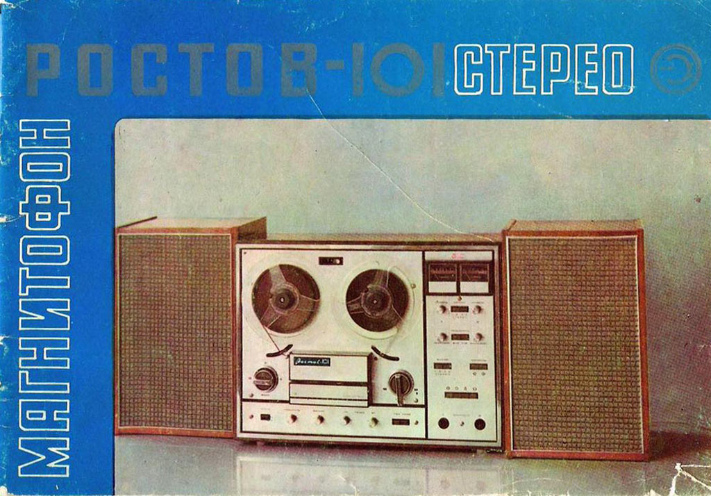 Стереофонический катушечный магнитофон *Ростов-101-стерео* с 1975 года выпускал Ростовский завод *Прибор*. Он обеспечивает высококачественную запись и воспроизведение фонограмм с микрофона, звукоснимателя, приёмника, телевизора, другого магнитофона и радиолинии. В модели предусмотрены: регулировка и визуальный контроль уровня записи по каждому каналу при неподвижной и движущейся ленте: контроль качества записи на слух: перезапись с дорожки на дорожку с одновременной записью со входа **микрофон**: световая индикация включения записи раздельно по каналам: наложение новой записи на старую; автостоп, срабатывающий при обрыве и окончании ленты; счётчик ленты, устройство очистки ее от пыли. Совместно с АС магнитофон может быть использован в качестве двухканального усилителя. ЛПМ выполнен по одномоторной кинематической схеме на электродвигателе КД6-4. Скорости движения ленты: 19,05, 9,53 и 4,76 см/с при коэффициентах детонации соответственно ±0,1: ± 0,2, ± 0,5%. Запись четырехдорожечная на магнитную ленту типа А4403-6, А4407-6Б или А4408-6Б. При использовании катушек №18 вмещающих 525 метров ленты длительность записи одной дорожки на скорости 19,05 см/сек не менее 45 мин, на средней 1,5 часа, на меньшей 3 часа. Длительность перемотки 3 минуты. Номинальная выходная мощность усилителя ЗЧ магнитофона при работе на АС **10МАС-1** с сопротивлением по входу 8 Ом - 6х2 Вт. Диапазон рабочих частот на скорости: 19,05 - 40...18000 Гц. 9,53 - 40...14000 Гц и 4,76 см/с 63...8000 Гц. Коэффициент гармоник на ЛВ по сквозному каналу на частоте 400 Гц на скорости: 19,05, 9.53 см/с - 3%, на скорости 4,76 см/с - 4%. Относительный уровень помех в канале воспроизведения -44/48 дБ. Питание от сети. Потребляемая мощность 150 Вт. Размеры магнитофона 540 х 405 х 210 мм. Масса 25 кг.