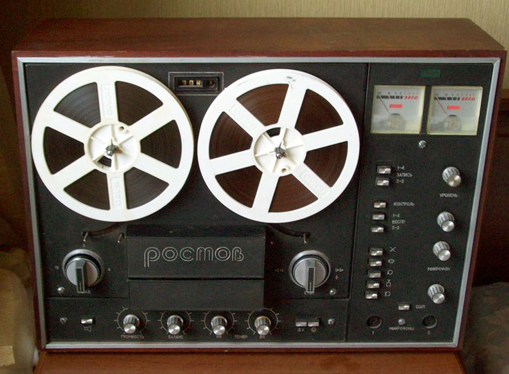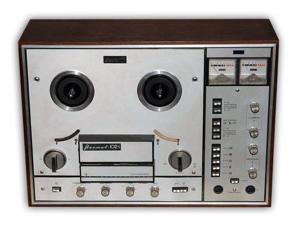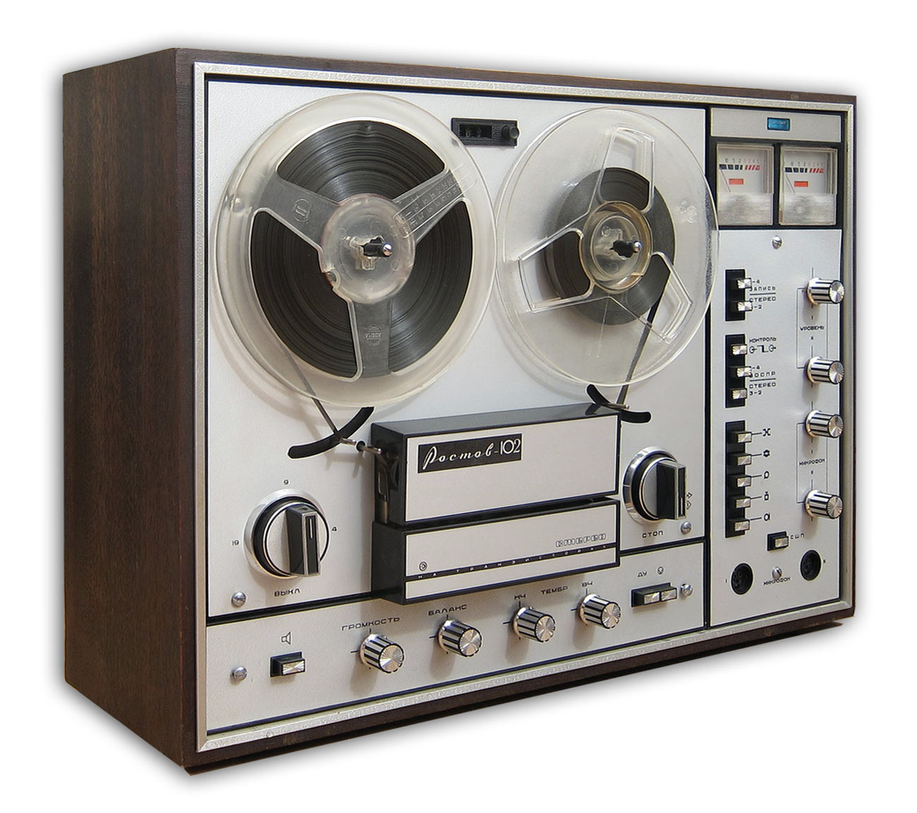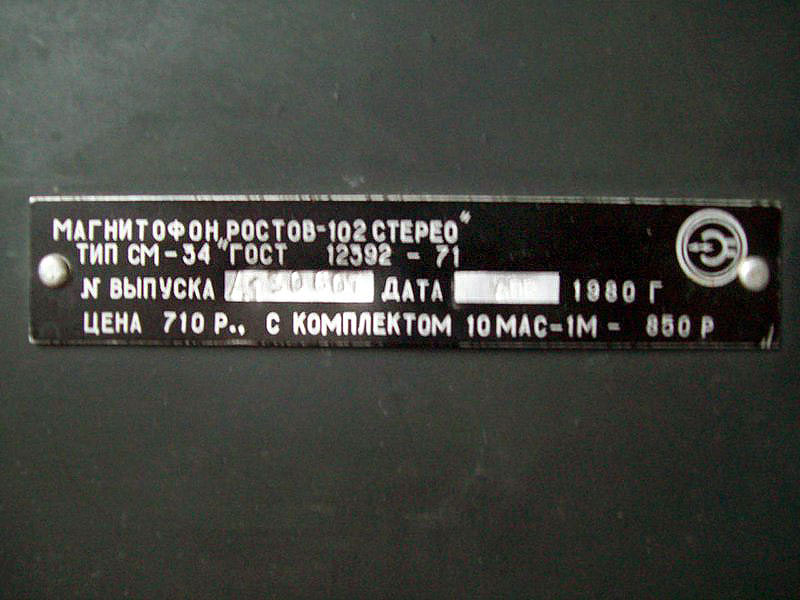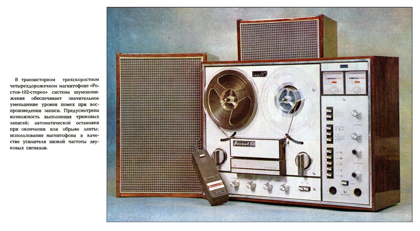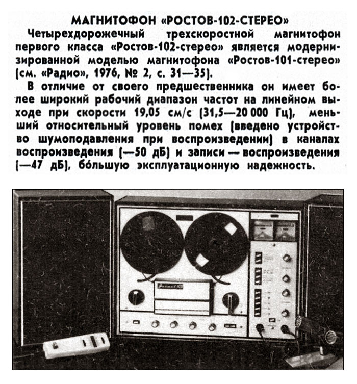 Катушечный магнитофон *Ростов-102 стерео* с 1978 года выпускал Ростовский завод *Прибор*. Магнитофон выполняет обычные записи и например трюковые, смешивая сигналы со входа микрофон и другого, перезапись с дорожки на дорожку с добавлением новой программы. Модель имеет: проводной ПДУ; 3-х декадный счётчик ленты с кнопкой сброса; стрелочные индикаторы уровня записи; автоматической остановкой ЛПМ по окончании и обрыве ленты. От прошлой модели отличается СШП, которая повышает качество записей. Число дорожек записи и воспроизведения 4. Тип магнитной ленты - А4407-6Б. Номер катушки 18. Скорость движения ленты 19,05; 9,53; 4,76 см/с. Диапазон частот на скорости 19,05 см/сек - 40...18000 Гц, 9,53 см/сек - 40...14000 Гц. 4,76 см/сек - 63...8000 Гц. Коэффициент детонации 0,1; 0,2; 0,5 %. Сопротивление АС - 8 Ом. Номинальная выходная мощность - 2х6 Вт. Потребляемая мощность 150 Вт. Габариты модели 540 х 400 х 215 мм. АС - 422 х 272 х 234 мм. Масса магнитофона 25 кг. Одной АС 8,5 кг. Цена 850 рублей. С 1982 года завод выпускал магнитофон *Ростов-102-1-стерео* имеющий более высокие характеристики.