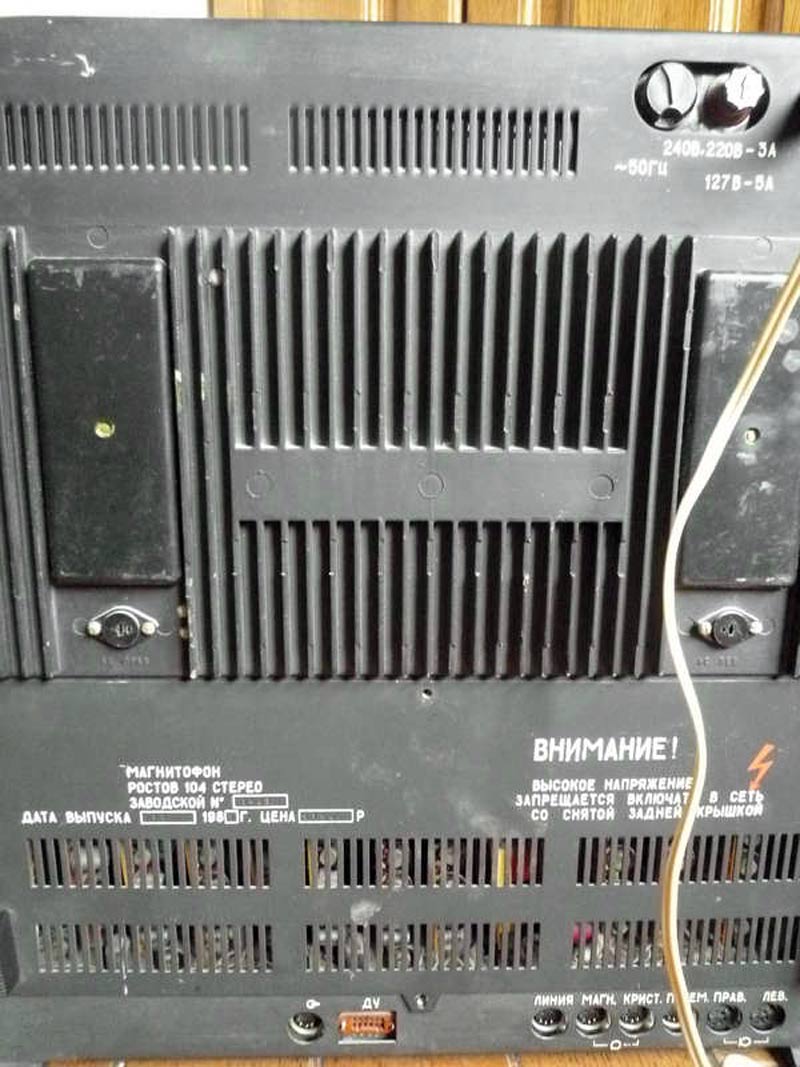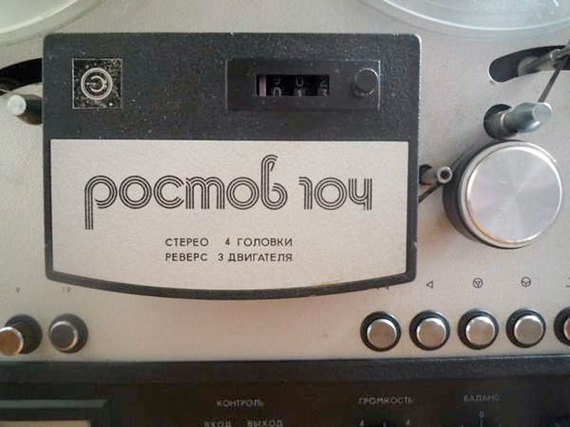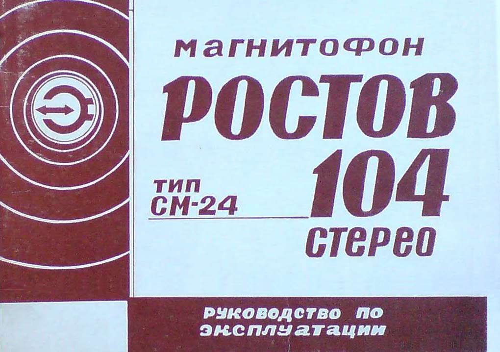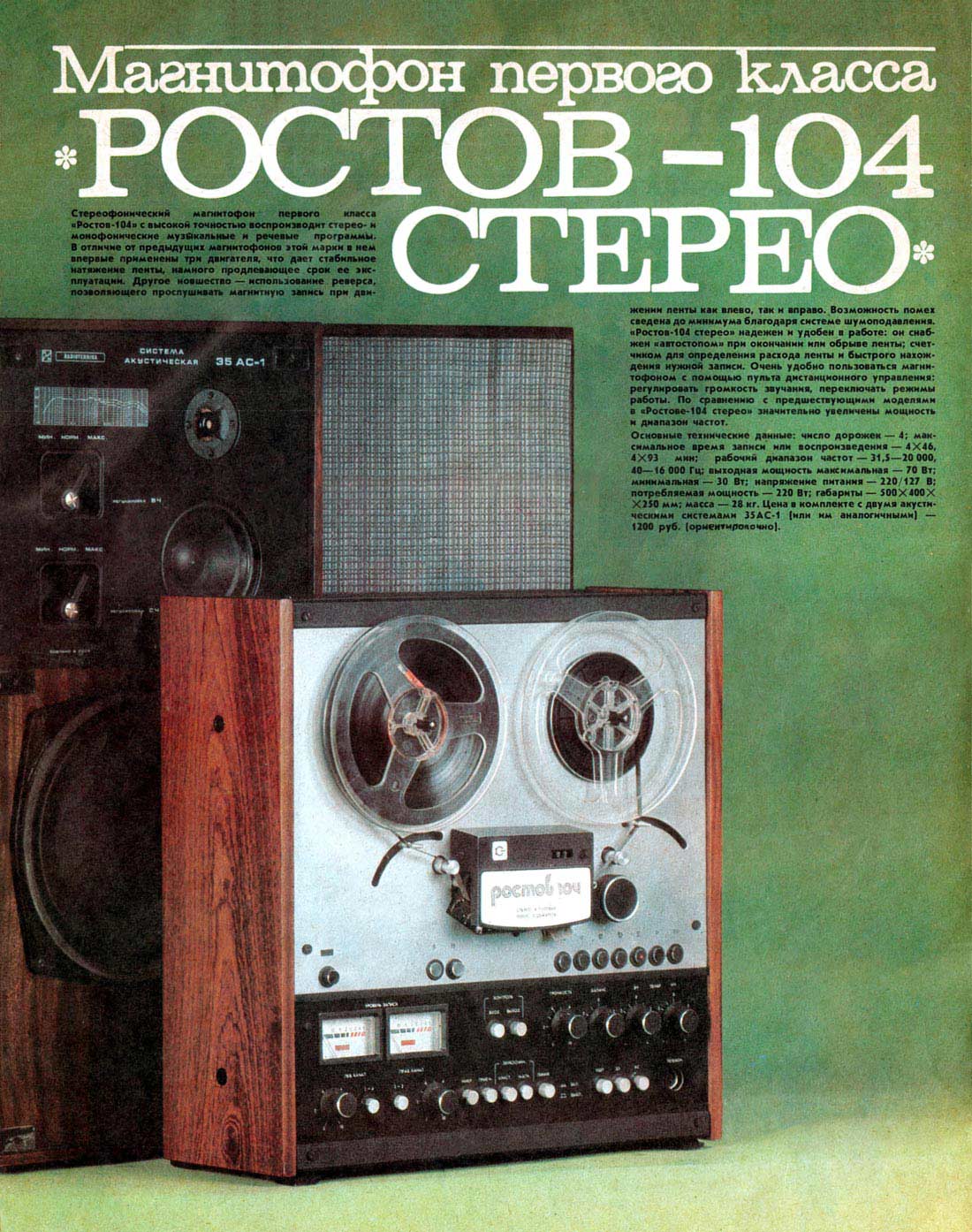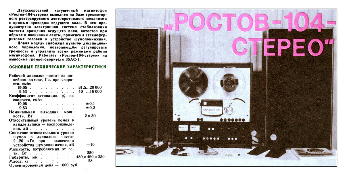 Катушечный магнитофон *Ростов-104-стерео* с 1979 года выпускал Ростовский завод *Прибор*. 2-х скоростной катушечный магнитофон первого класса **Ростов-104-стерео** выполнен на базе трёхмоторного реверсируемого ЛПМ с прямым приводом ведущего вала. В магнитофоне имеется электронная система стабилизации частоты вращения ведущего вала, автостоп при обрыве или окончании ленты, стеклоферритовые головки, устройство шумопонижения. Магнитофон снабжён пультом для дистанционного управления, позволяющим управлять всеми режимами работы магнитофона. Работает магнитофон **Ростов-104-стерео** на две акустические системы 35AC-1. Рабочий диапазон частот на линейном выходе на скорости: 19,05 см/сек - 31,5...20000 Гц, 9,53 см/сек - 40...16000 Гц. Коэффициент детонации на скорости 19,05 см/сек 0,1%, 9,53 см/сек 0,2%. Номинальная выходная мощность 2х30 Вт. Относительный уровень шумов в канале З-В -49 дБ. Снижение уровня шумов в диапазоне частот 2-20 кГц при включении ШП -10 дБ. Потребляемая мощность 250 Вт. Габариты модели 480x460x250 мм. Его масса 28 кг. Розничная цена 2280 рублей.