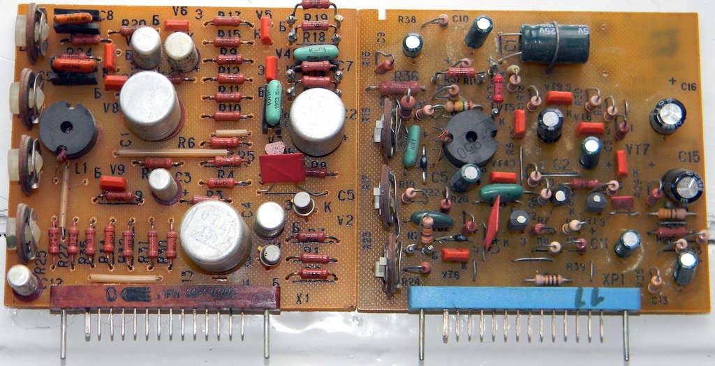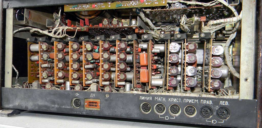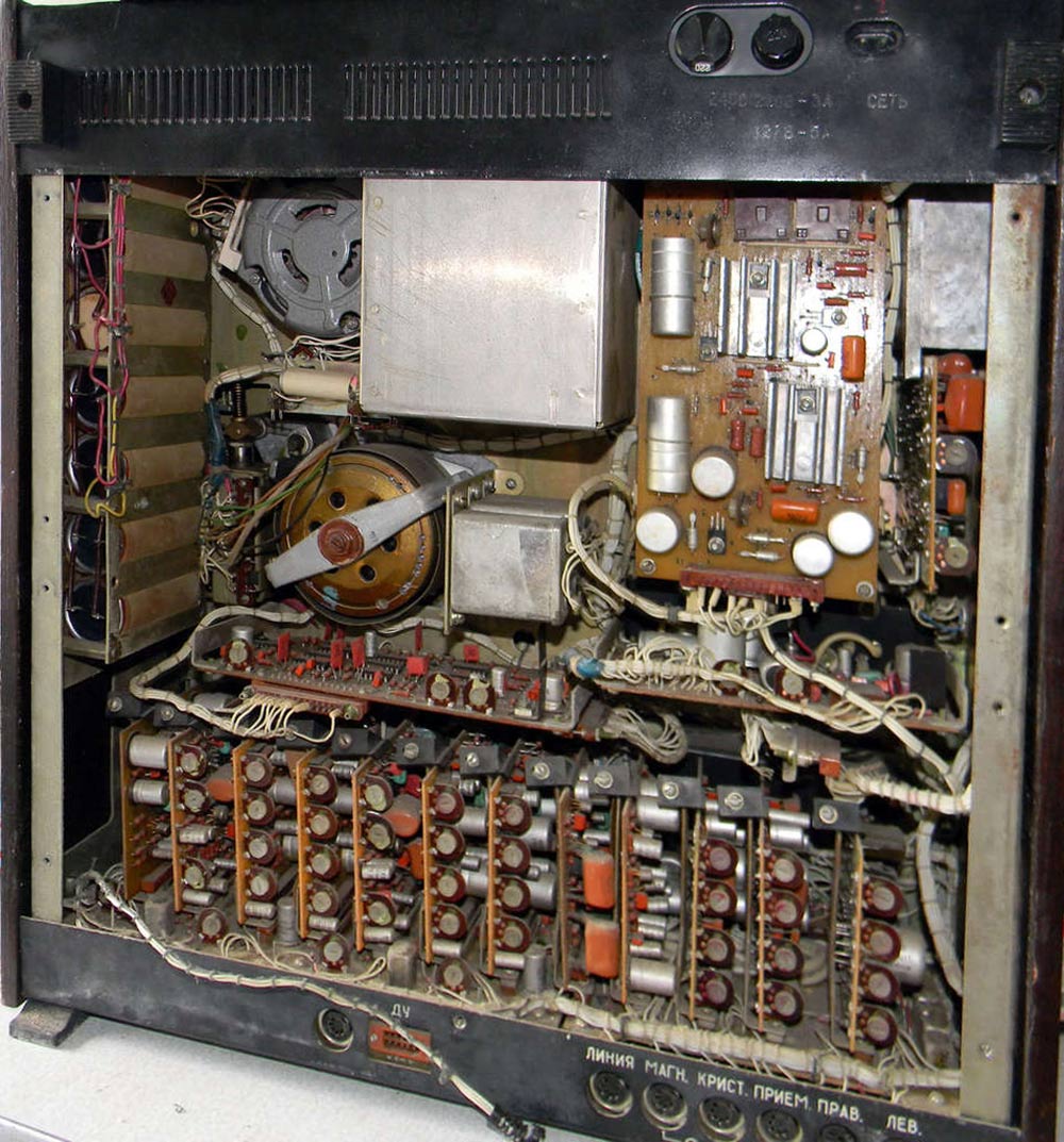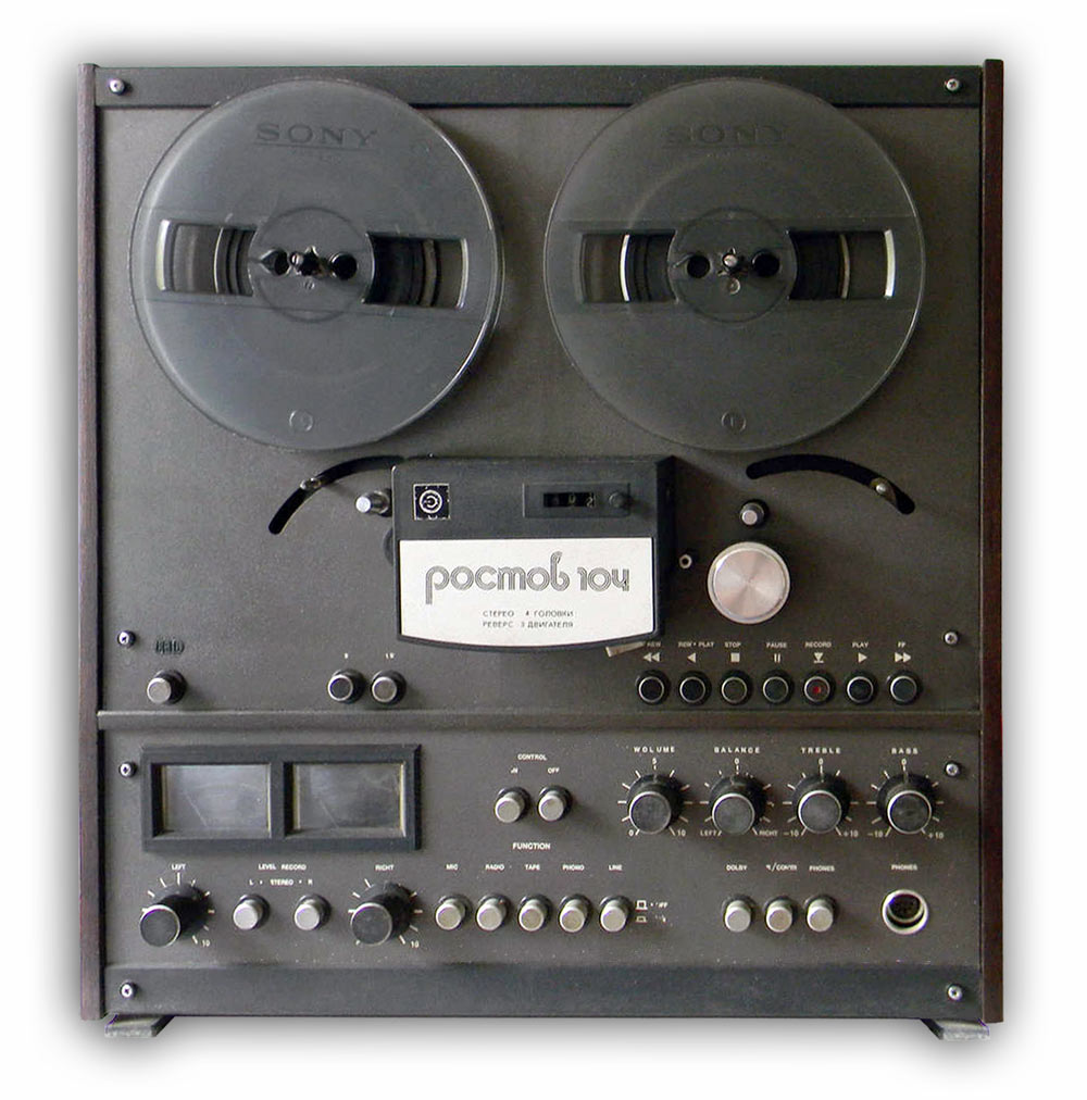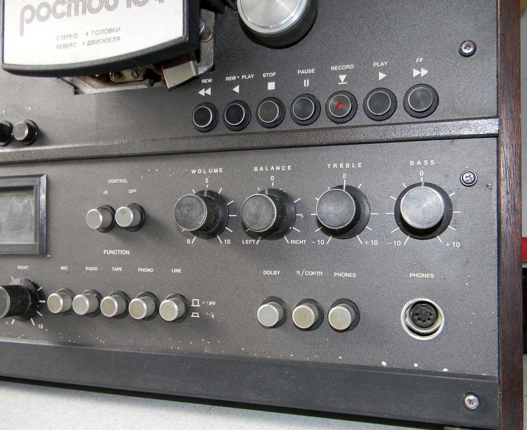 Катушечный магнитофон *Ростов-104-стерео* с 1979 года выпускал Ростовский завод *Прибор*. 2-х скоростной катушечный магнитофон первого класса **Ростов-104-стерео** выполнен на базе трёхмоторного реверсируемого ЛПМ с прямым приводом ведущего вала. В магнитофоне имеется электронная система стабилизации частоты вращения ведущего вала, автостоп при обрыве или окончании ленты, стеклоферритовые головки, устройство шумопонижения. Магнитофон снабжён пультом для дистанционного управления, позволяющим управлять всеми режимами работы магнитофона. Работает магнитофон **Ростов-104-стерео** на две акустические системы 35AC-1. Рабочий диапазон частот на линейном выходе на скорости: 19,05 см/сек - 31,5...20000 Гц, 9,53 см/сек - 40...16000 Гц. Коэффициент детонации на скорости 19,05 см/сек 0,1%, 9,53 см/сек 0,2%. Номинальная выходная мощность 2х30 Вт. Относительный уровень шумов в канале З-В -49 дБ. Снижение уровня шумов в диапазоне частот 2-20 кГц при включении ШП -10 дБ. Потребляемая мощность 250 Вт. Габариты модели 480x460x250 мм. Его масса 28 кг. Розничная цена 2280 рублей.