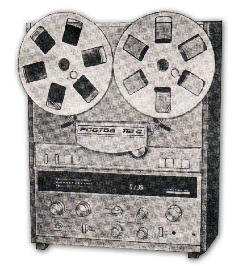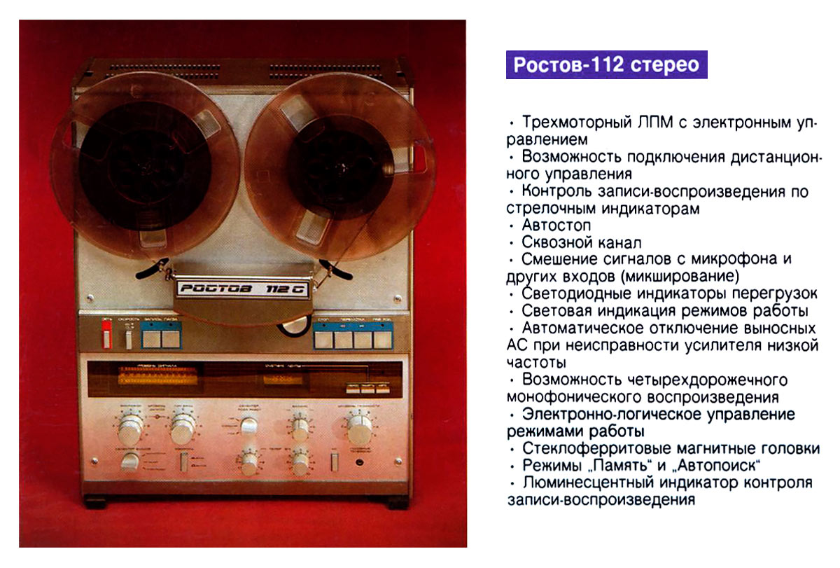 Катушечный магнитофон *Ростов-112-стерео* в 1988 году опытно (~10 штук) выпустил Ростовский завод *Прибор*. Стереофонический магнитофон 1-й группы сложности с применением интегральных схем **Ростов-112-стерео** обеспечивает запись моно и стереофонических фонограмм с их последующим воспроизведением через выносные АС или стереотелефоны. В магнитофоне применены: трехмоторный ЛПМ; автоматическое управление натяжением магнитной ленты; автоматическая стабилизация скорости перемотки ленты; электронно-логическое управление режимами работ, позволяющее выбирать режимы работ в любой последовательности; стеклоферритовые магнитные головки, отличающиеся повышенной износоустойчивостью, а так же электронный счетчик расхода ленты с устройствами «Память», «Автопоиск». Есть возможность: выполнения трюковых записей смешиванием сигнала со входа «Микрофон» и любого другого; автоматического останова при окончании или обрыве ленты; контроля уровня записи или воспроизведения по электронным люминесцентным индикаторам; световой индикации режимов работы «Запись», «Рабочий ход», «Пауза», «Останов»; управления с помощью псевдосенсорного переключателя режимами работы ЛПМ; дистанционного управления режимами работы: «Перемотка», «Воспроизведение» и «Останов»; контроля записанного сигнала в режиме «Запись»; автоматического отключения выносных АС при неисправности усилителя; работы магнитофона в режиме «Усилитель»; световой индикации включения в электросеть. Наличие раздельных магнитных головок записи/воспроизведения даёт возможность прослушивать записанный сигнал во время записи. В комплект магнитофона входят также две катушки (в том числе катушка с магнитной лентой). Тип магнитной ленты А4416-6Б. Номер катушки 18; 22. Скорость магнитной ленты 19,06; 9,53 см/с. Максимальное время записи при воспроизведения 2х45; 2х90 мин. Рабочий диапазон звуковых частот 25...25000; 40...14000 Гц. Коэффициент детонации не более ±0,09 и ±0,15% Коэффициент гармоник на линейном выходе не более 1%. Относительный уровень шумов и помех в канале записи-воспроизведения -63 дБ. Выходная мощность: максимальная 2х50 Вт, номинальная 2х15 Вт. Входное сопротивление внешнего громкоговорителя 4 Ом. Потребляемая мощность 200 Вт. Габариты модели 510х417х225 мм. Масса 23 кг. С 1990 года по новому ГОСТу завод выпускал магнитофон *Ростов МК-112С*, полный аналог описанного.