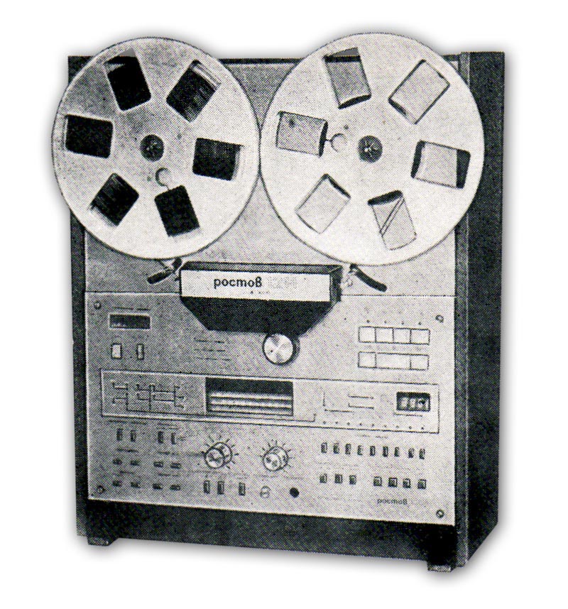 Магнитофон-приставка *Ростов-121-стерео* подгоовлен к выпуску с 1988 года Ростовским заводом *Прибор*. Стереофонический катушечный 2-х скоростной магнитофон-приставка первой группы сложности с применением интегральных схем **Ростов-121-стерео** обеспечивает запись моно и стерео фонограмм, с последующим воспроизведением магнитозаписи через УКУ или стереофонические усилители, имеющие АС; может использоваться и автономно для прослушивания фонограмм через стереотелефоны. В МП применены: трехмоторный лентопротяжный механизм; автоматическое управление натяжением магнитной ленты и автоматическая стабилизация скорости перемотки ленты; стеклоферритовые магнитные головки; светодиодный дисплей отображающий дополнительную информацию о работе МП; электронно-логическое управление режимами работ, позволяющее производить выбор режима работ в любой последовательности, а также электронный счетчик расхода ленты. Имеется возможность: выполнения трюковых записей путем смешивания сигналов; контроля уровня записи или воспроизведения по электронным люминесцентным индикаторам; световой индикации режимов работы **Запись**, **Рабочий ход**, **Обратный ход**, **Пауза**, **Останов**; беспроводного ПДУ на ИК-лучах режимами работы ЛПМ, уровня громкости, баланса, тембра по высшим и низшим частотам, на регулируемом линейном входе и выходе для подключения стереотелефонов; переключения размера применяемой катушки с индикацией готовности на дисплее; автоматической установки уровня записи, с индикацией на дисплее; управления с помощью псевдосенсорного переключателя всех режимов работы магнитофона; определения наличия фонограммы в режиме перемотки; остановки магнитной ленты по достижении нулевых показаний счётчика; откат ленты к нулевым показаниям счётчика с последующим воспроизведением; автоматического многократного воспроизведения фонограмм, между нулевой отметкой и адресом по счётчику; автоматического циклического перехода в режим **Обратный ход** из режима **Рабочий ход** и наоборот по показанию счетчика; работы магнитофона в режиме **Усилитель**; индикатор сети. Тип магнитной ленты А4416-6Б. Номер катушки 18; 22. Скорость магнитной ленты 19,05; 9,53 см/с. Максимальное время записи и воспроизведения 2х45; 2х90 мин. Рабочий диапазон звуковых частот 25...28000; 40...16000 Гц. Коэффициент детонации ±0,08; 0,15%. Коэффициент гармоник на ЛВ 0,7%. Относительный уровень шумов и помех в канале записи-воспроизведения минус 63 дБ. Напряжение питания 220 В. Потребляемая мощность 90 Вт. Габариты аппарата 510х417х125 мм. Его масса 21 кг.