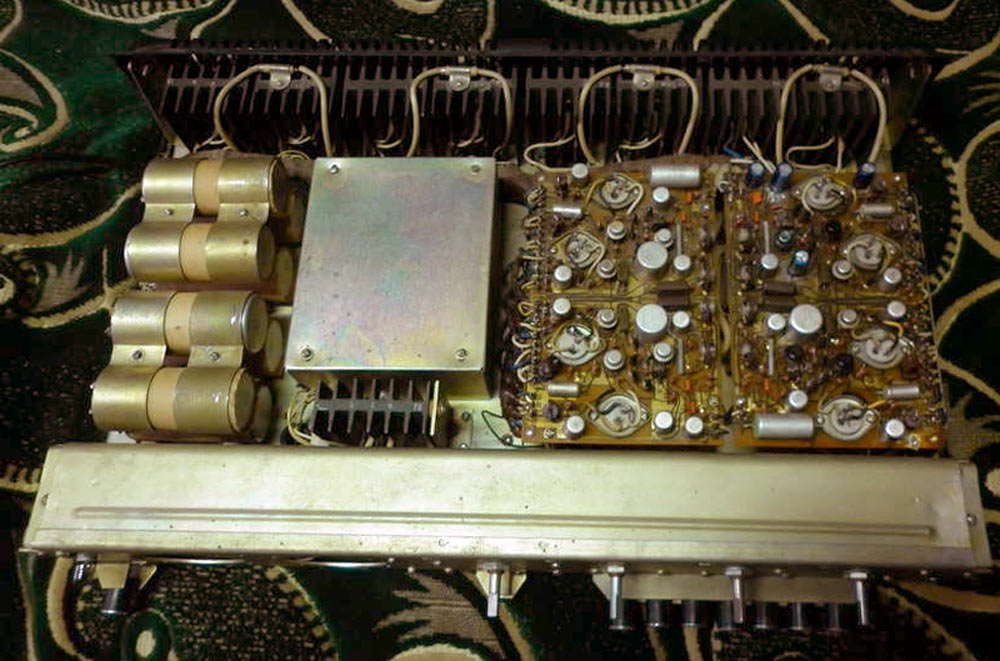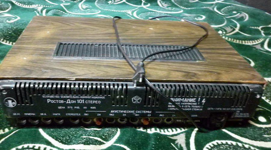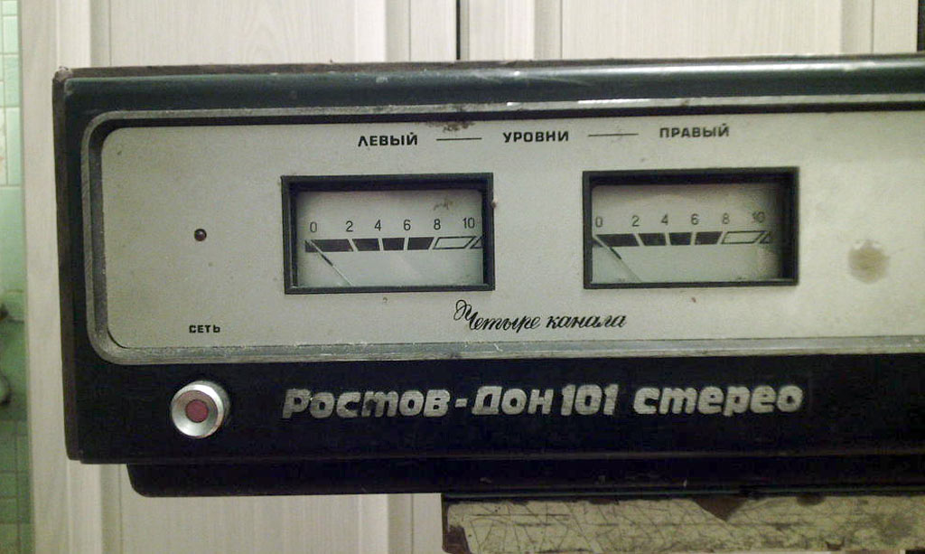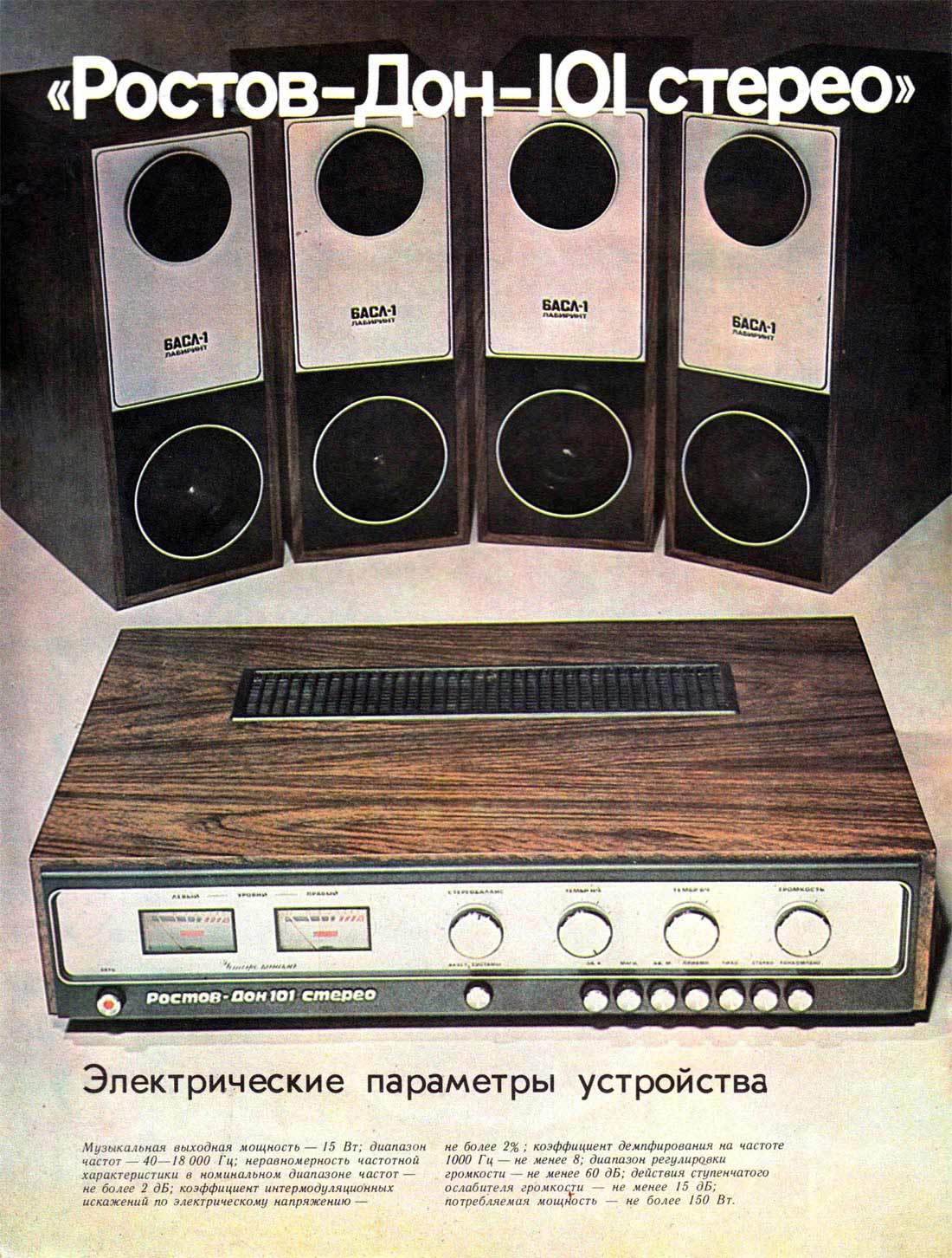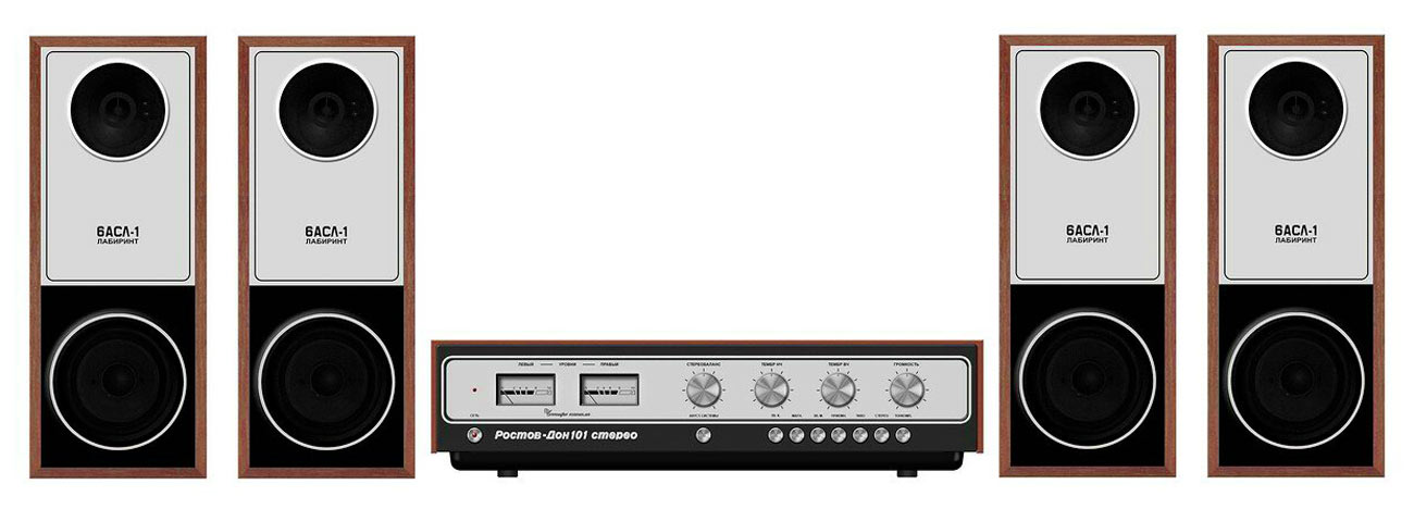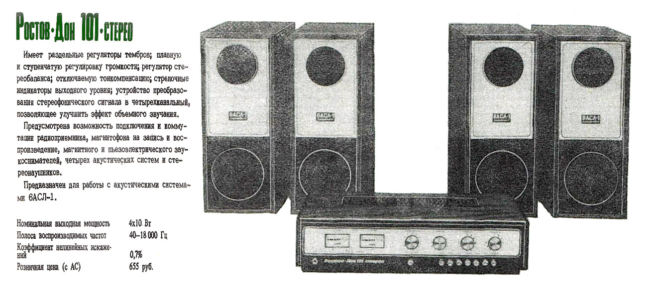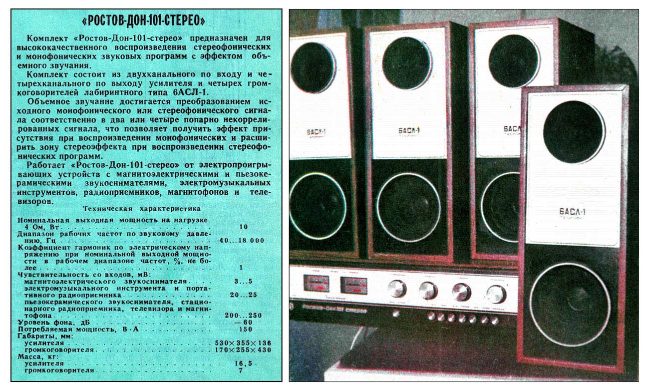 Система объемного звучания *Ростов-Дон-101-стерео* с марта 1976 года выпускал Ростовский завод *Электроаппарат*. Система состоит из УКУ и 4-х двухполосных лабиринтных громкоговорителей 6АСЛ-1. Она обеспечивает прослушивание моно-программ с эффектом объемного звучания и стереопрограмм с расширенным стереоэффектом. Источниками звукового сигнала могут быть магнитофон, электропроигрыватель или тюнер. Характеристики усилителя Ростов-Дон-101-стерео. Рабочий диапазон частот 40...18000 Гц. Выходная мощность на нагрузке 4 Ом; номинальная 2х10, максимальная 2х15 Вт. Коэффициент гармоник 1 %. Относительный уровень помех со входа керамического звукоснимателя и магнитофона -60 дБ, магнитного звукоснимателя и тюнера -50 дБ. Чувствительность со входа: звукоснимателя и магнитофона 200...250 мВ, магнитного звукоснимателя 3...5 мВ, тюнера 25 мВ. Пределы регулировки тембра на частотах 63 Гц и 16 кГц - ±10 дБ. Потребляемая мощность 150 Вт. Габариты 530х355х136 мм. Масса 16,5 кг. Характеристики громкоговорителя 6ACЛ-1. Номинальная мощность 6 Вт. Диапазон рабочих звуковых частот - 63 ...18000 Гц. Входное сопротивление 4 0м. Среднее стандартное звуковое давление 0,1 Па. Суммарный коэффициент гармоник 3 %. Габариты одной АС -170х285х430 мм. Вес 7 кг.