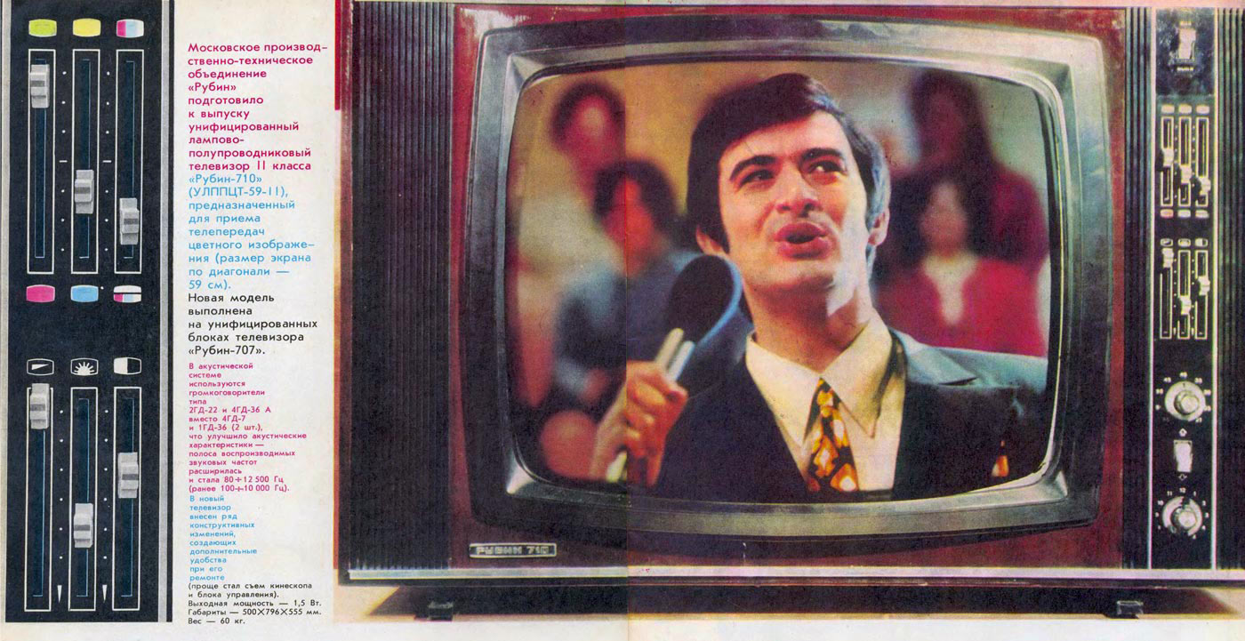 Телевизионный приёмник цветного изображения *Рубин-710/Д* с 1972 года выпускало МПТО *Рубин*, Москва. Совершенная технология производства позволила создать один из лучших Советских телевизоров 70-х годов **Рубин-710**. Телевизор предназначен для приёма цветных и ч/б передач на любом канале в МВ, а телевизор с индексом **Д** и в ДМВ диапазоне. Управление телевизором осуществляется регуляторами ползункового типа справа, на передней фальш-панели. Такие регуляторы создают удобства при пользовании телевизором и улучшают его эстетические показатели. В модели имеются автоматические регулировки, обеспечивающие качественное изображение и кристально чистое звуковое сопровождение, а также отключение блока цветности (для уменьшения цветовых помех) при приёме чёрно-белого изображения. Телевизор оформлен в деревянном футляре, облицованном ценными породами дерева с глянцевым покрытием. Телевизор выпускался в настольном исполнении. В нём применено 11 радиоламп, 42 транзистора и 58 диодов. Имеется возможность для подключения магнитофона на запись звукового сопровождения программ, прослушивания звука на головные телефоны при отключенной АС модели. Высокая чувствительность, в сочетании с эффективно действующей АРУ позволяют вести устойчивый приём программ с наружной антенной на значительном удалении от телецентра. Телевизор выполнен на унифицированных блоках от модели **Рубин-707**, отличаясь использованием ползунковых потенциометров и новых громкоговорителей 2ГД-22 и 4ГД-36А. Чувствительность в диапазоне МВ - 50 мкВ, в диапазоне ДМВ - 200 мкВ. Номинальная выходная мощность 1,5 Вт. Диапазон воспроизводимых звуковых частот 80...12500 Гц. Потребляемая мощность 270 Вт. Габариты телевизора 500 х 796 х 555 мм. Масса 60 кг. Цена 650 рублей.