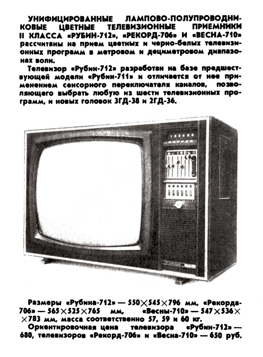 Унифицированный телевизор цветного изображения *Рубин-712* разработан и выпущен небольшой партией Московским ПО *Рубин* с осени 1975 года. Телевизор создан на базе модели *Рубин-711* и отличается от него сенсорным переключателем каналов, позволяющего нажатием пальца выбрать одну из 6-ти заранее выбранных и настроенных программ из общих 12 каналов, а также применением динамических громкоговорителей типа ЗГД-38 и 2ГД-36. Размеры телевизора 550 х 145 х 796 мм. Масса 57 кг. Розничная цена 680 рублей.