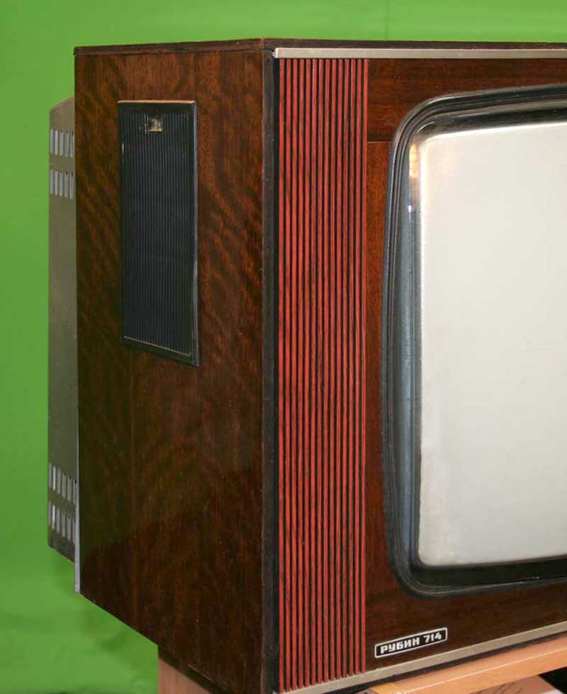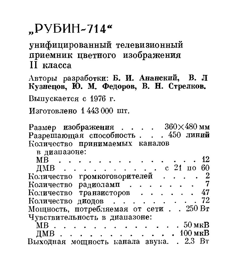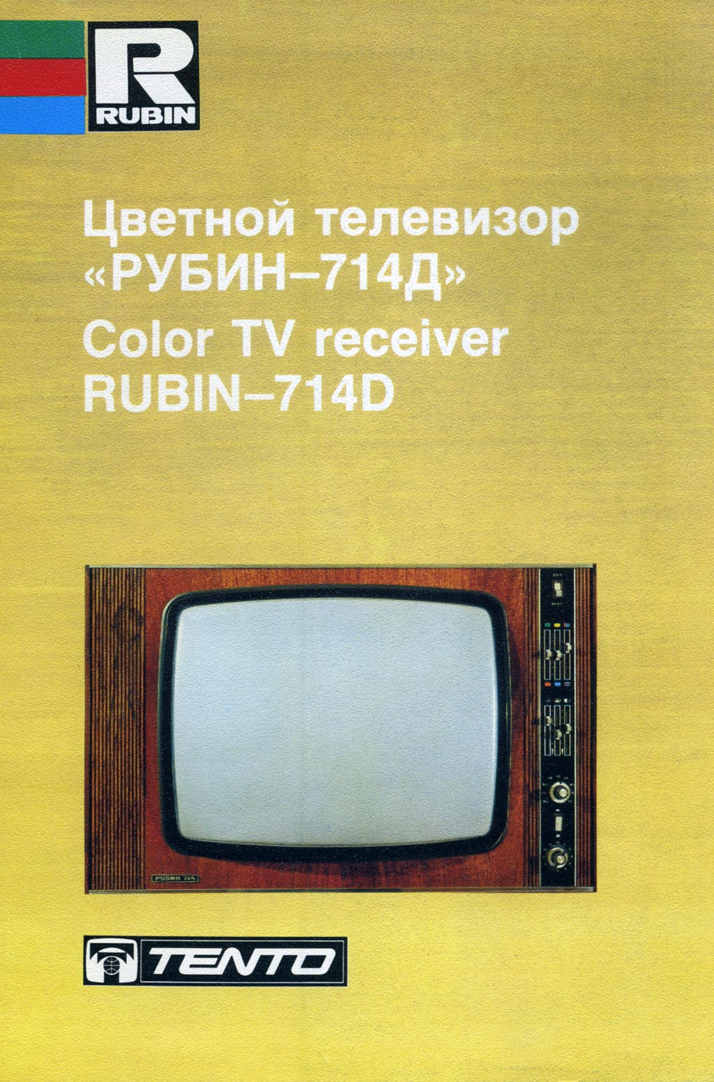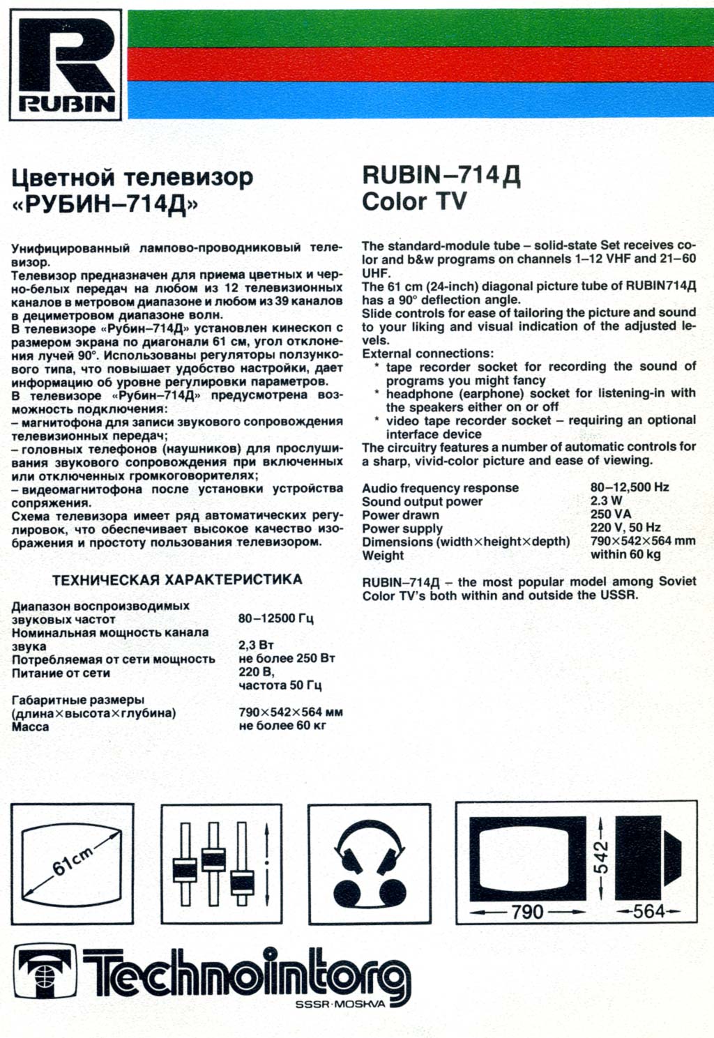 Телевизионный приёмник цветного изображения *Рубин-714/Д* с 1976 года выпускало Московское ПО *Рубин*. Телевизор **Рубин-714/Д** стал долгожителем на конвейере. Выпуск был начат 10 января 1976 года, а законен 31 декабря 1985 года. *Рубин-714/Д* (УЛПЦТ-61II-11/10) унифицированный лампово-полупроводниковый телевизор для приёма телевизионных программ в цветном и ч/б изображении на любом из каналов в диапазонах МВ, а с индексом **Д** и в ДМВ. Размер изображения 362 х4 82 мм. Чувствительность в МВ диапазоне 50 мкВ, ДМВ 100 мкВ. Номинальная выходная мощность 2,3 Вт. Диапазон частот воспроизводимых АС, состоящей из 2-х разно-полосных громкоговорителей 80...12500 Гц. Разрешающая способность 450 линий. Потребляемая мощность 250 Вт. Габариты ТВ - 550 х 545 х 796 мм, масса 60 кг. Цена 680 или 715 рублей с индексом. Разработчики модели: Б.И.Ананский, В.Л.Кузнецов, Ю.М.Фёдоров, В.Н.Стрелков. Произведено 1 миллион 443 тысячи телевизоров, в том числе в экспортном варианте (всегда с индексом *Д*) 172 тысячи телевизоров.