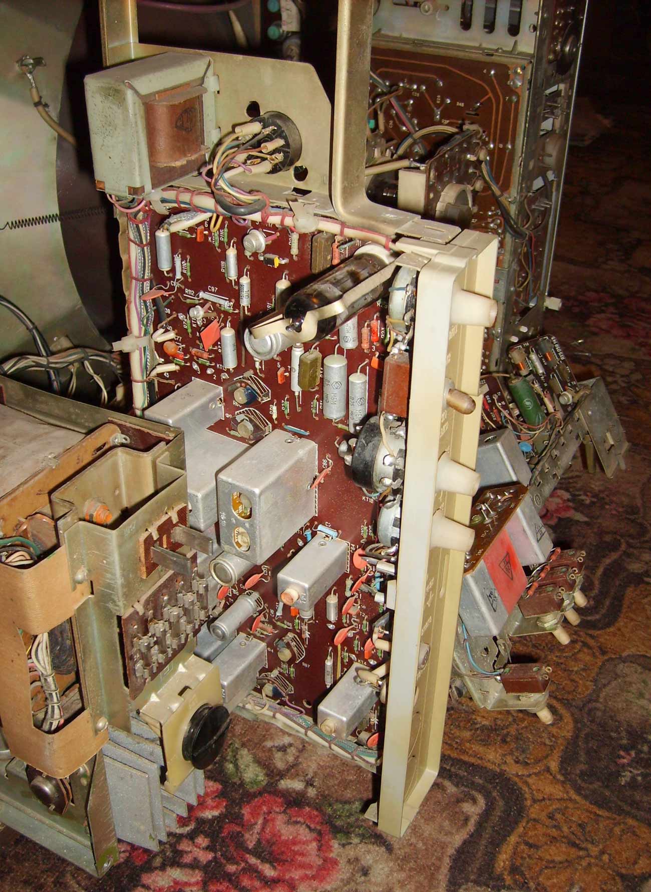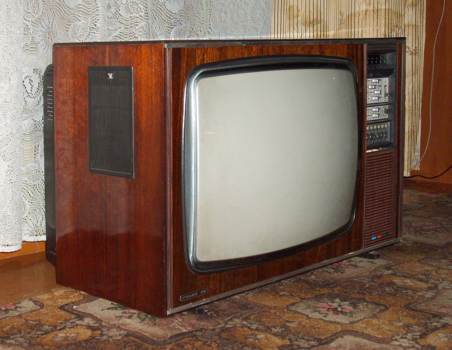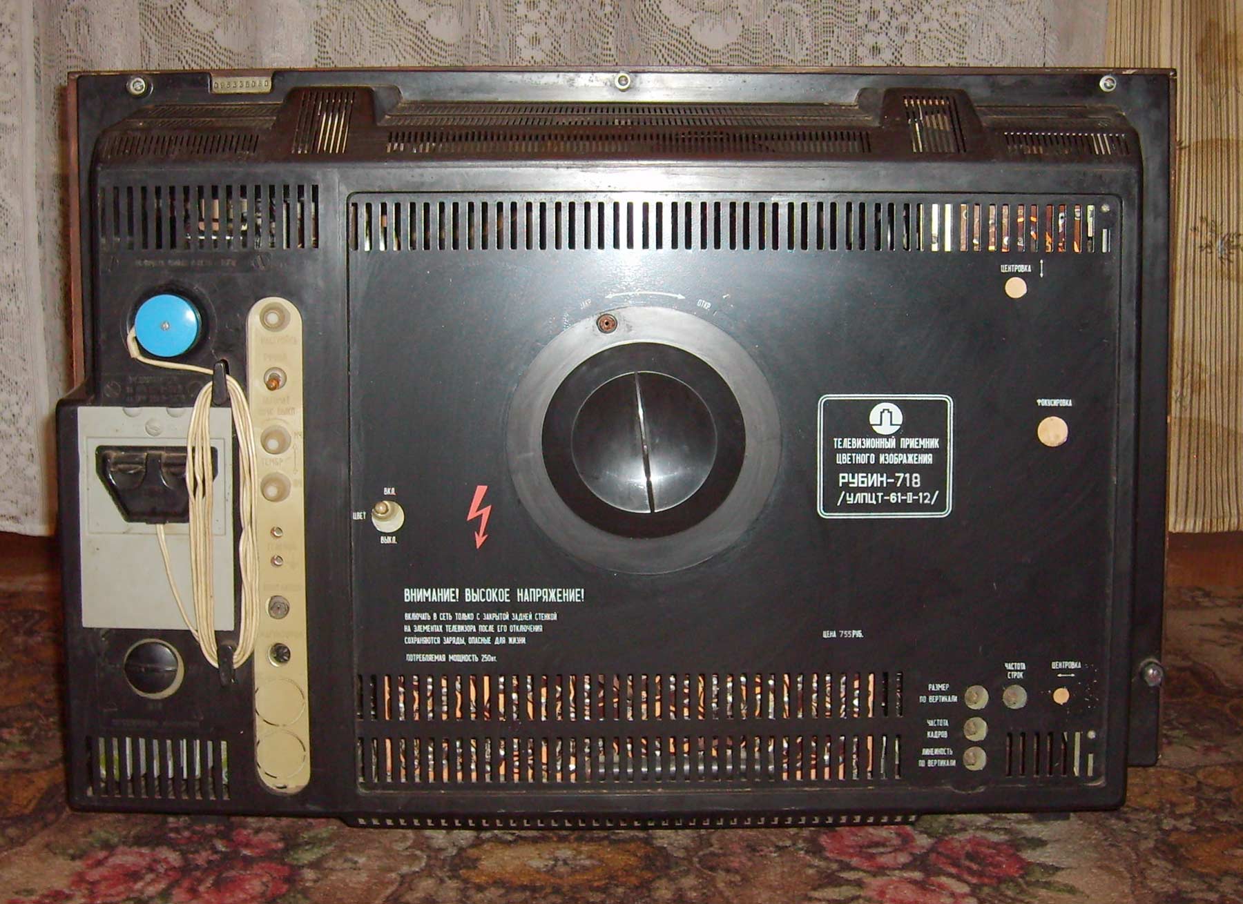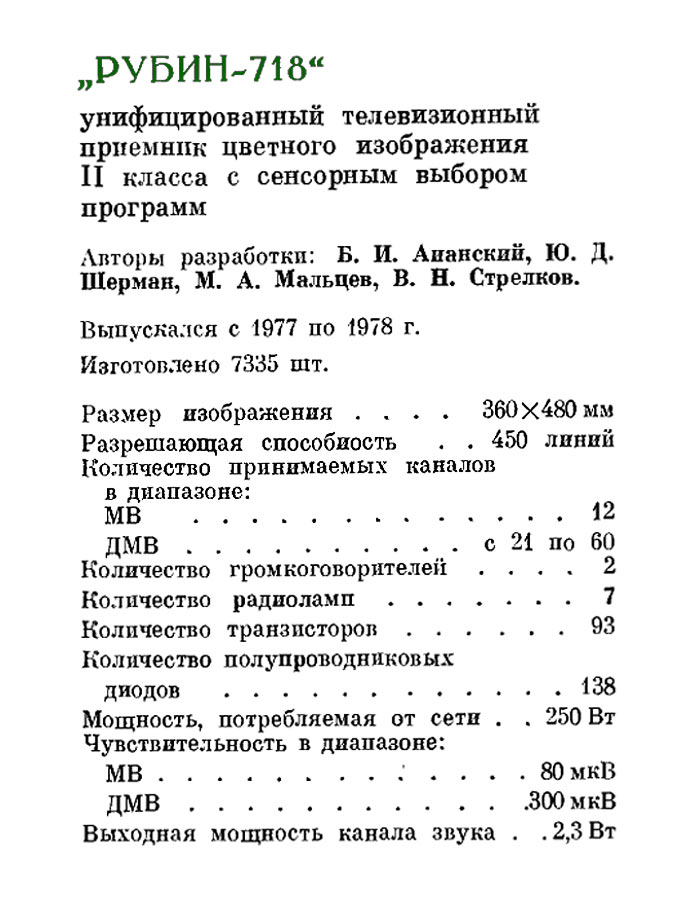 Цветной телевизионный приёмник *Рубин-718* с 1977 года выпускало Московское ПО *Рубин*. Цветной унифицированный лампово-полупроводниковый телевизионный приёмник второго класса **Рубин-718** представляет собой модернизацию телевизора **Рубин-712** и отличается сенсорным переключением программ и применением кинескопа 61ЛКЗЦ, вместо 59ЛКЗЦ. Размер изображения 362x480 мм. Разрешающая способность 450 линий. Количество принимаемых каналов в диапазоне MB - 12, ДМВ - 39. Потребляемая мощность 250 Вт. Чувствительность модели в диапазоне MB - 80 мкВ, ДМВ - 300 мкВ. Выходная мощность канала звука 2,3 Вт. Масса телевизора 65 кг.
