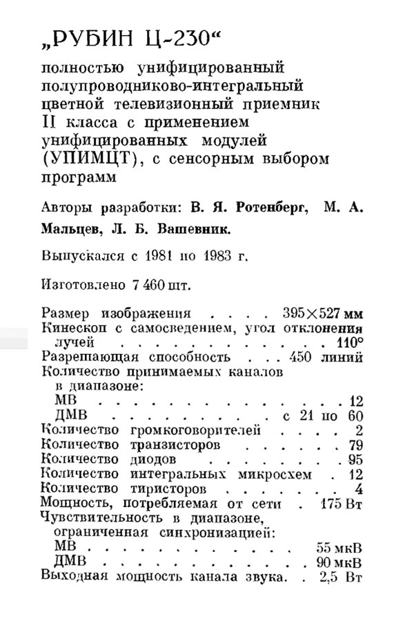 Телевизионный приёмник цветного изображения *Рубин Ц-230* с 1981 года выпускало Московское МПО *Рубин*. Унифицированный полупроводниково-интегральный цветной телевизор 2-го класса с применением унифицированных модулей *Рубин Ц-230* тип УПИМЦТ-67 работает в диапазонах МВ и ДМВ. Выбор любой из шести заранее настроенных программ сенсорный. Размер изображения 395 х 527 мм. Разрешающая способность 450 линий. Питание - сеть переменного тока 168...242 В. Потребляемая мощность 175 Вт. Чувствительность в МВ диапазоне - 50 мкВ, в ДМВ диапазоне - 90 мкВ. Номинальная выходная мощность канала звука 2,5 Вт. Диапазон воспроизводимых частот 100...10000 Гц. Габариты ТВ 790 х 510 х 470 мм. Масса 54 кг.