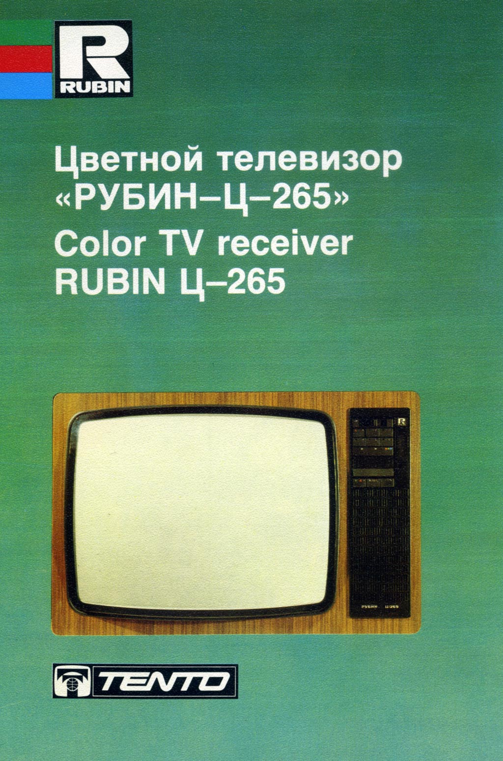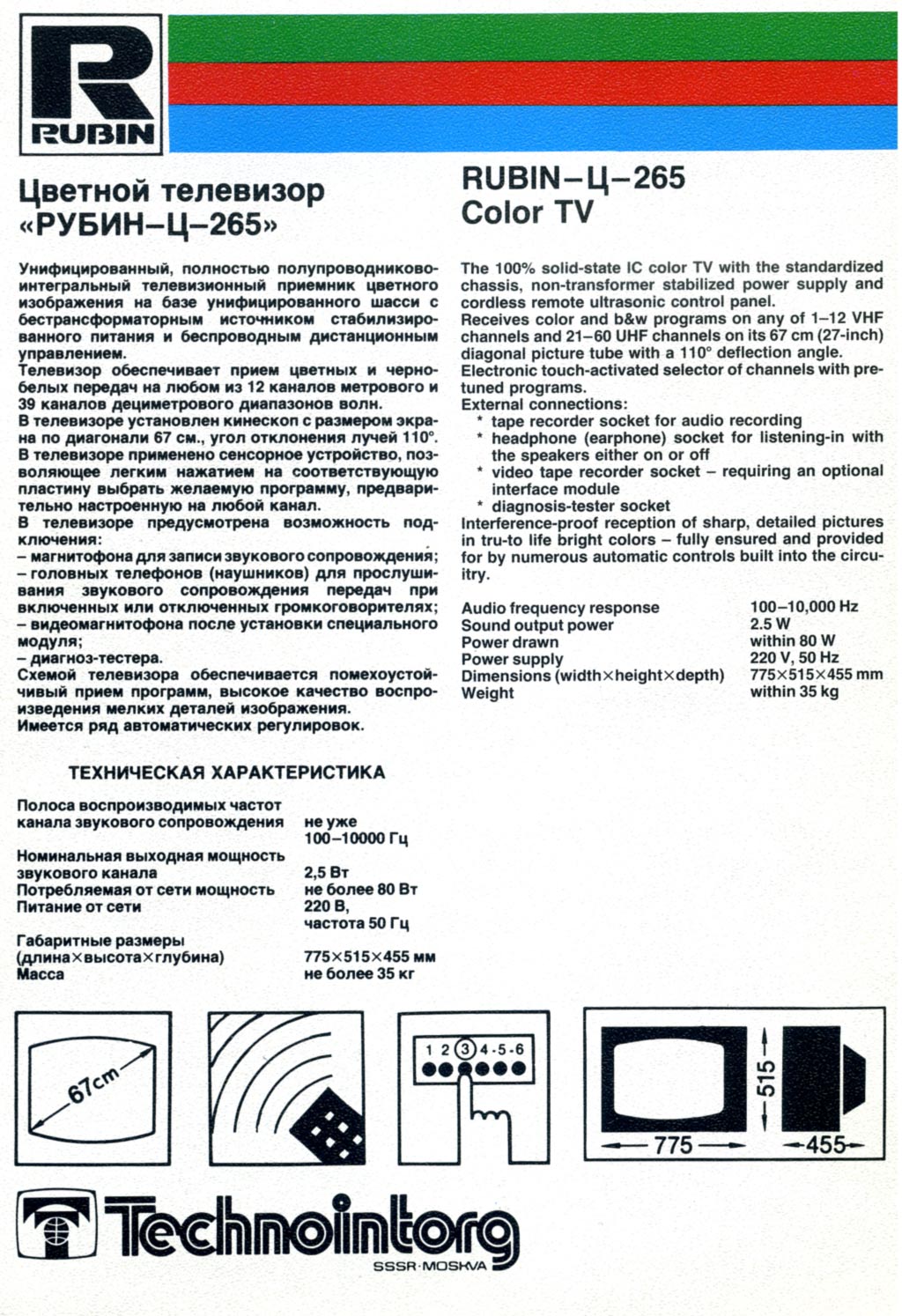 Цветной телевизор *Рубин Ц-265* подготовлен к выпуску с 1984 года Московским ПО *Рубин*. Унифицированный полупроводниково-интегральный цветной телевизор с экраном 67 см. по диагонали. Конструкция блочно модульная. Работает в диапазонах МВ и ДМВ. Сенсорный выбор одной из шести заранее настроенных программ. Чувствительность в МВ диапазоне 55 мкВ, ДМВ 90 мкВ. Полоса воспроизводимых звуковых частот - 100...10000 Гц. Номинальная выходная мощность канала звука 2,5 Вт. Потребляемыя от электрической сети мощность 80 Вт. Габариты модели 775х515х455 мм. Масса 35 кг.