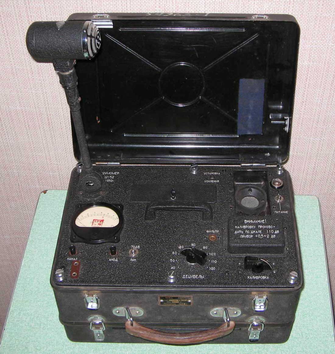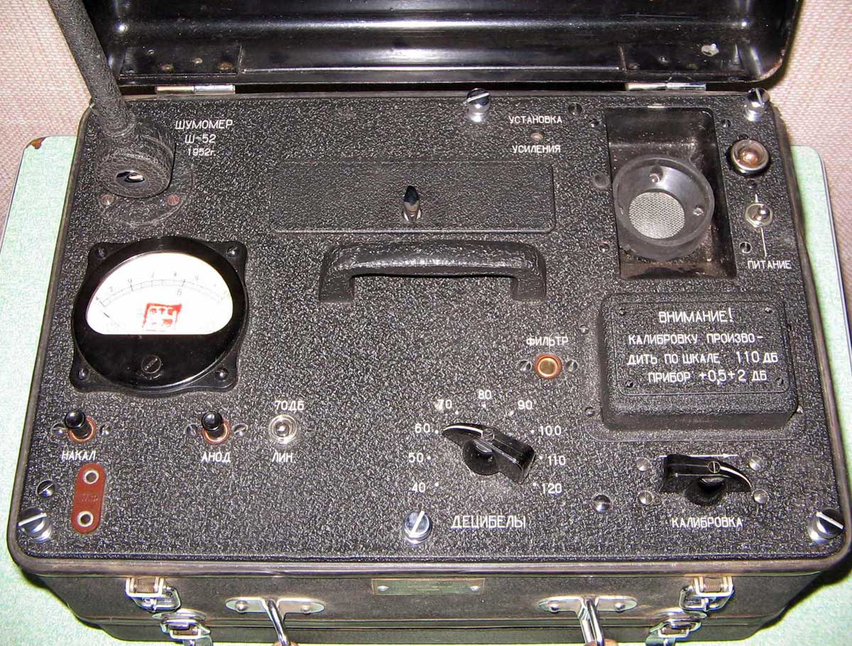 Шумомер *Ш-52* выпускался с 1952 года. Для измерения всевозможных шумовых характеристик применяют шумомеры. Шумомер *Ш-52* представляет автономный переносный прибор, позволяющий измерять в дБ уровни интенсивности звука в широких пределах. Он состоит из высококачественного микрофона, широкополосного усилителя, переключателя чувствительности, меняющего усиление ступенями по 10 дБ, переключателя частотных характеристик и стрелочного индикатора, шкала которого градуирована непосредственно в децибелах. На лицевой панели помимо основных органов управления имеются гнёзда, позволяющие подключить к схеме дополнительные устройства. Другой информации по прибору пока нет.
