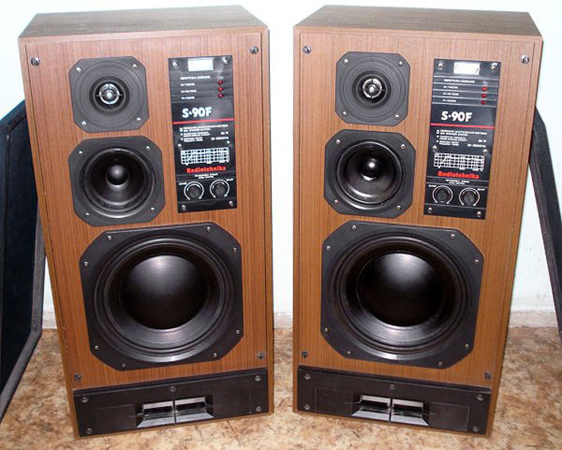 Трёхполосные акустические системы *S-90F* и *S-100F* выпускались с 1991 года Рижским радиозаводом им. А.С.Попова. АС предназначены для высококачественного воспроизведения звука в составе бытовой радиоэлектронной аппаратуры. В АС применены динамические головки прямого излучения: ВЧ 6ГДВ-6-25, НЧ 75ГДН-1-8. АС *S-90F* содержат среднечастотную головку 20ГДС-1-16, а *S-100F* - 30ГДС-3 с магнитной жидкостью MAXID, которая позволяет повысить мощность АС до 100 Вт. В АС имеются два плавных регулятора уровня воспроизведения для СЧ и ВЧ. Пределы регулировки от 0 до -6 дБ в диапазонах 500...5000 Гц и 5...20 кГц. В положении *-6 дБ* сигнал ослаблен в 2 раза. В АС имеется светодиодная индикация перегрузок громкоговорителей. Основные технические характеристики: Паспортная мощность 90 и 100 Вт соответственно. Номинальная электрическая мощность 35 Вт. Номинальное электрическое сопротивление 8 Ом. Диапазон воспроизводимых частот - 25...25000 Гц. Характеристическая чувствительность в диапазоне 100...8000 Гц при мощности 1 Вт не менее 89 дБ. Габаритные размеры любой АС - 710х360х285 мм, масса - 23 кг.
