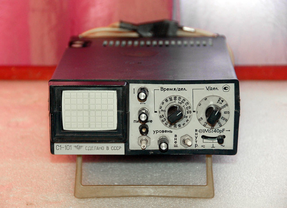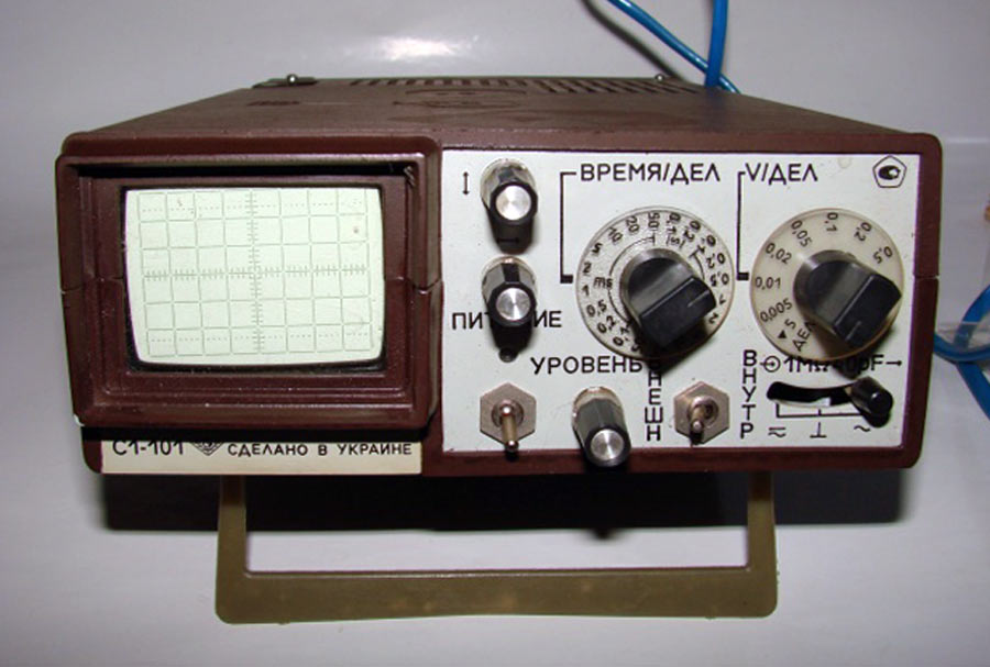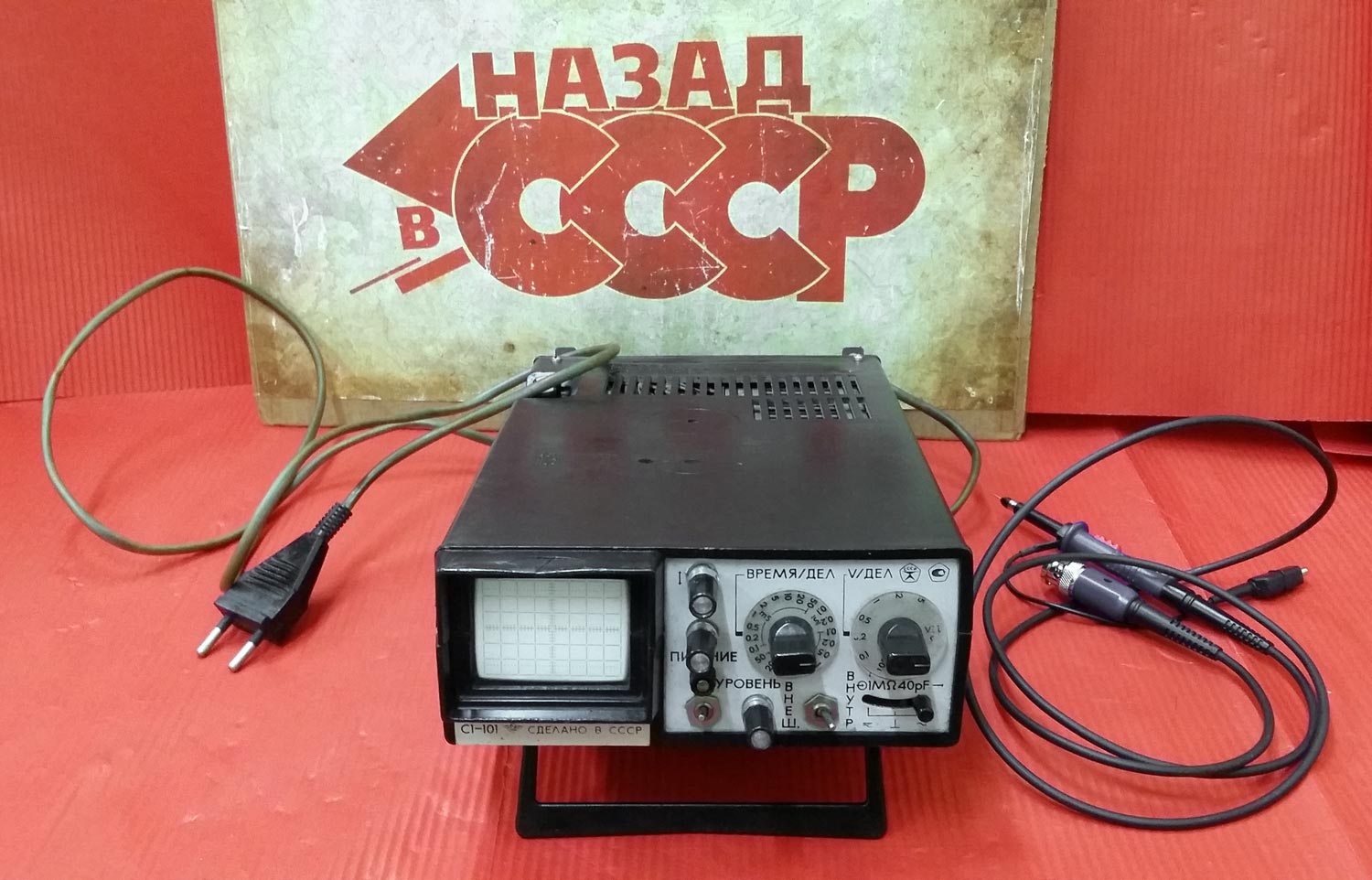 Миниатюрный универсальный осциллограф *С1-101* с 1987 года выпускало Львовское ПО им. Ленина и Екатеринбургское ООО *Белвар*. Прибор предназначен для исследования формы периодических электрических сигналов визуальным наблюдениям и измерениям амплитуд в диапазоне от 0,01 до 300 В и временных интервалов от 0,3* 10-6 с до 0,4 с. Диапазон: 0...5 МГц. Ширина луча ~ 0.6 мм. Размер экрана - 40x30 мм. Питание 220, 110, 27 и 12 вольт. Блок для питания осциллографа был как встренный внутрь, так и отдельный, вставляемый в специальную нишу прибора. Максимальное входное напряжение 300 В. Потребляемая мощность 18 Вт. Габариты прибора 281x155x69 мм. Вес 1.8 кг.